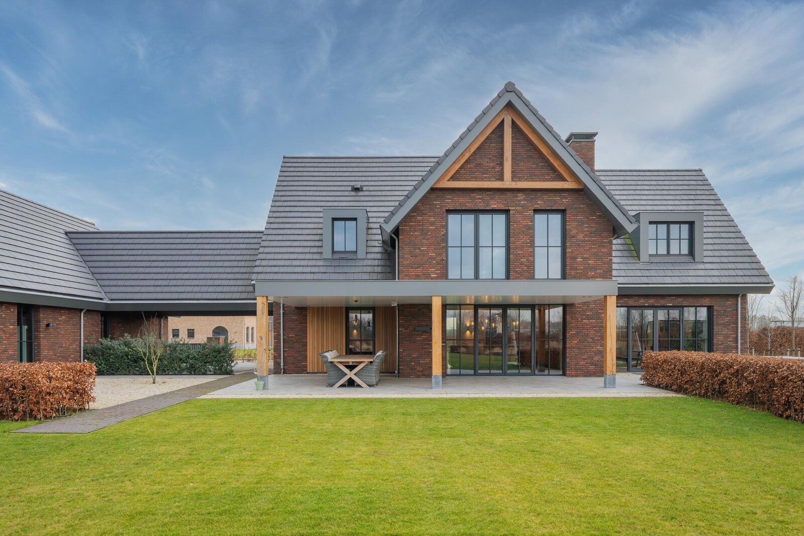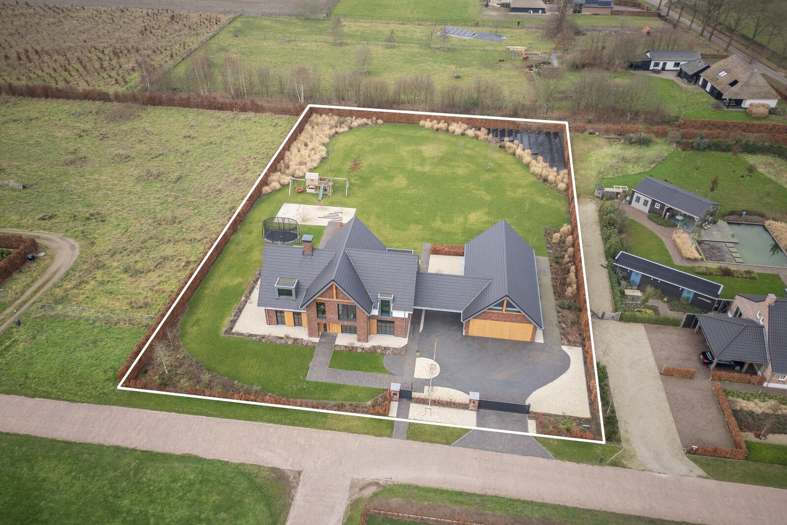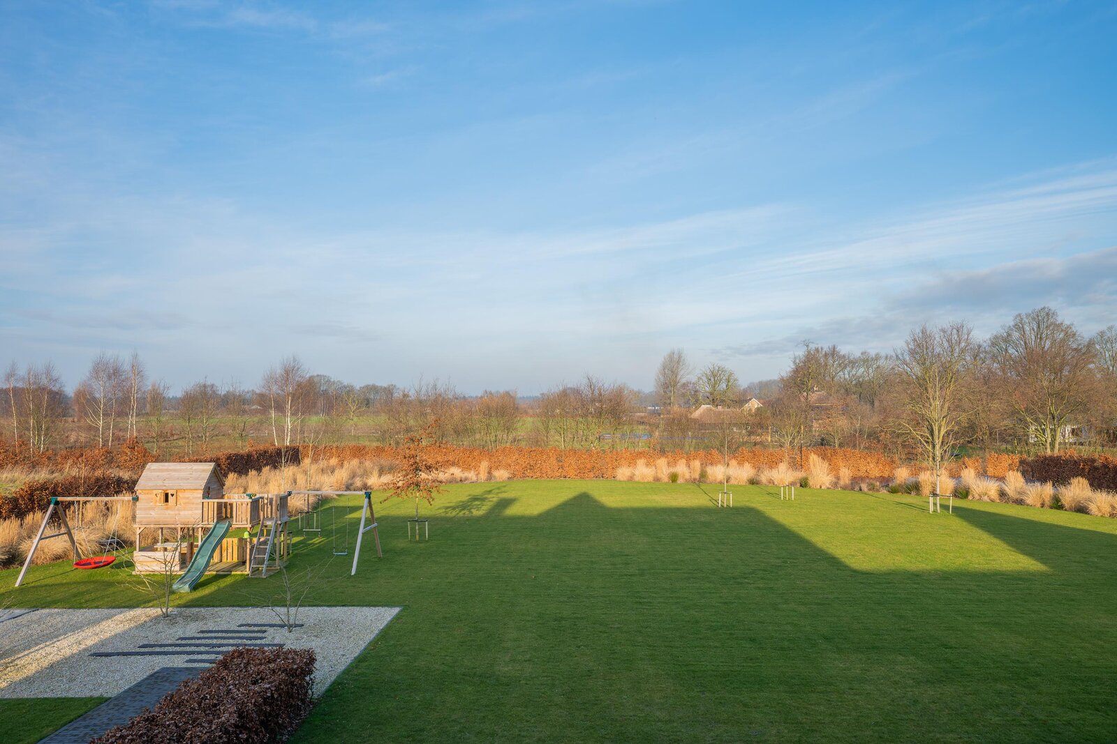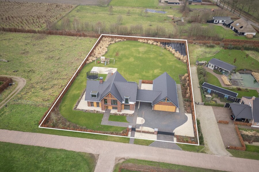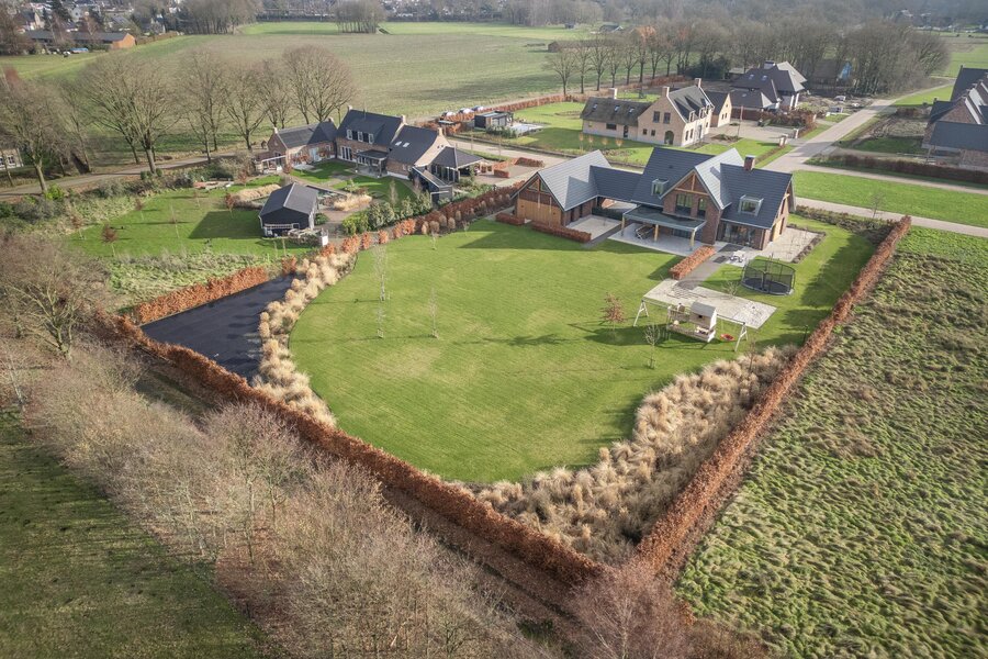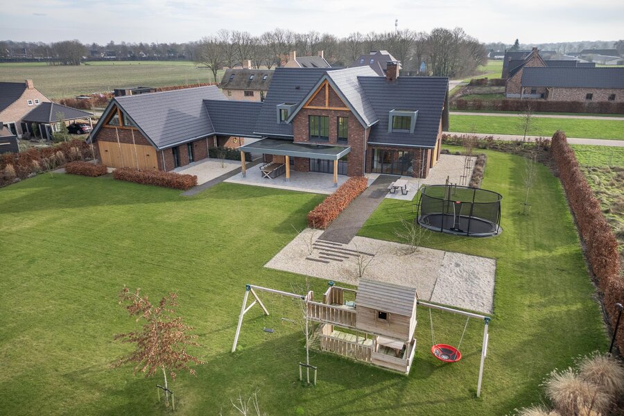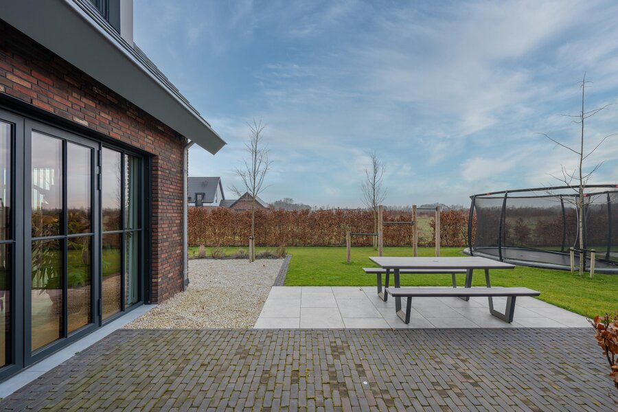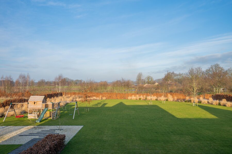 De magnifiek aangelegde tuin rondom is volwassen, groen en met zorg ingericht met beukenhagen, siergrassen en rijk bloeiende borders, die in het voorjaar en de zomer zorgen voor kleur en sfeer. Kinderen vermaken zich eindeloos in de achtertuin op het grote gazon met speeltoestellen en trampoline, terwijl jij vanaf het terras geniet van een kop koffie, ruimte en uitzicht op de omliggende natuur.