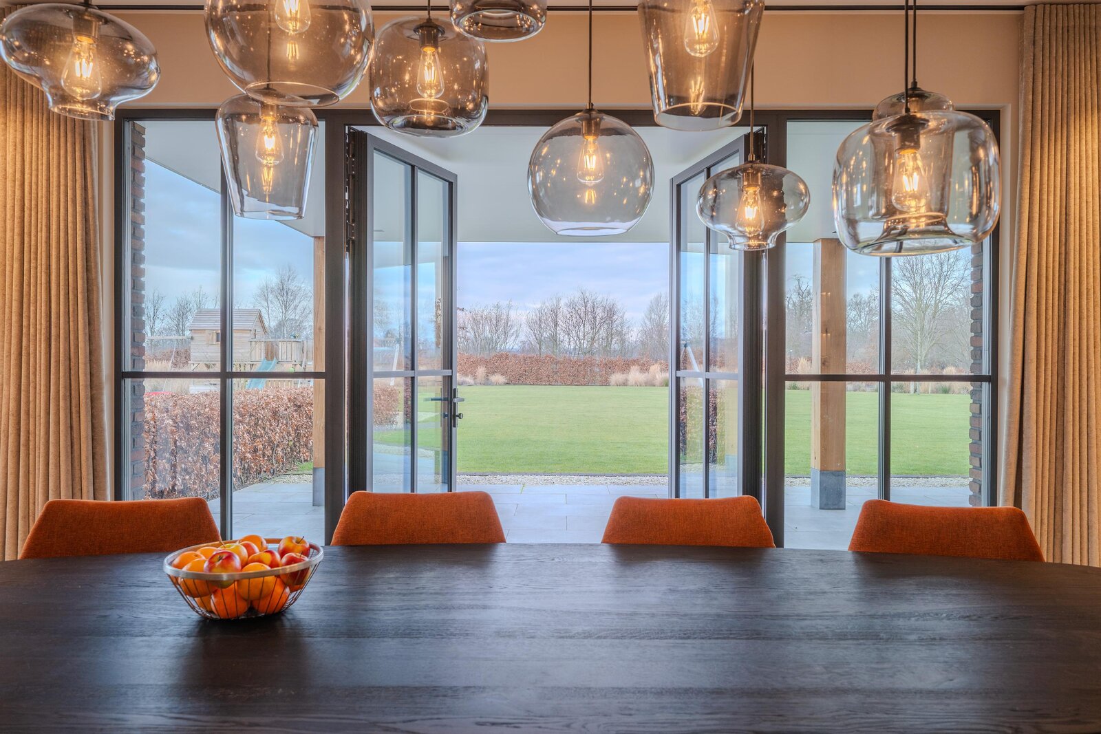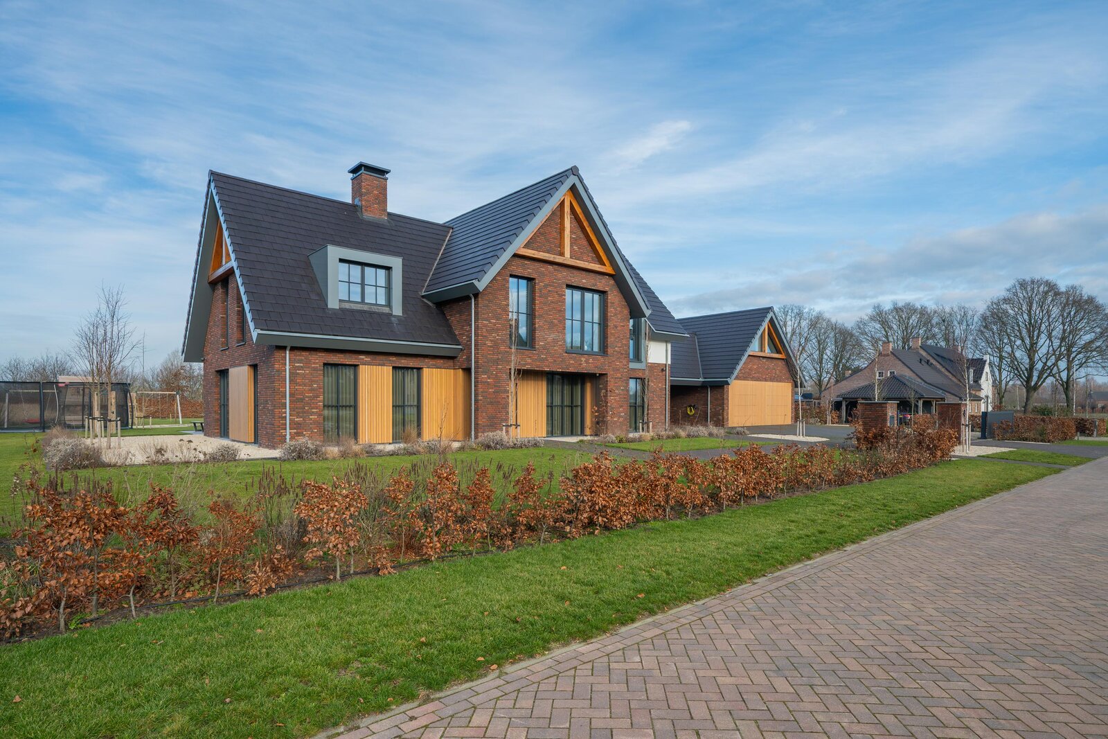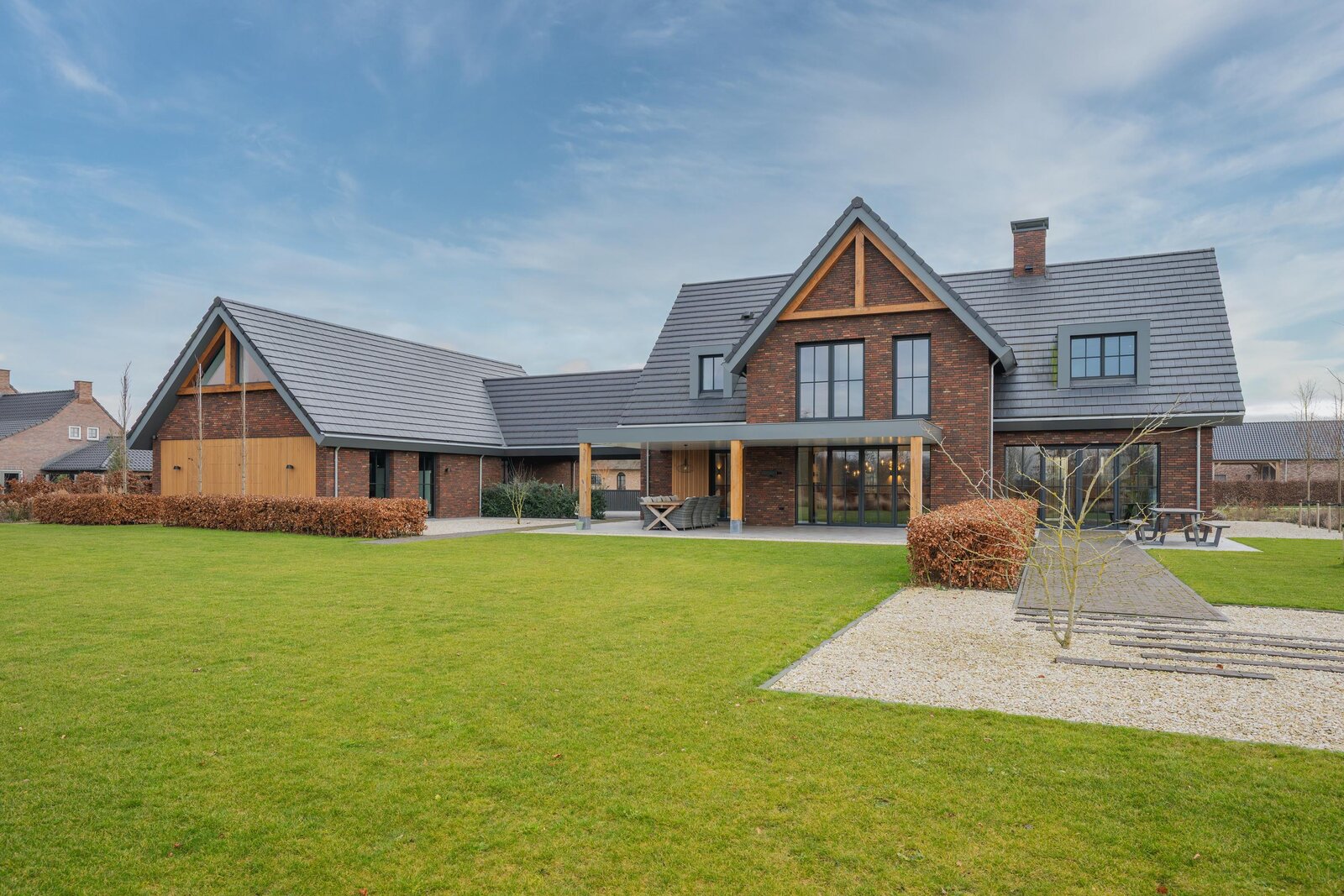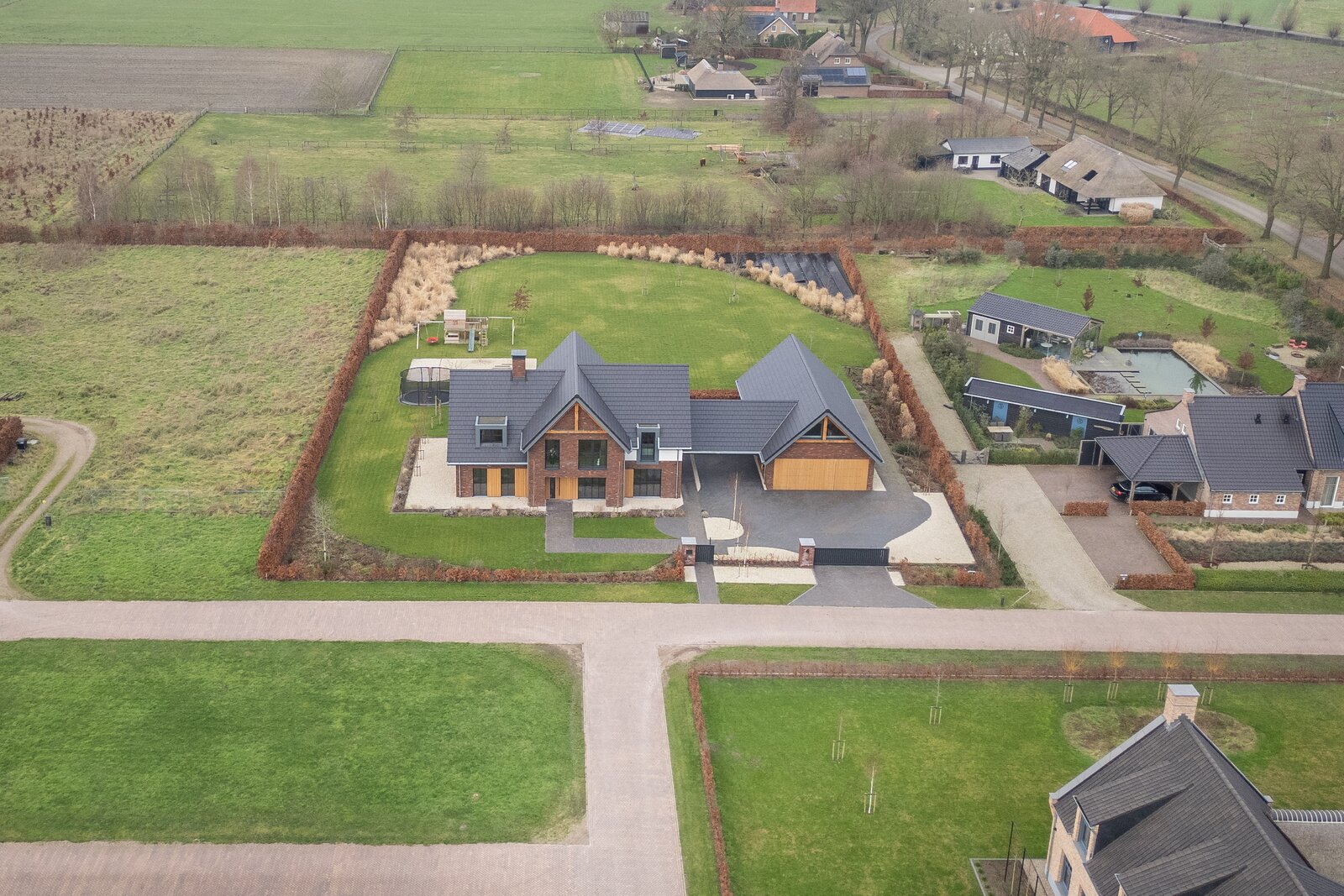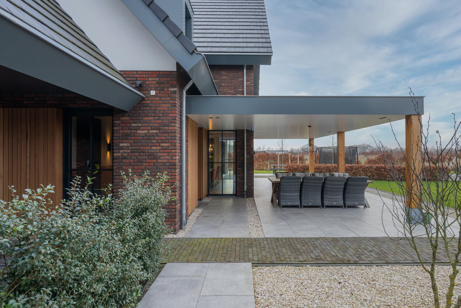 De magnifiek aangelegde tuin rondom is volwassen, groen en met zorg ingericht met beukenhagen, siergrassen en rijk bloeiende borders, die in het voorjaar en de zomer zorgen voor kleur en sfeer. Kinderen vermaken zich eindeloos in de achtertuin op het grote gazon met speeltoestellen en trampoline, terwijl jij vanaf het terras geniet van een kop koffie, ruimte en uitzicht op de omliggende natuur.