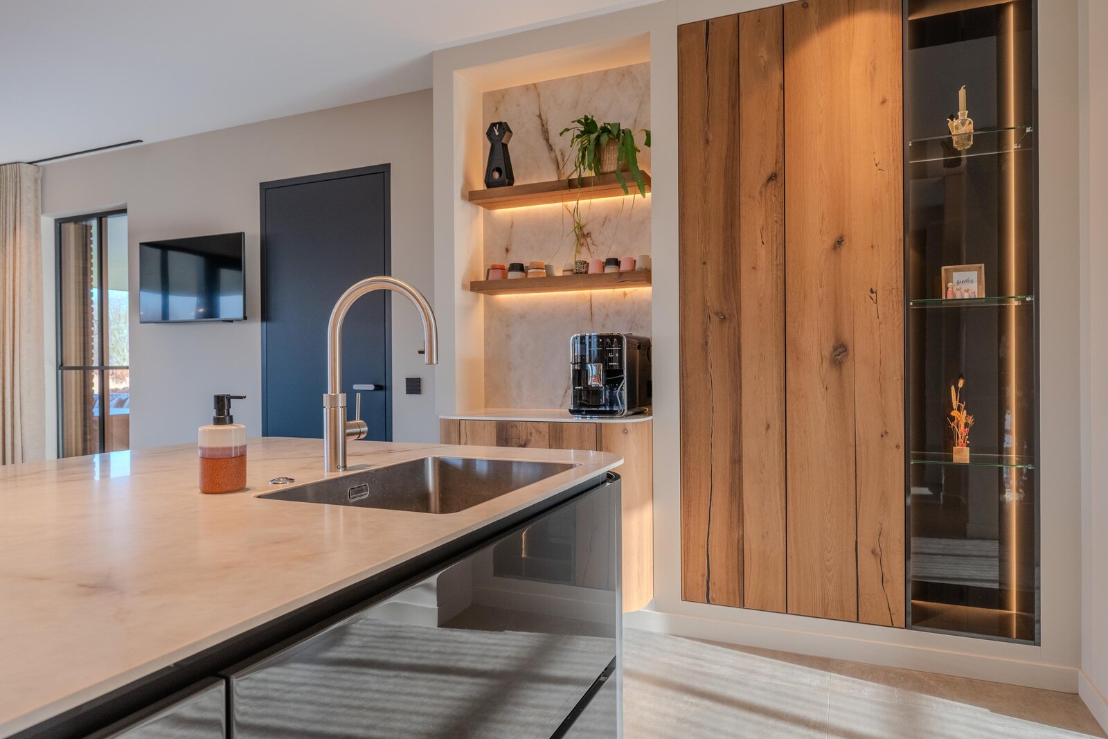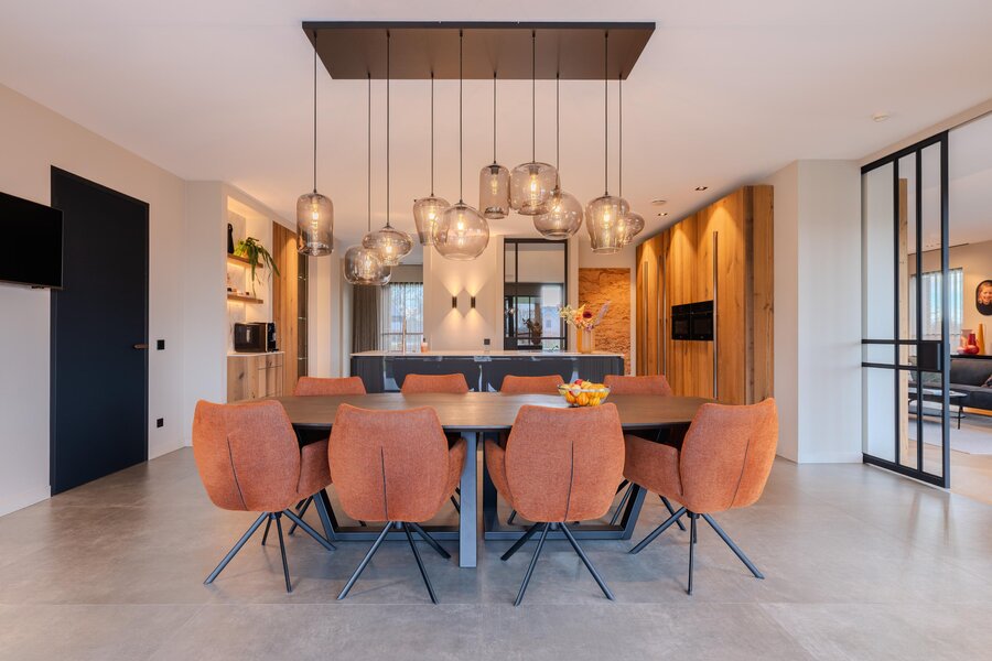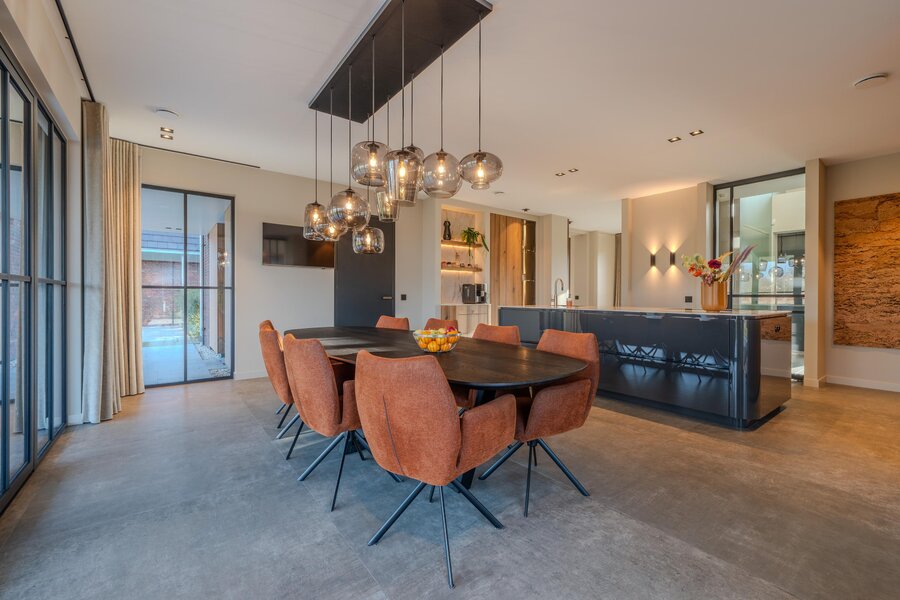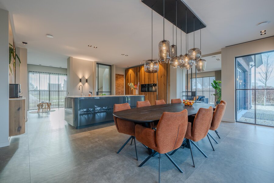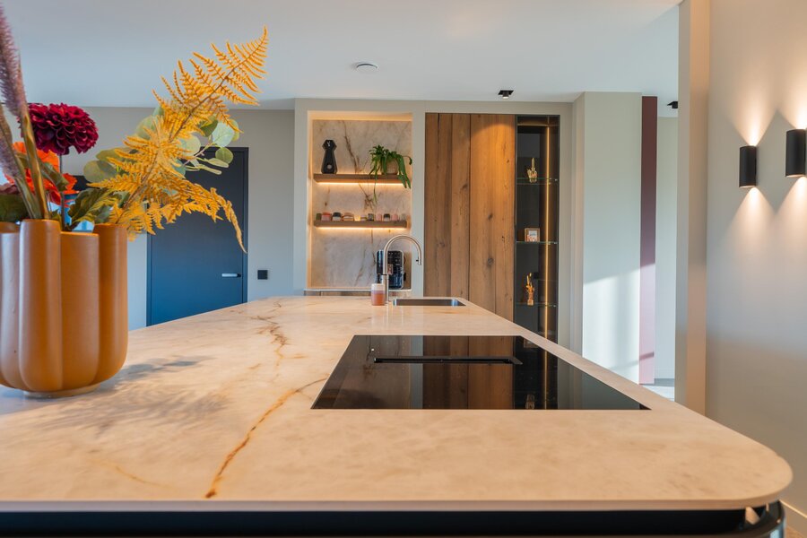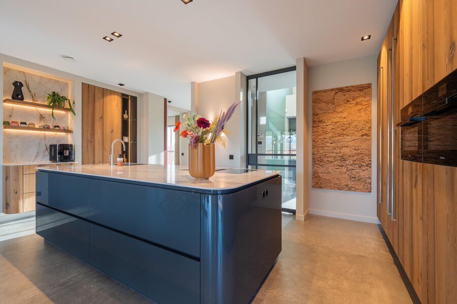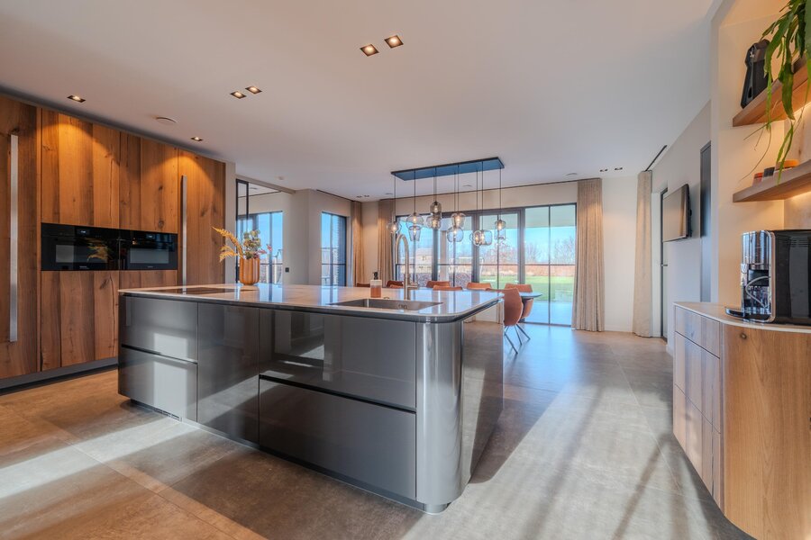 Het hart van deze exclusieve villa wordt gevormd door de prachtige, royale leefkeuken — dé plek waar het dagelijks leven samenkomt. Deze lichte keuken is volledig op maat gemaakt en ruim van opzet. Het grote kookeiland met keramisch blad en afgeronde hoeken, uitgevoerd in hoogglans grijs en gecombineerd met hout(fineer), geeft de ruimte een warme en eigentijdse uitstraling.