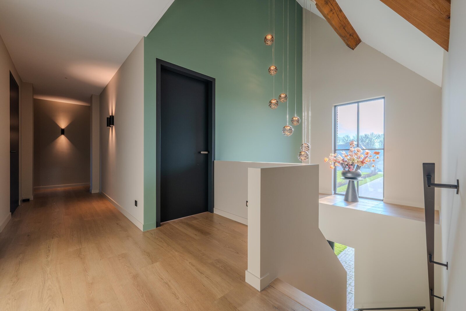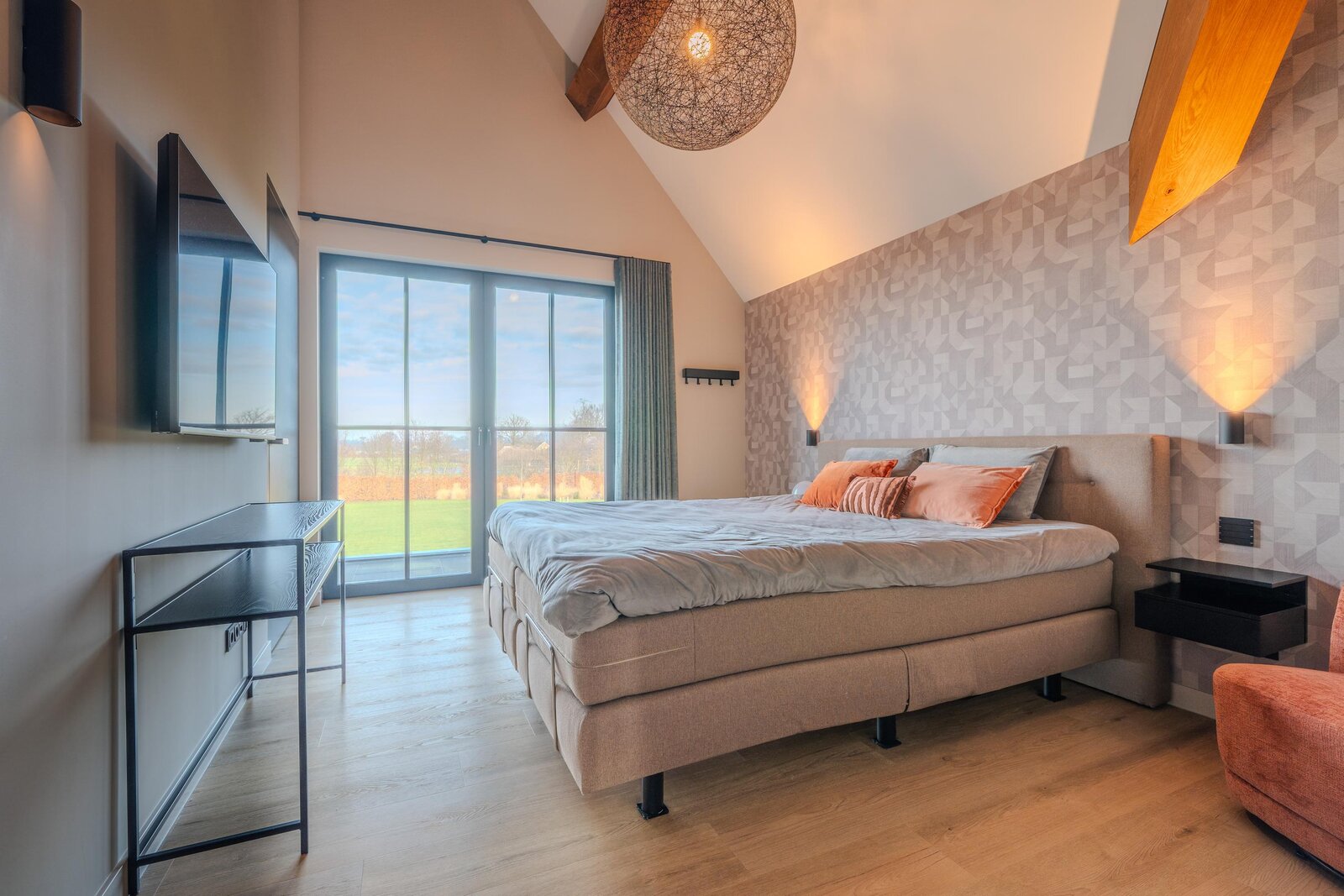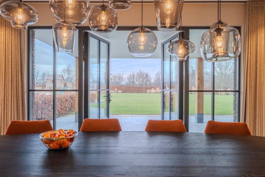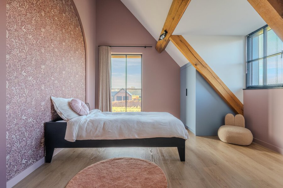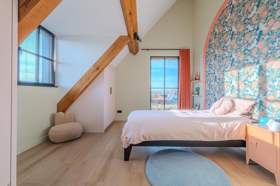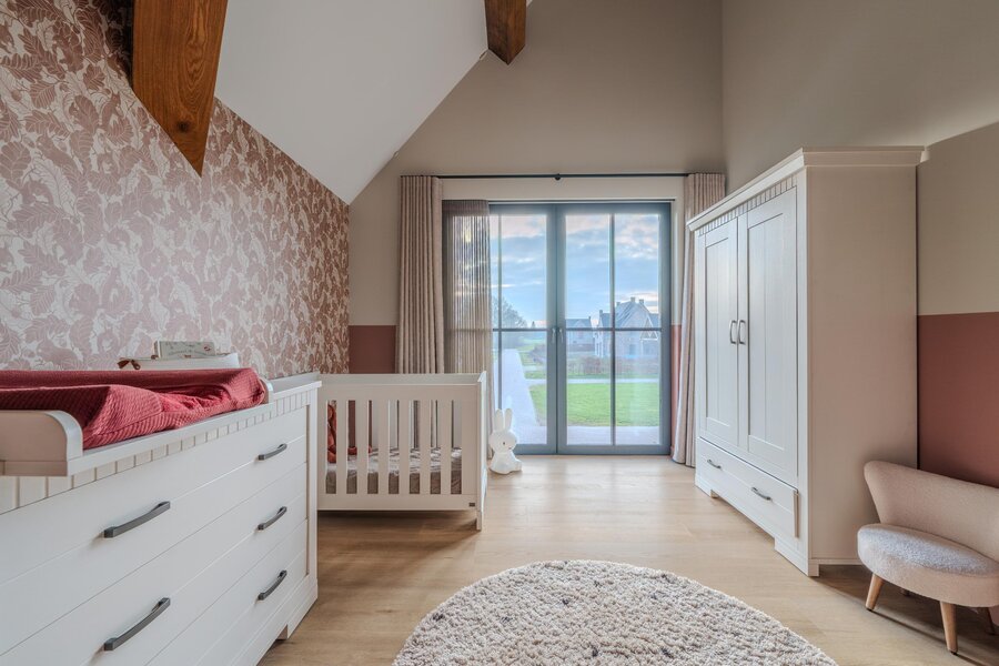 Op de eerste verdieping bevinden zich de riante ouderslaapkamer, drie comfortabele kinderslaapkamers, twee luxe badkamers en een separaat toilet. De hoge ruimtes met houten balken zorgen voor een warme en sfeervolle uitstraling. Juist deze combinatie maakt de villa zo bijzonder: modern en luxueus, met tegelijkertijd een subtiele landelijke charme. In het weekend extra lang uitslapen? Met één druk op de knop sluiten de screens en creëer je moeiteloos rust en privacy.