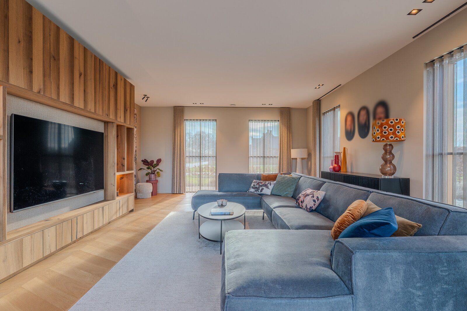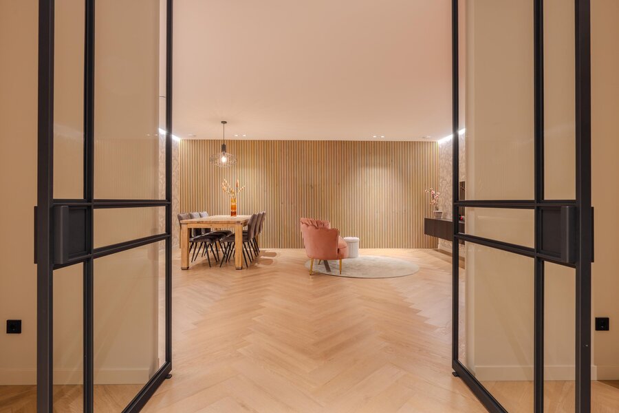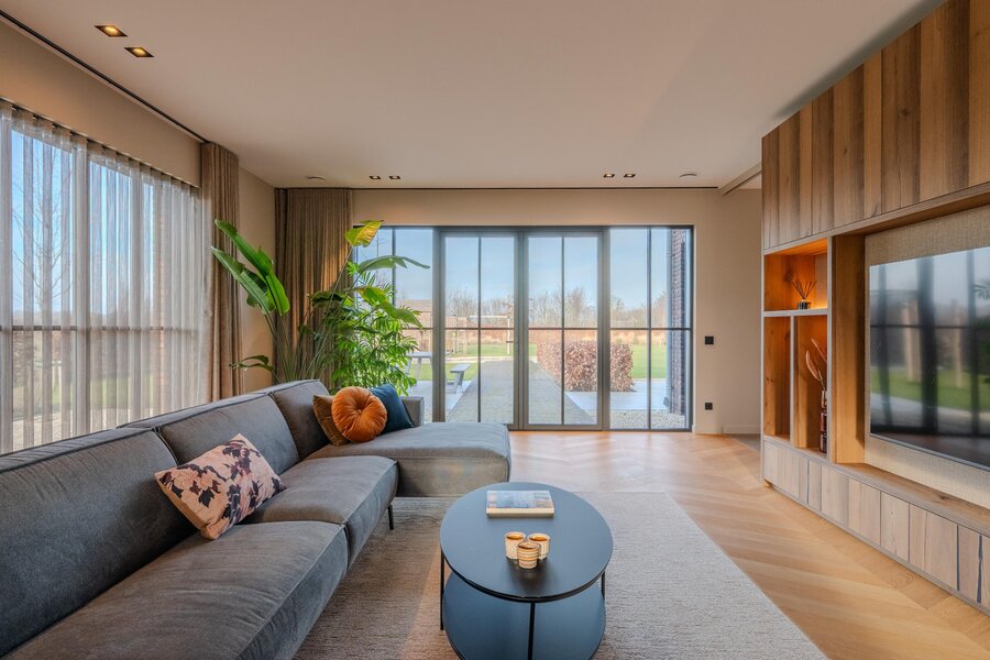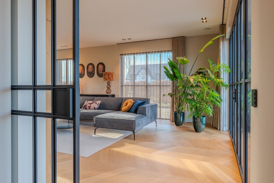 Je betreedt de grote leefkeuken, het hart van het huis. Aansluitend bevindt zich de woonkamer, die profiteert van optimale daglichttoetreding en is voorzien van een prachtig maatwerk tv-meubel. De ruimte voelt stijlvol en uitnodigend aan, met grote raampartijen en zicht op de omgeving. De harmonie tussen interieur en architectuur zorgt voor rust en balans. Neem plaats op de bank en geniet samen van een fijne filmavond. Met de glazen schuifdeur kan deze ruimte desgewenst worden afgesloten van de leefkeuken. De houten vloeren in moderne Hongaarse punt geven de gehele begane grond extra warmte en verfijning.
