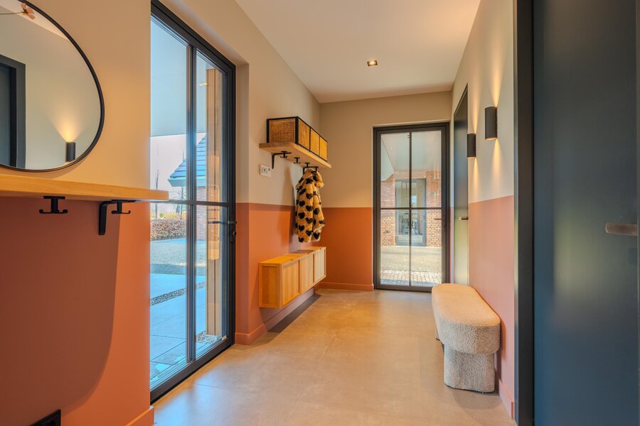 De entree maakt direct indruk. Een royale ontvangsthal met hoge vide zet de toon voor de rest van de villa, waar licht, ruimte en een warme, moderne uitstraling samenkomen. Vanuit deze centrale hal ontvouwen de leefruimtes zich op een natuurlijke en logische wijze.