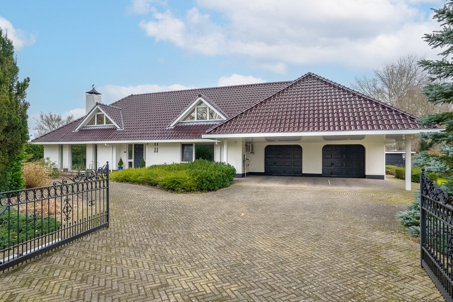 De woning beschikt over een dubbele inpandige garage met dubbele elektrische deuren, een dubbele carport én elektrisch bedienbare toegangspoorten. Parkeren kan hier ruimschoots op eigen terrein.