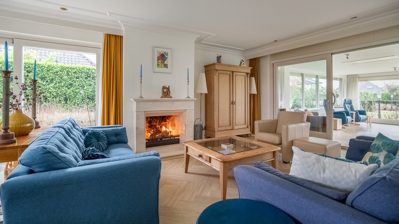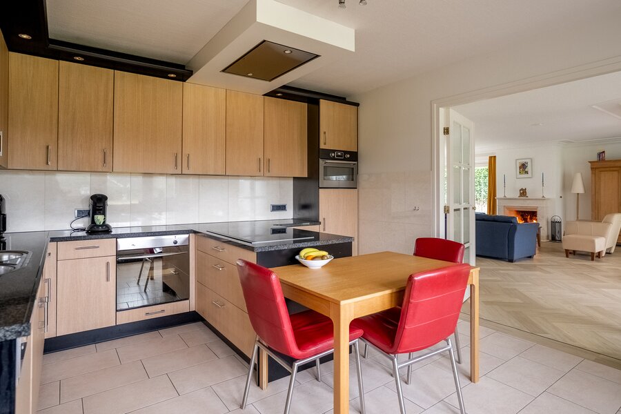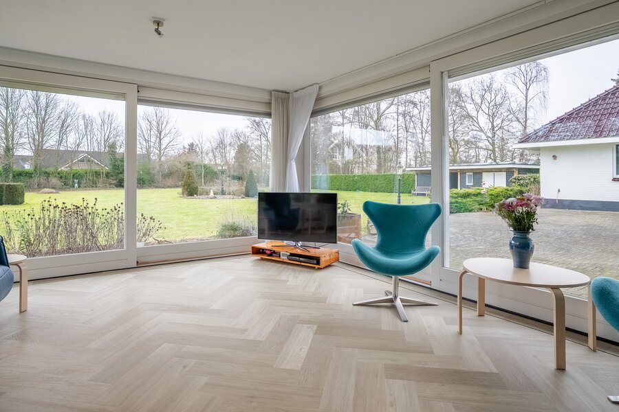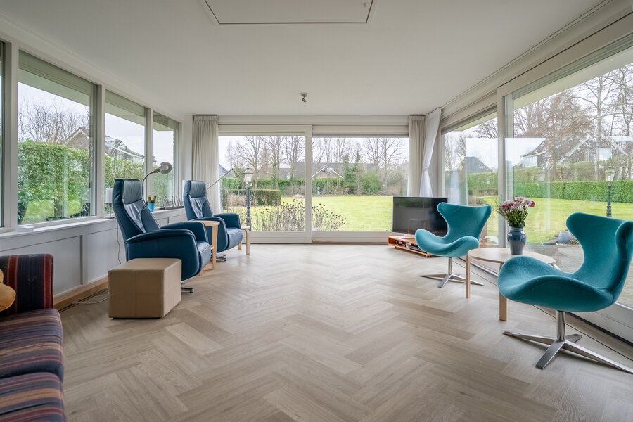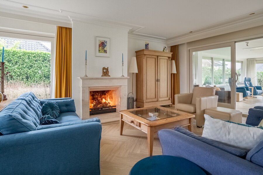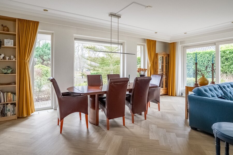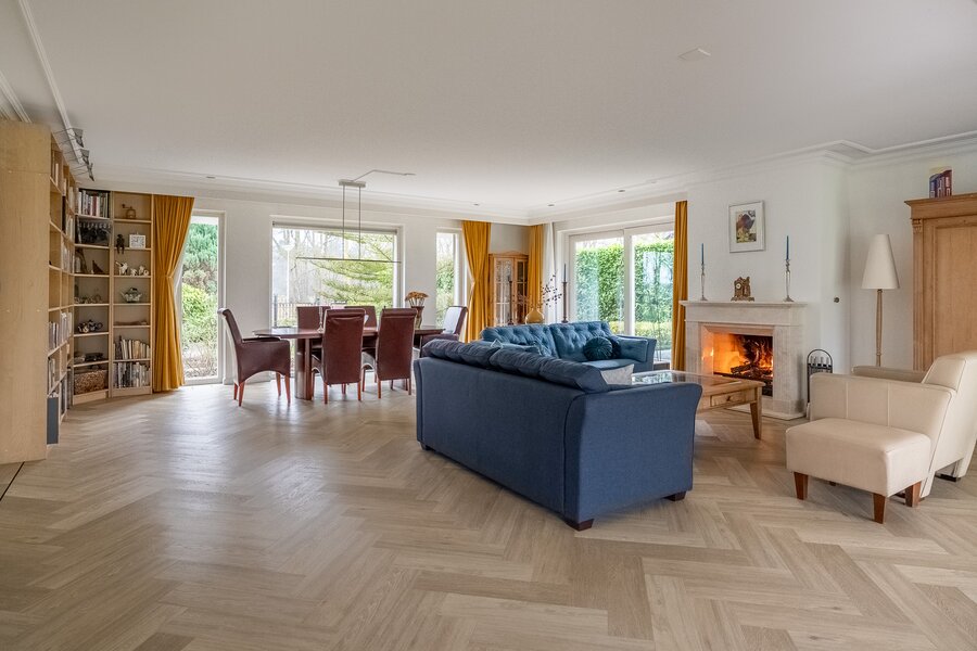De royale, lichte woonkamer is voorzien van een prachtige in visgraat gelegde pvc-vloer en een sfeervolle haard, wat zorgt voor een warme en stijlvolle uitstraling. Grote raampartijen bieden een prachtig uitzicht op de groene tuin en laten het daglicht rijkelijk binnenstromen. De aangrenzende tuinkamer vormt een heerlijke plek om het hele jaar door te genieten van het uitzicht over de fraai aangelegde achtertuin. Binnen en buiten lopen hier naadloos in elkaar over.