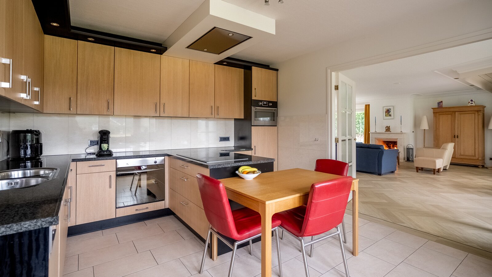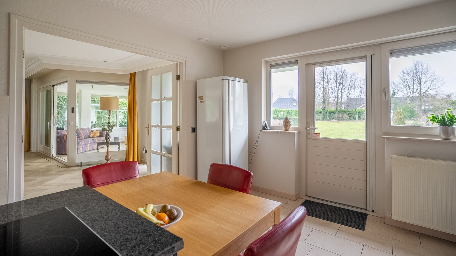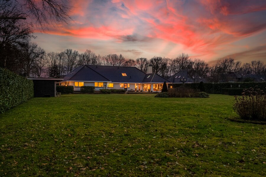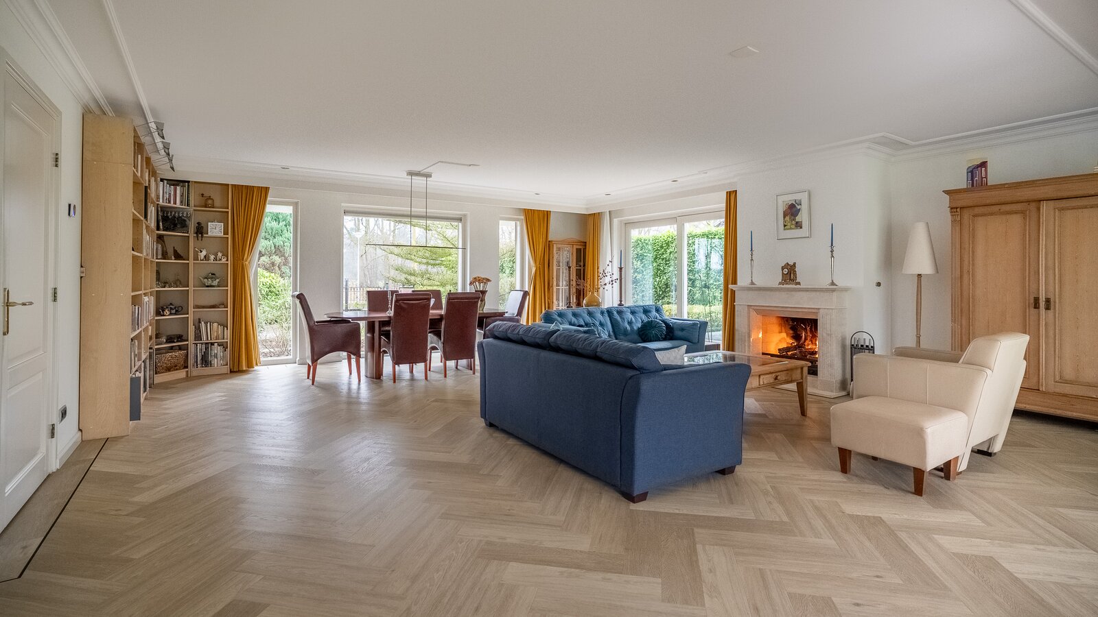 De royale, lichte woonkamer is voorzien van een prachtige in visgraat gelegde pvc-vloer en een sfeervolle haard, wat zorgt voor een warme en stijlvolle uitstraling. Grote raampartijen bieden een prachtig uitzicht op de groene tuin en laten het daglicht rijkelijk binnenstromen. De aangrenzende tuinkamer vormt een heerlijke plek om het hele jaar door te genieten van het uitzicht over de fraai aangelegde achtertuin. Binnen en buiten lopen hier naadloos in elkaar over.