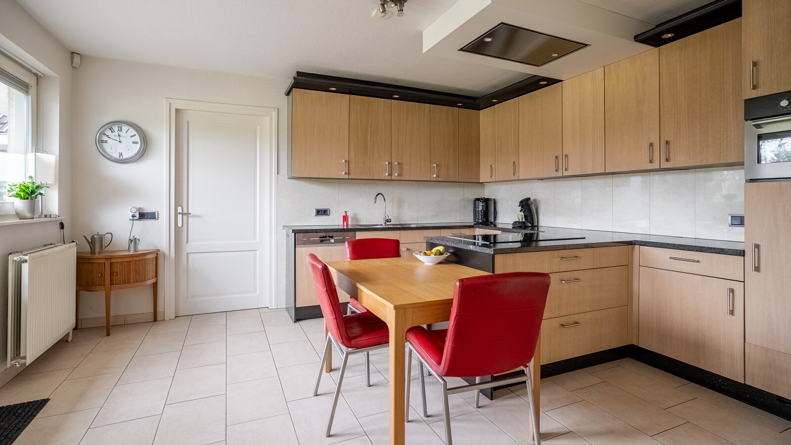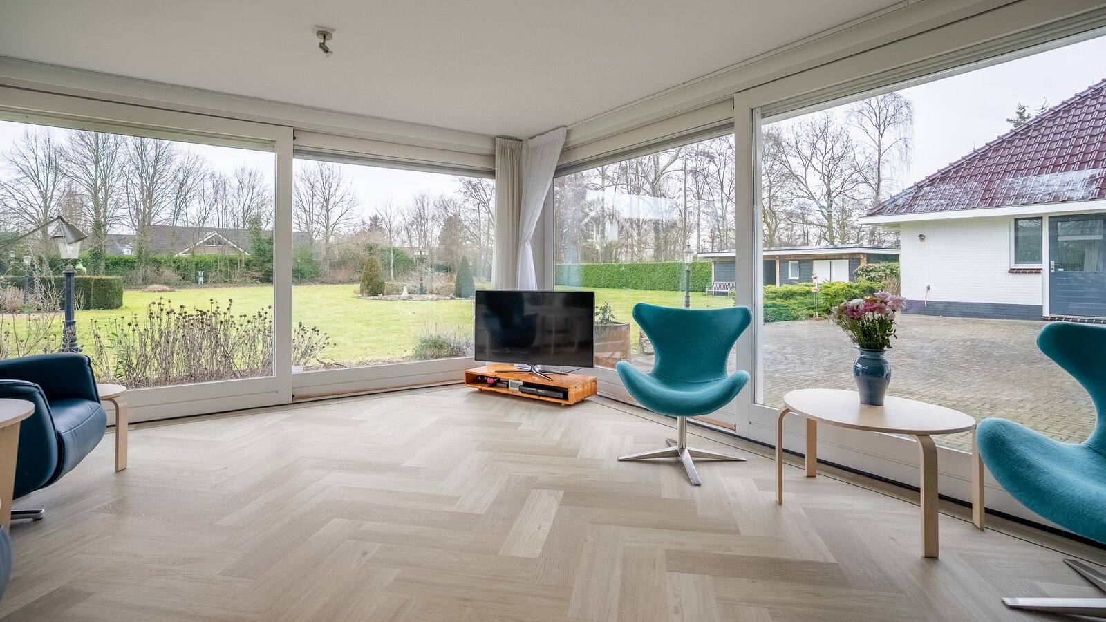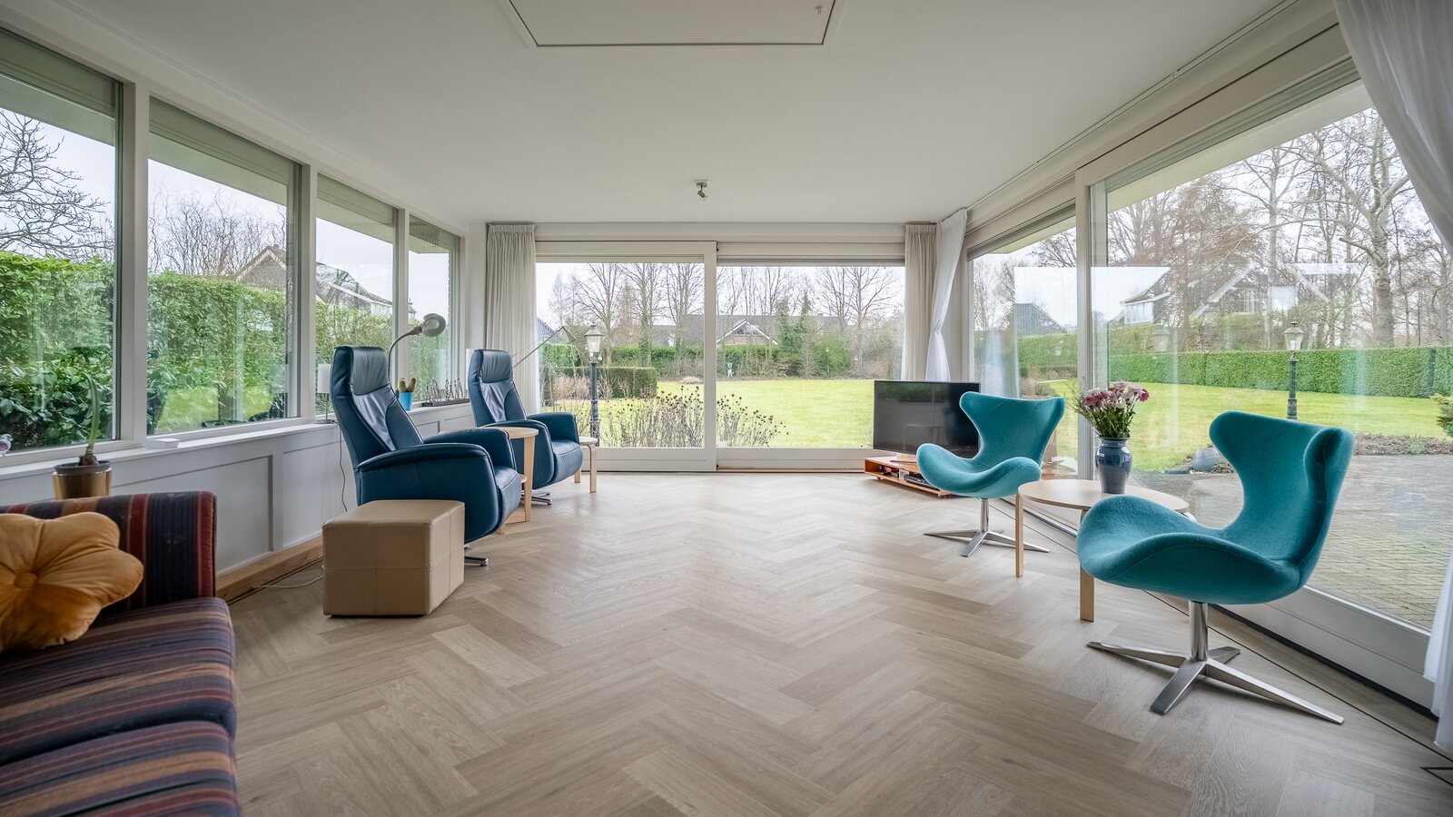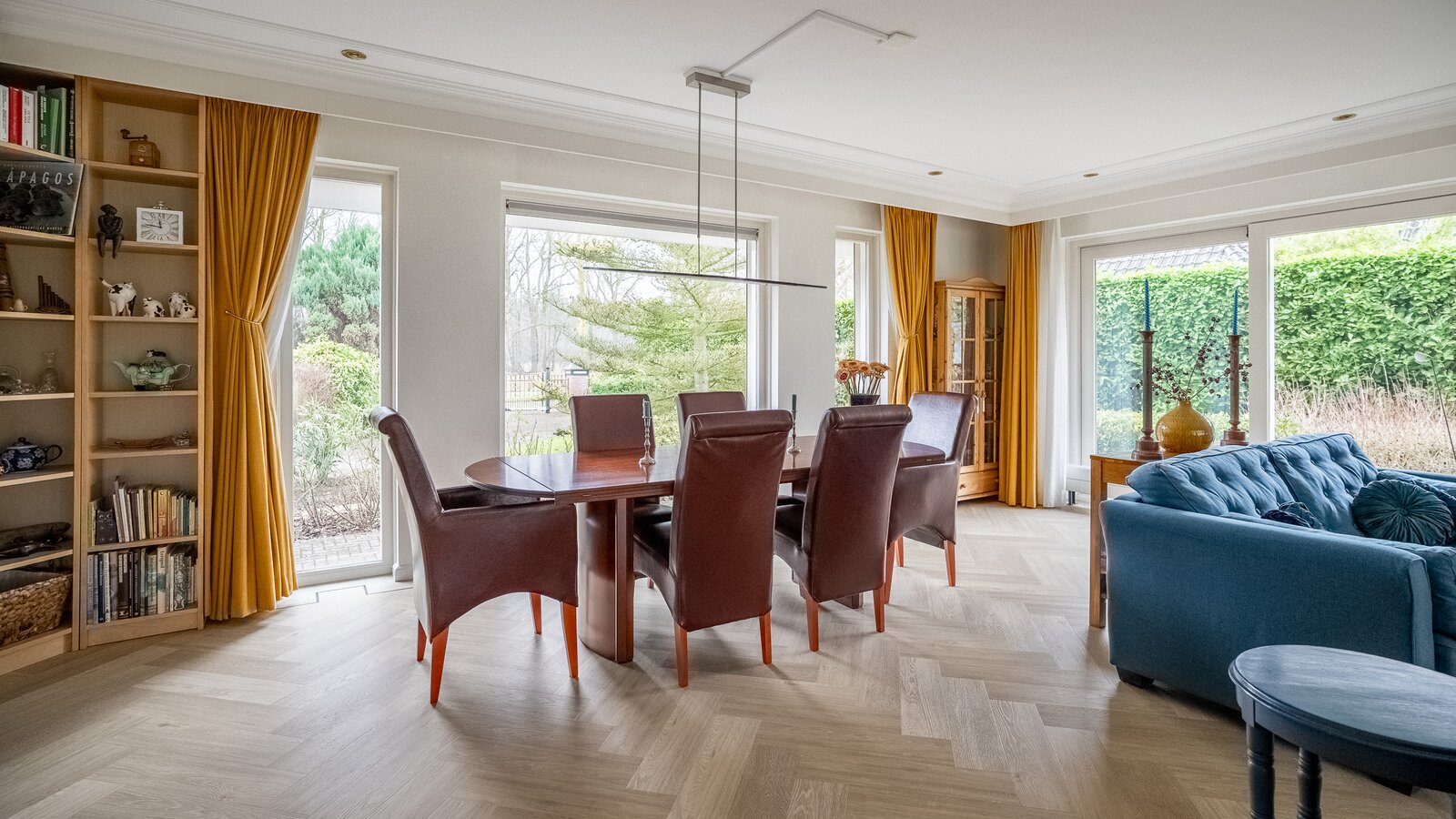 De royale, lichte woonkamer is voorzien van een prachtige in visgraat gelegde pvc-vloer en een sfeervolle haard, wat zorgt voor een warme en stijlvolle uitstraling. Grote raampartijen bieden een prachtig uitzicht op de groene tuin en laten het daglicht rijkelijk binnenstromen. De aangrenzende tuinkamer vormt een heerlijke plek om het hele jaar door te genieten van het uitzicht over de fraai aangelegde achtertuin. Binnen en buiten lopen hier naadloos in elkaar over.