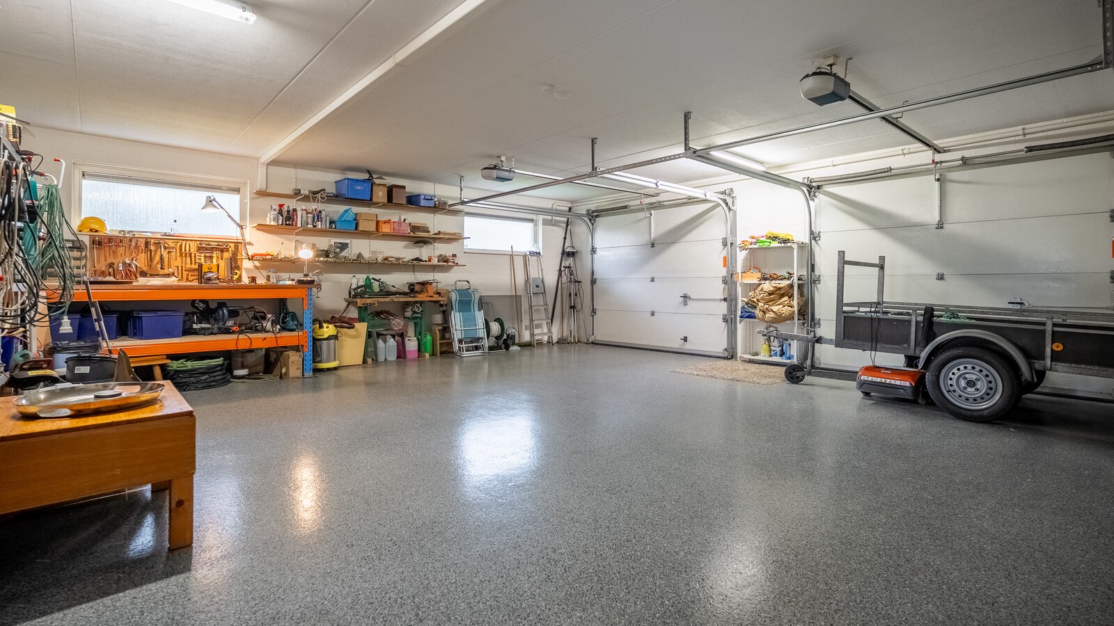 - Voorzien van een dubbele garage met elektrische deuren en een dubbele carport;