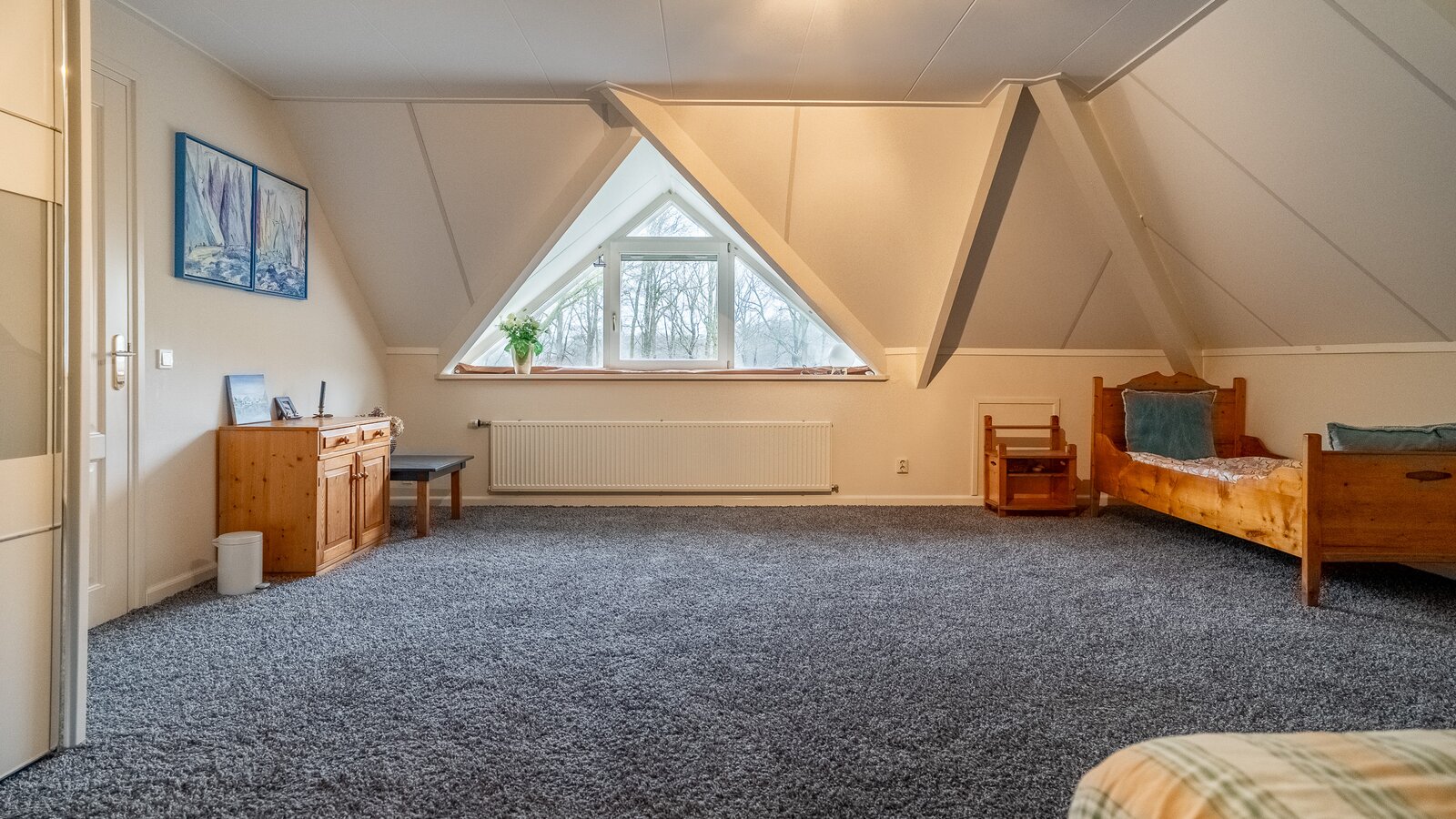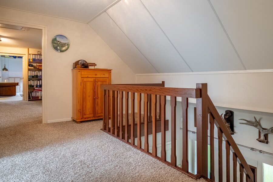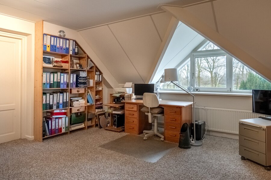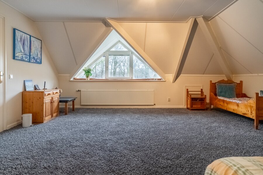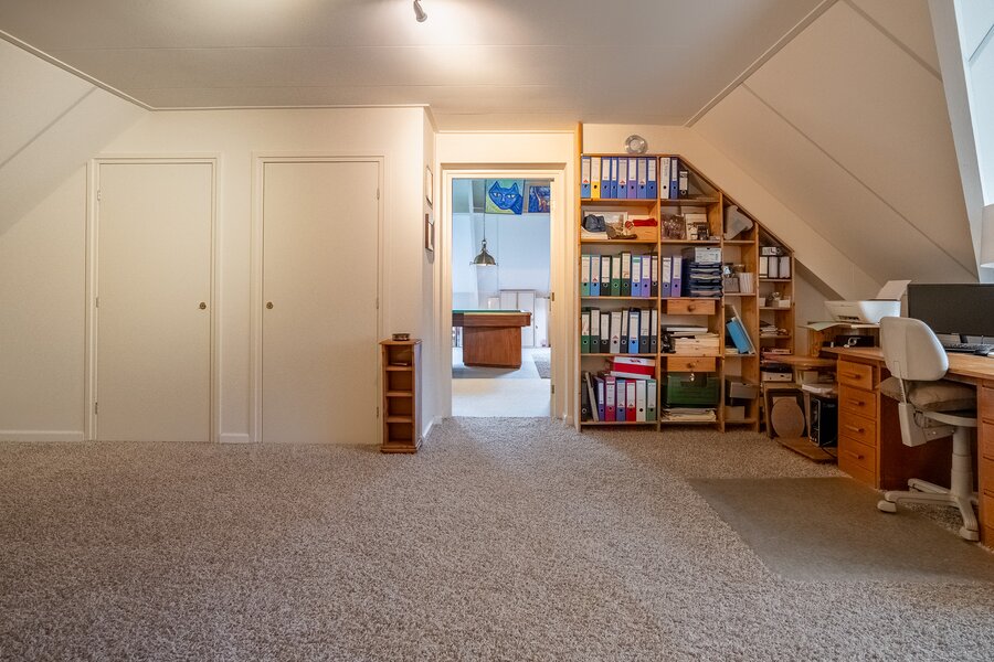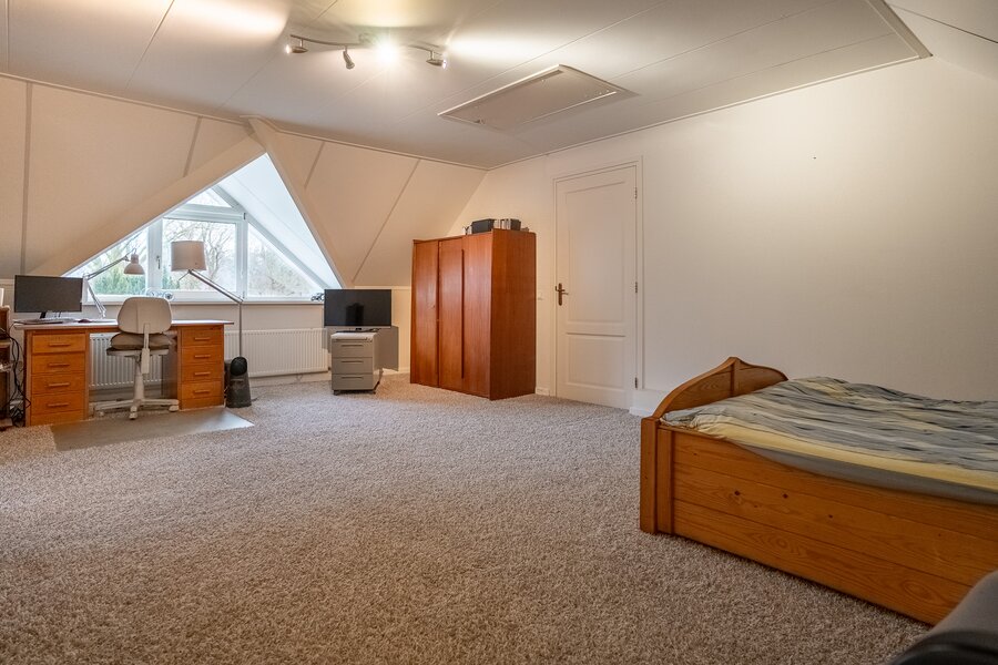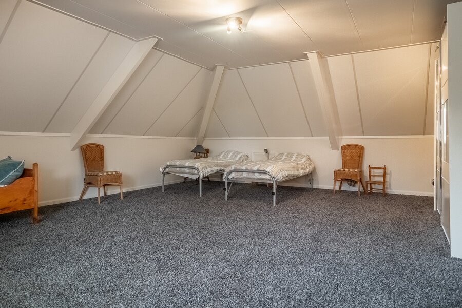 Op de verdieping bevinden zich drie ruime kamers (40, 38, 108 m²), waarvan één momenteel in gebruik is als hobbyruimte. Uiteraard kan deze ruimte eenvoudig worden ingericht als extra slaapkamer, werkkamer of speelkamer . De royale opzet biedt volop flexibiliteit voor diverse woonwensen.