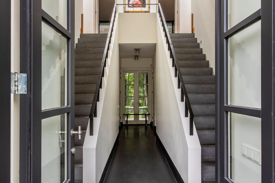 De entreepartij heeft een contrasterende donkere kleur gekregen en doet vanuit de voorgevel een paar stappen naar voren om u en uw gasten een warm welkom te heten. Links en rechts van de villa zijn doorgangen naar het achterste deel van de tuin waar een kavelbreed gazon met een paar prachtige solitaire oude bomen de overgang vormt naar de rust en de stilte van het Mauvezand. Terug naar de voorzijde van de villa die hoewel modern en strak toch ook subtiel refereert aan de meer klassieke architectuur.