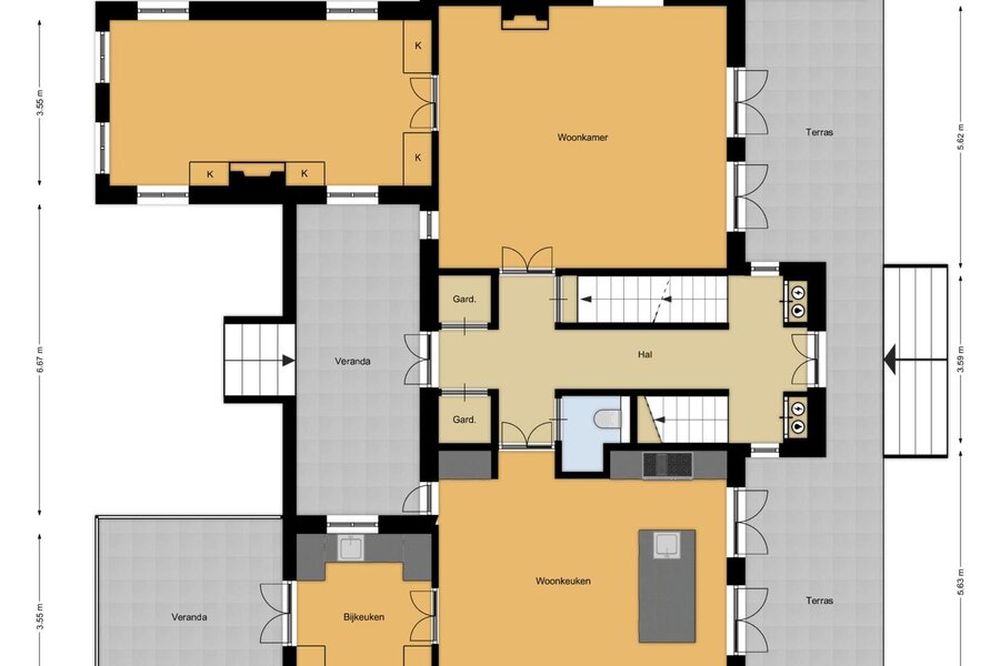 Via een paar treetjes gaan we naar het bordes en de verdiepingshoge dubbele voordeur. Eenmaal binnen zien we links en rechts trappen naar de verdieping. Recht voor u de hal die de U-vormige plattegrond in twee vleugels verdeeld. Links de woonkeuken - hier droomde u van - met open haard en aansluitend de bijkeuken. Dubbele deuren bieden daar toegang tot een van de veranda’s. En dan is er links van de bijkeuken nog een ’klompenhok’ en een tweede entree.