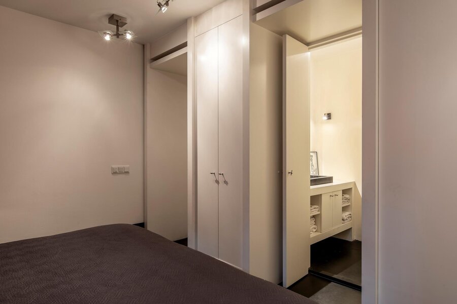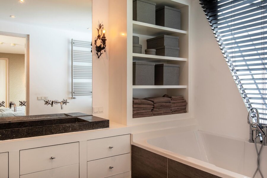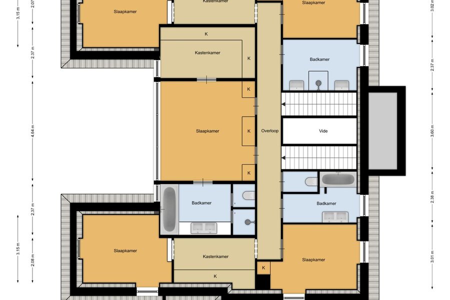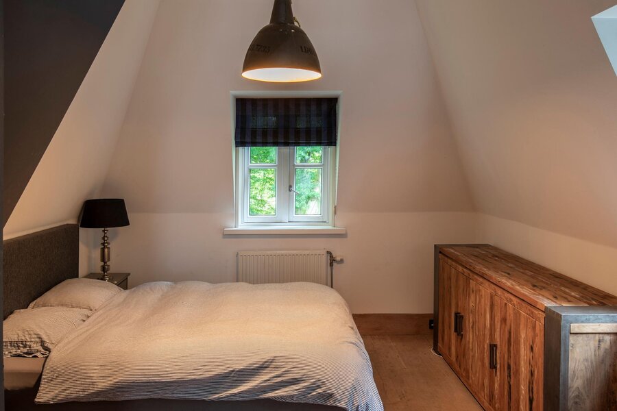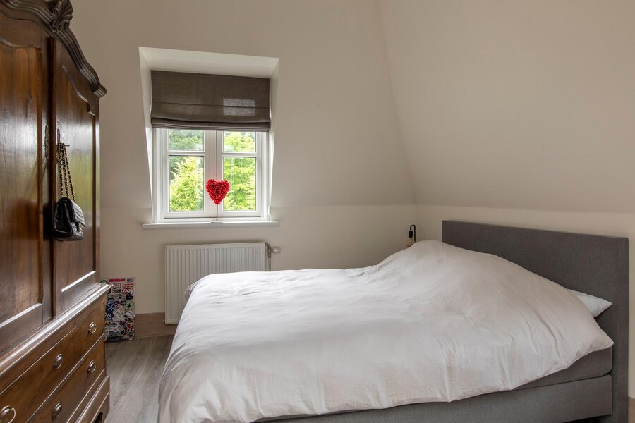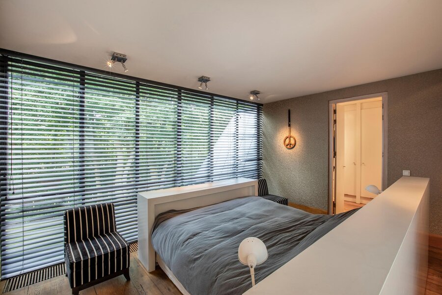 Bovengekomen op de 1e verdieping, ziet u links en rechts de overloop. U kijkt naar boven en ziet dat een lichtstraat voor daglicht zorgt, over de gehele lengte van de overloop, waar alle ruimten op uitkomen. Recht tegenover de trappen en de vide deuren naar de master-suite waar in de master-bedroom een verdiepingshoge en kamerbrede raampartij uitzicht biedt op de tuin en het daarachter gelegen Mauvezand. Aan weerszijden van de kamer de deuren naar de kastenkamer en de badkamer die alles heeft wat u zich wenst. En dan zijn er ook nog vier slaapkamers die twee kastenkamers en twee badkamers delen. Eén blik op de plattegrond maakt duidelijk dat hoe doordacht de verdieping is ingedeeld.