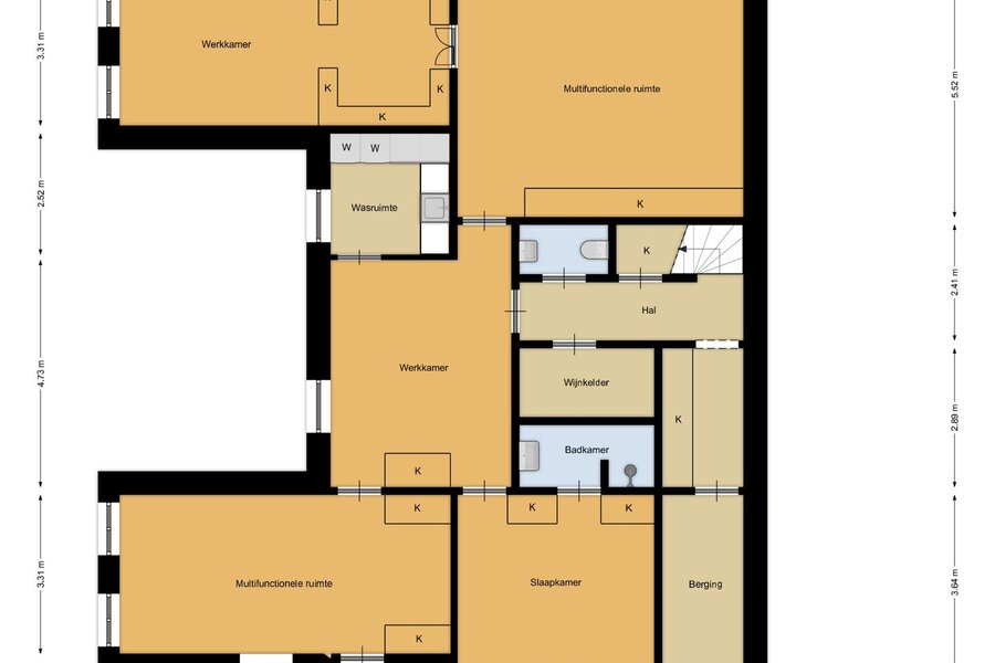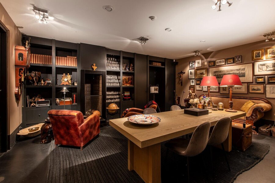 Tijd om af te dalen naar het souterrain waar u alles vindt wat aan het souterrain in een villa van deze klasse niet mag ontbreken. En - niet in de laatste plaats - wat u zich verder nog wenst: meer dan voldoende bergruimte, een CV/techniek-ruimte, een wijnkelder, een toilet en een wasruimte. En dan is er ook nog een zesde slaapkamer met eigen badkamer. Voor gasten of wellicht een au pair? U mag het zeggen. En dat geldt ook voor het gebruik van nog vier riante ruimten. Om te beginnen met een centraal gelegen ruimte die we gemakshalve maar even werkruimte genoemd hebben, maar waar ook alle ruimte is voor tafeltennissen of biljarten. Dat laatste kan ook in de bibliotheek of man cave zo u wilt. Deze ruimte heeft een open haard en een eigen buitenentree via een trap naar de parking. Aansluitend is er een kastenkamer overgaand in een werkkamer met heel veel daglicht door de hoge ramen die uitzicht bieden op de grote koekoek met een talud met een trap naar de tuin. Eenzelfde grote koekoek treft u bij een even riante ruimte aan de andere zijde van het souterrain.