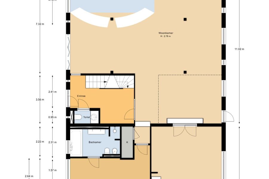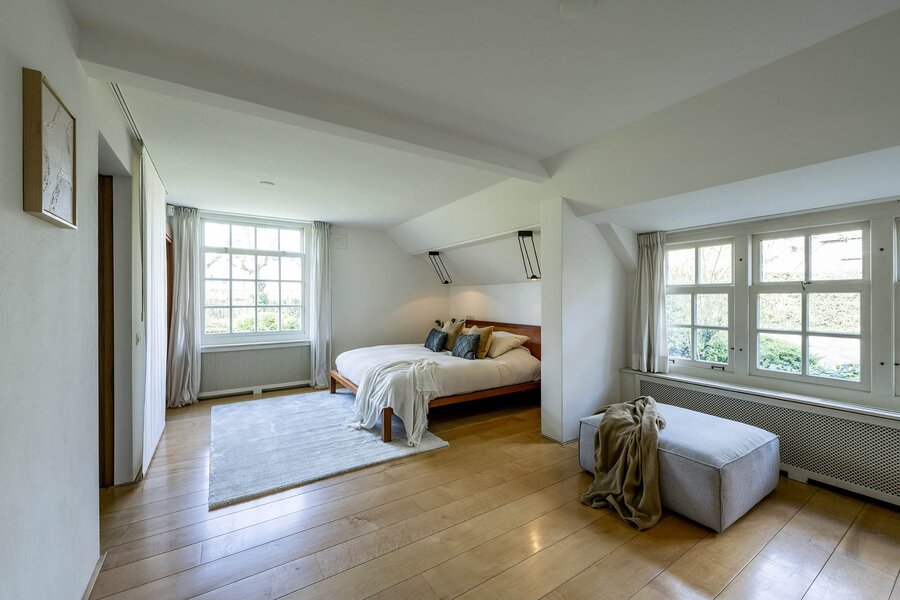 Begane grond: Karakteristieke entree, ruime hal met toilet, zeer ruime en lichte woonkamer met werkhoek, aansluitend de gezellige keuken met inbouw apparatuur en aansluitend het eetkamer-gedeelte met openslaande deuren. Een knusse grote opkamer met houtkachel heeft mooi zicht op de tuin. Deze ruimte is door de afmeting een 2e woonkamer/bibliotheek/muziekkamer. De masterbedroom heeft een inloop kledingkastruimte en de badkamer-en-suite is voorzien van ligbad, inloopdouche, dubbel wastafel en een 2e toilet. Vanuit de hal is het souterrain van het bijgebouw middels een vaste trap te bereiken. Hier bevindt zich onder andere een aparte waskamer.