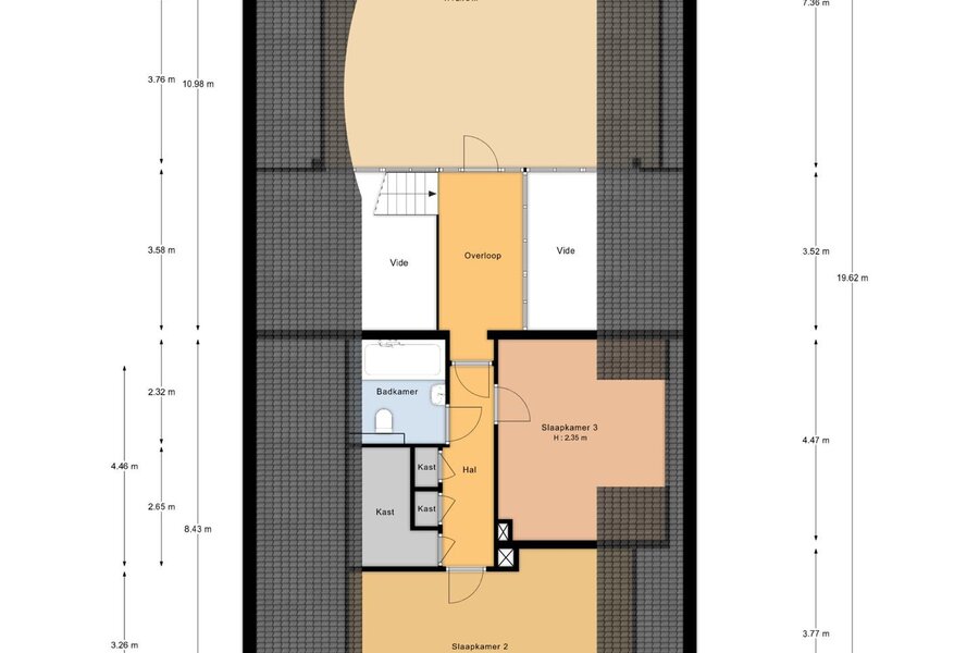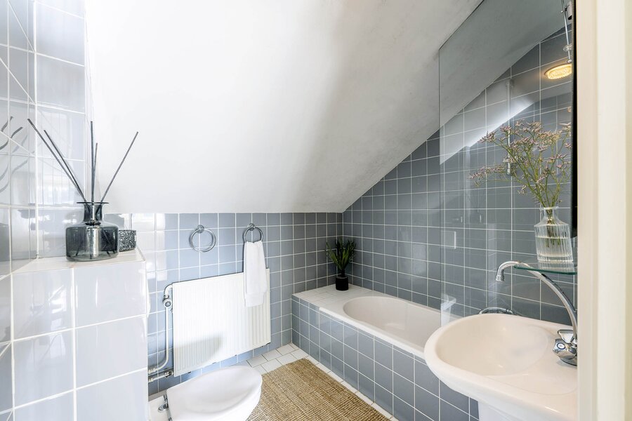 Verdieping: Lichte overloop met vide en aansluitend een hele ruime atelier/studeerkamer. Deze ruimte is tevens ideaal voor het creëren van een kinderspeelruimte c.q. televisieruimte. Maar zou ook een prima grote 4e slaapkamer kunnen worden. Voorts bevinden zich hier 2 slaapkamers en een aparte 2e (kinder)badkamer voorzien van een ligbad, wastafel en 3e toilet. Op de gang zijn een 3-tal ruime vaste kasten.