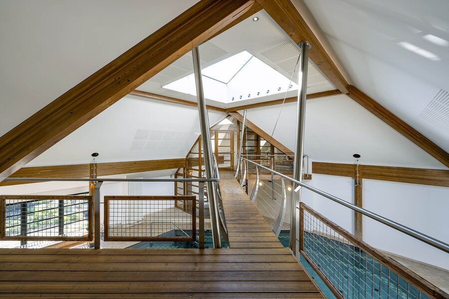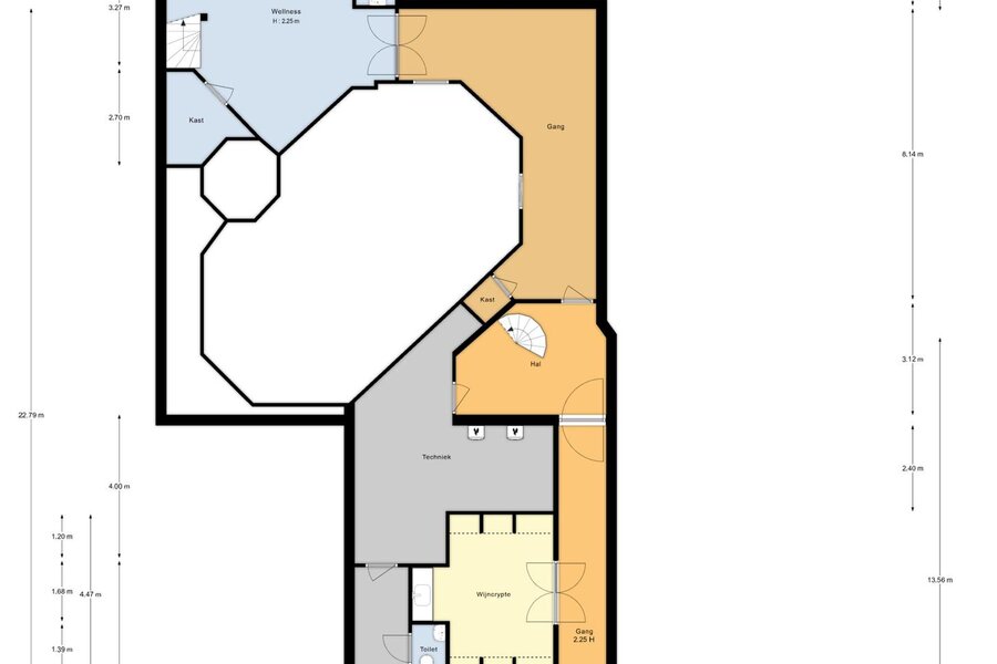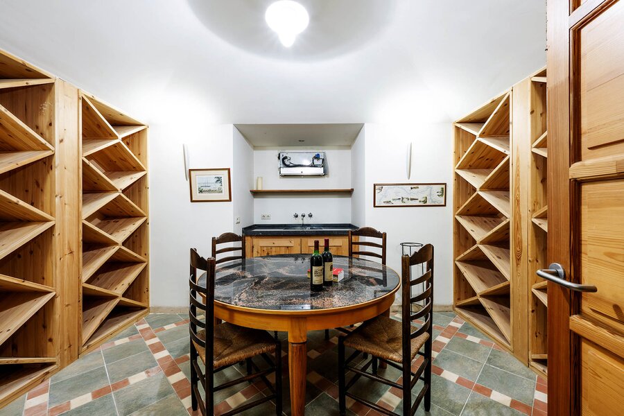 Souterrain: 'Safe Room', thans in gebruik als waskamer met pantry, een ruime wijnkamer met aparte gootsteen, vervolgens een grote technische ruimte met achtergelegen aparte kelder/provisieruimte met toilet. Doorlopend naar de wellness-ruimte passeren we de opvallende ronde ramen waardoor we "onder water" in het zwembad kunnen kijken. De wellness-ruimte bestaat uit een stoomcabine, een aparte dames - en heren kleedruimte met ieder een eigen douche en wastafel. Een apart 2e toilet in de gang. Middels een vaste trap bereiken we het zwembad. U bevindt zich nu op begane grond-niveau.