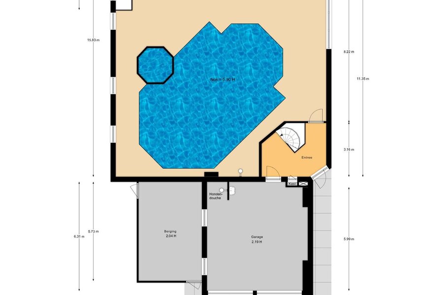 Begane grond: de begane grond heeft een ruime overkapping voor de auto's. Een elektrische garagedeur voor de inpandige garage van ca. 42 m² met een aparte hondendouche en schrobgootsteen. Het zeer ruime zwembad heeft een whirlpool gedeelte en aansluitend een groot zitgedeelte met een eigen pantry. Ook hier heeft men prachtig uitzicht over de tuin. Boven het zwembad is een grote vide met loopbrug naar de gastenkamers. Een imposant geheel. Kosten noch moeite zijn gespaard en het geheel heeft dan ook een zeer luxe uitstraling.