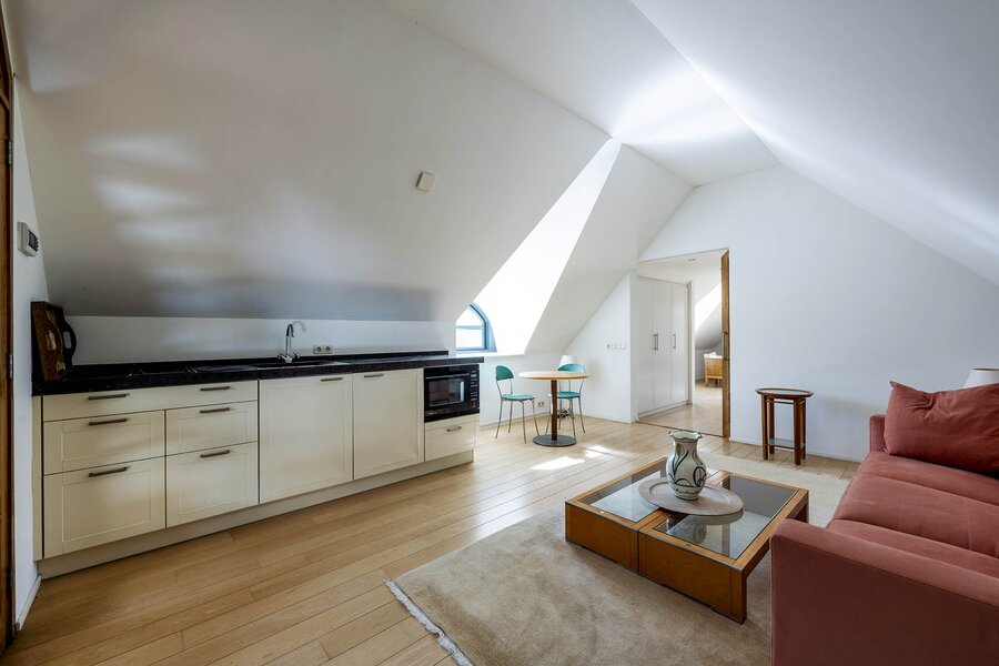 Verdieping: middels de vaste trap bereiken we de verdieping. Rechts bevindt zich het (gasten)appartement met eigen woonkamer met open keuken met inbouwapparatuur en aansluitend de eigen badkamer voorzien van een douche, wastafel en toilet. Links gaan we de loopbrug over en bevindt zich de 2e slaapkamer met eigen badkamer voorzien van douche, wastafel en toilet.