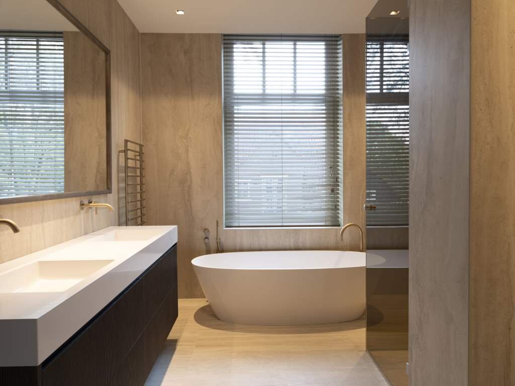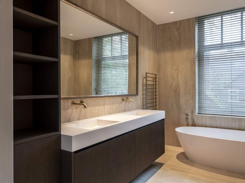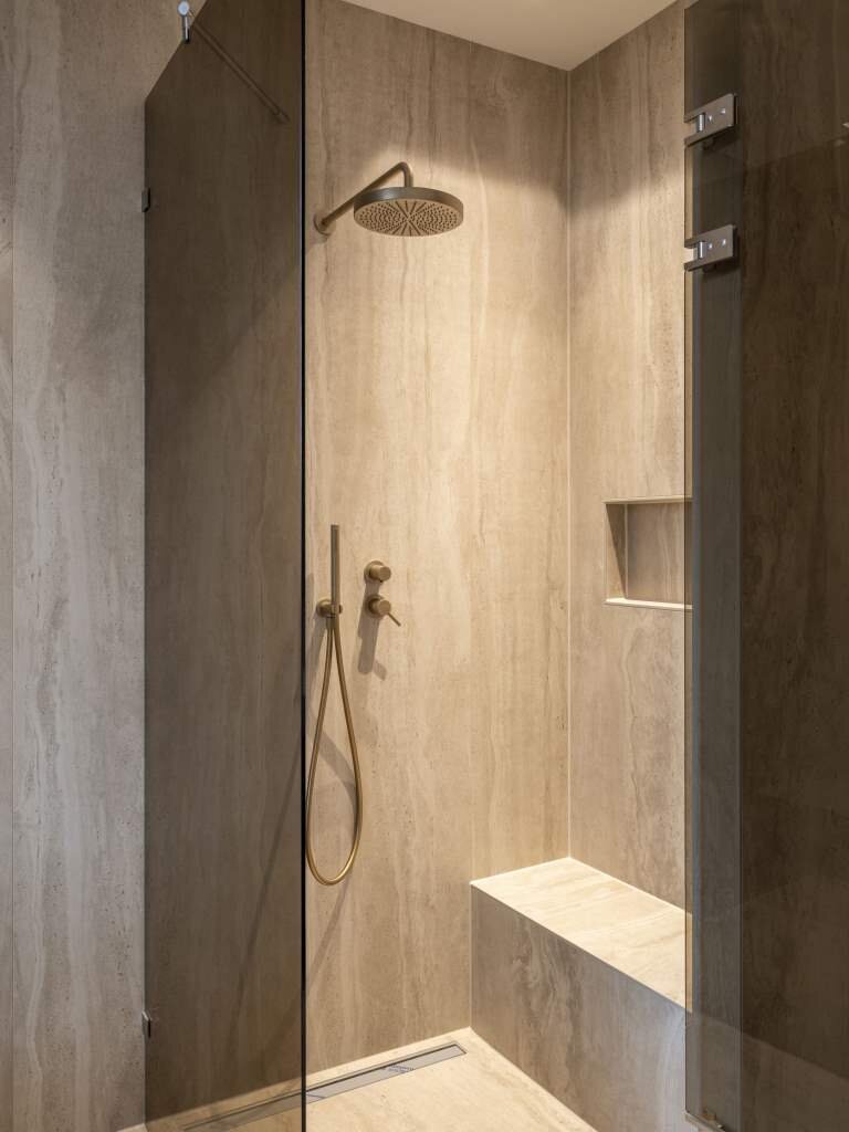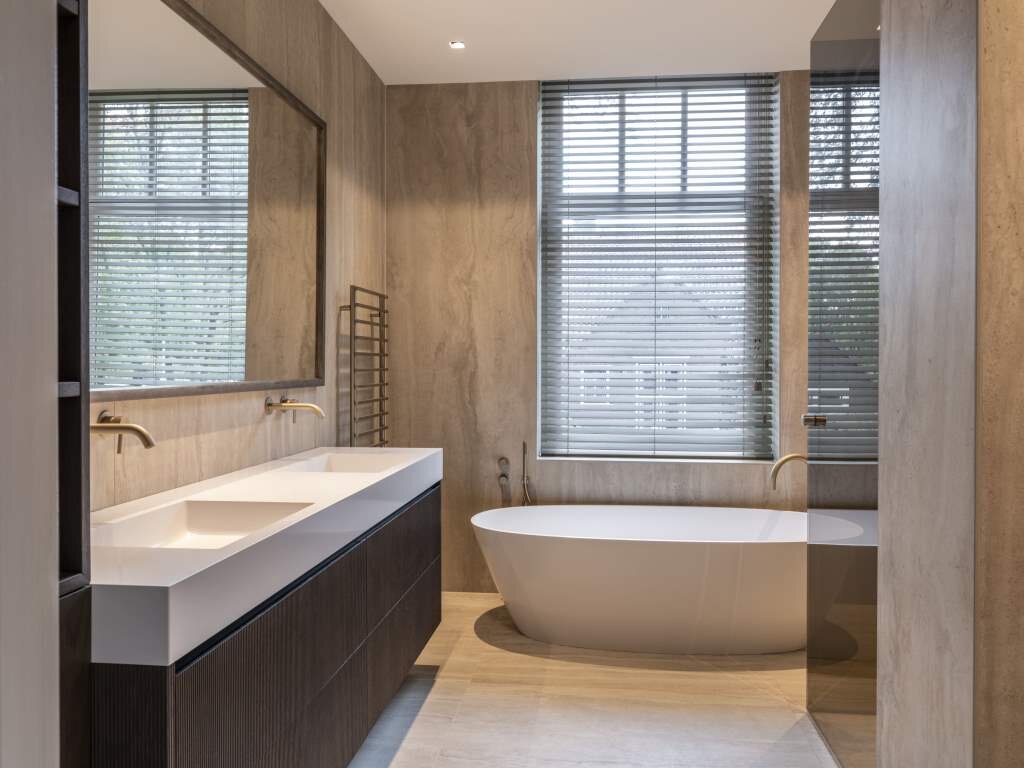 De woning beschikt over twee ruime slaapkamers, waarvan één direct toegang biedt tot het tweede terras. De naastgelegen badkamer is een oase van rust, met een royaal ligbad, inloopdouche, dubbele wastafel en toilet – een privé spa in eigen huis. De tweede badkamer is voorzien van dubbele wastafel, toilet en royale inloopdouche.