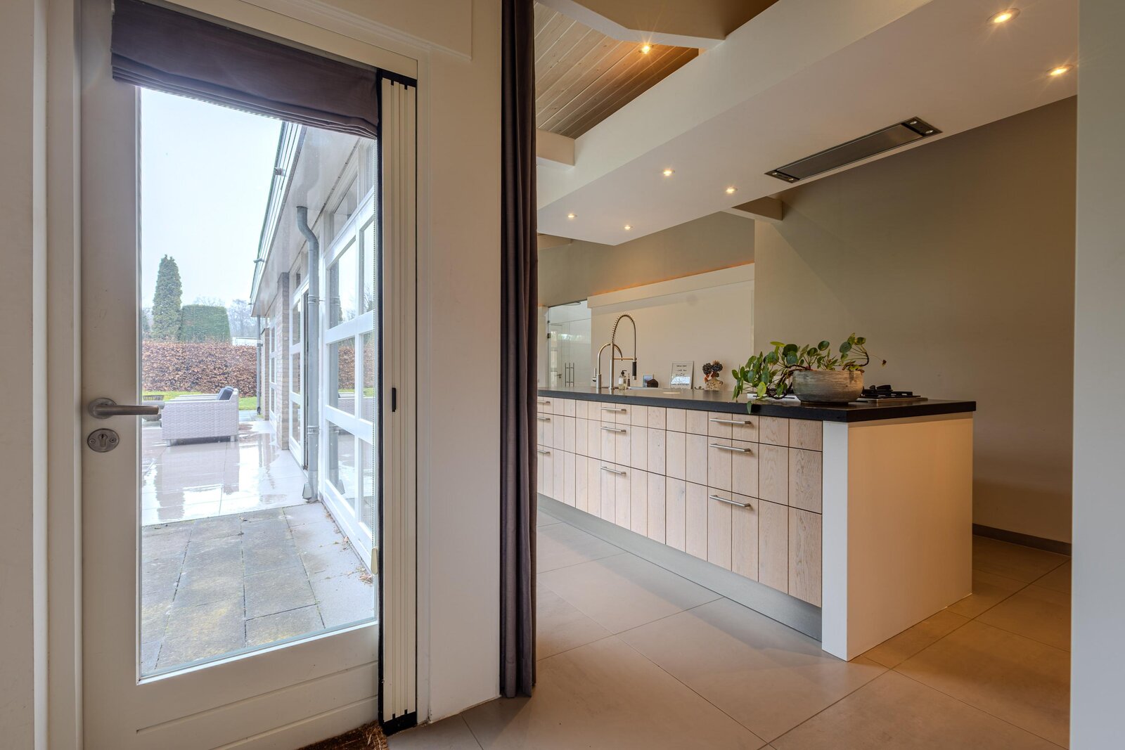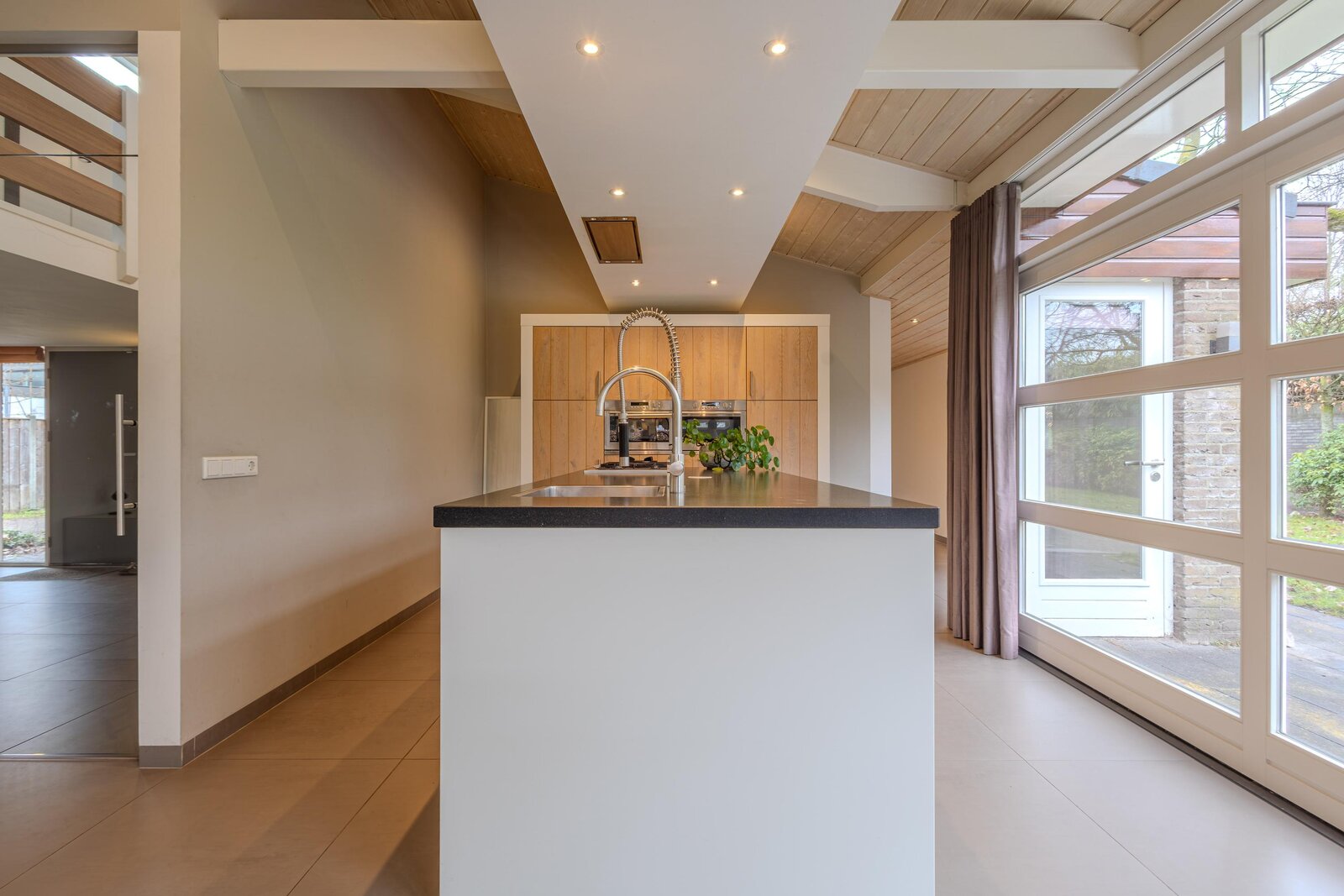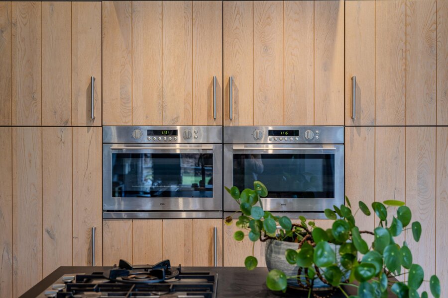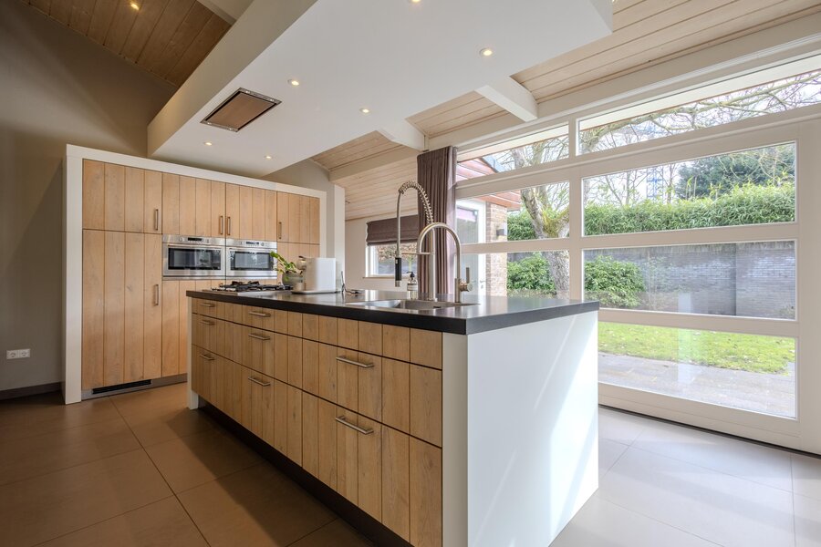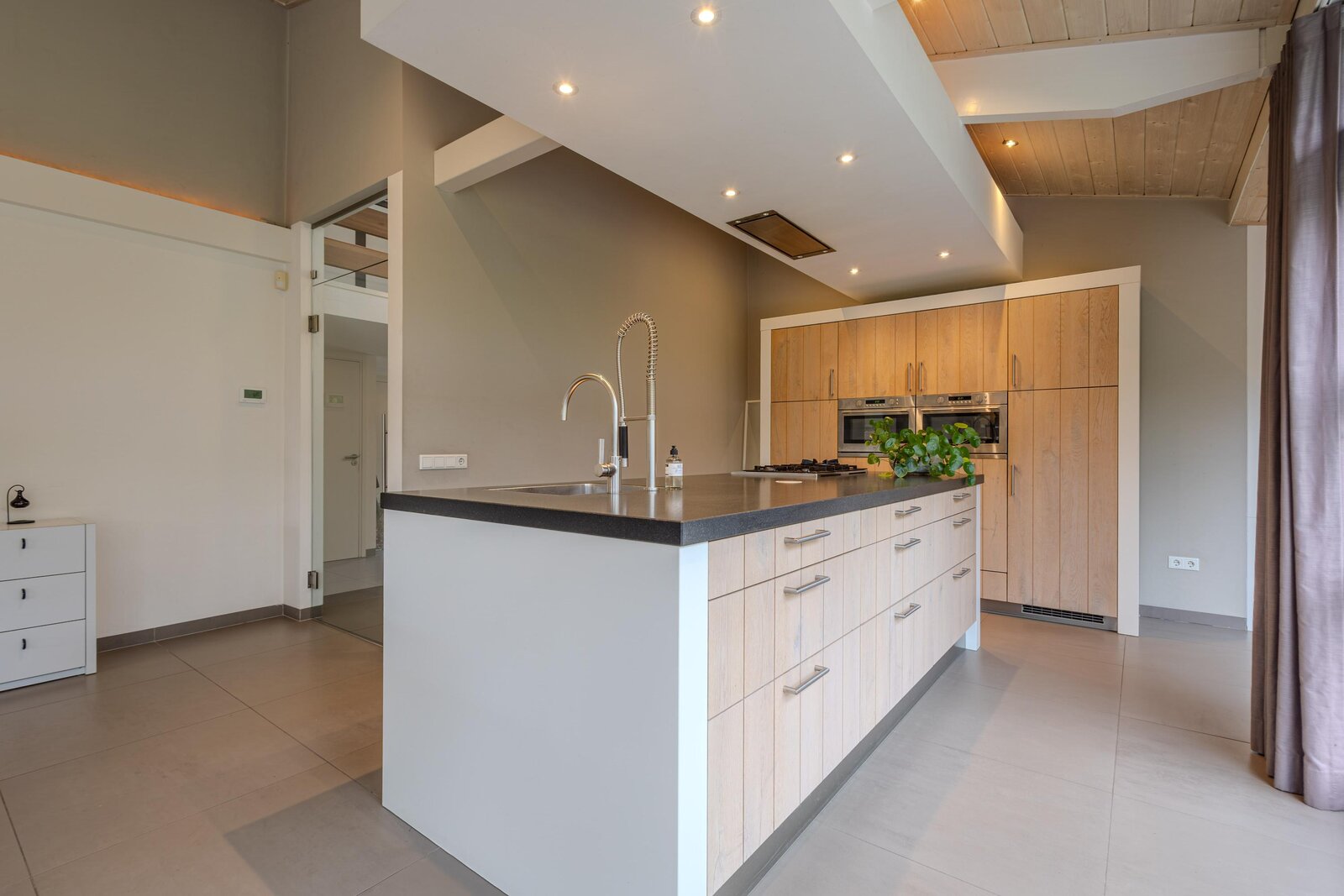 Aansluitend aan de eethoek bevindt zich de woonkeuken, uitgevoerd met een royaal kookeiland en een vaste kastenwand. De keuken is compleet uitgerust met een 5-pits gaskookplaat inclusief wokbrander en afzuigkap, stoomoven, combi-oven, een vaatwasser op hoogte, een koelkast en een vriezer. Het kookeiland biedt niet alleen veel werkruimte, maar beschikt tevens over extra elektrapunten en volop opbergmogelijkheden.