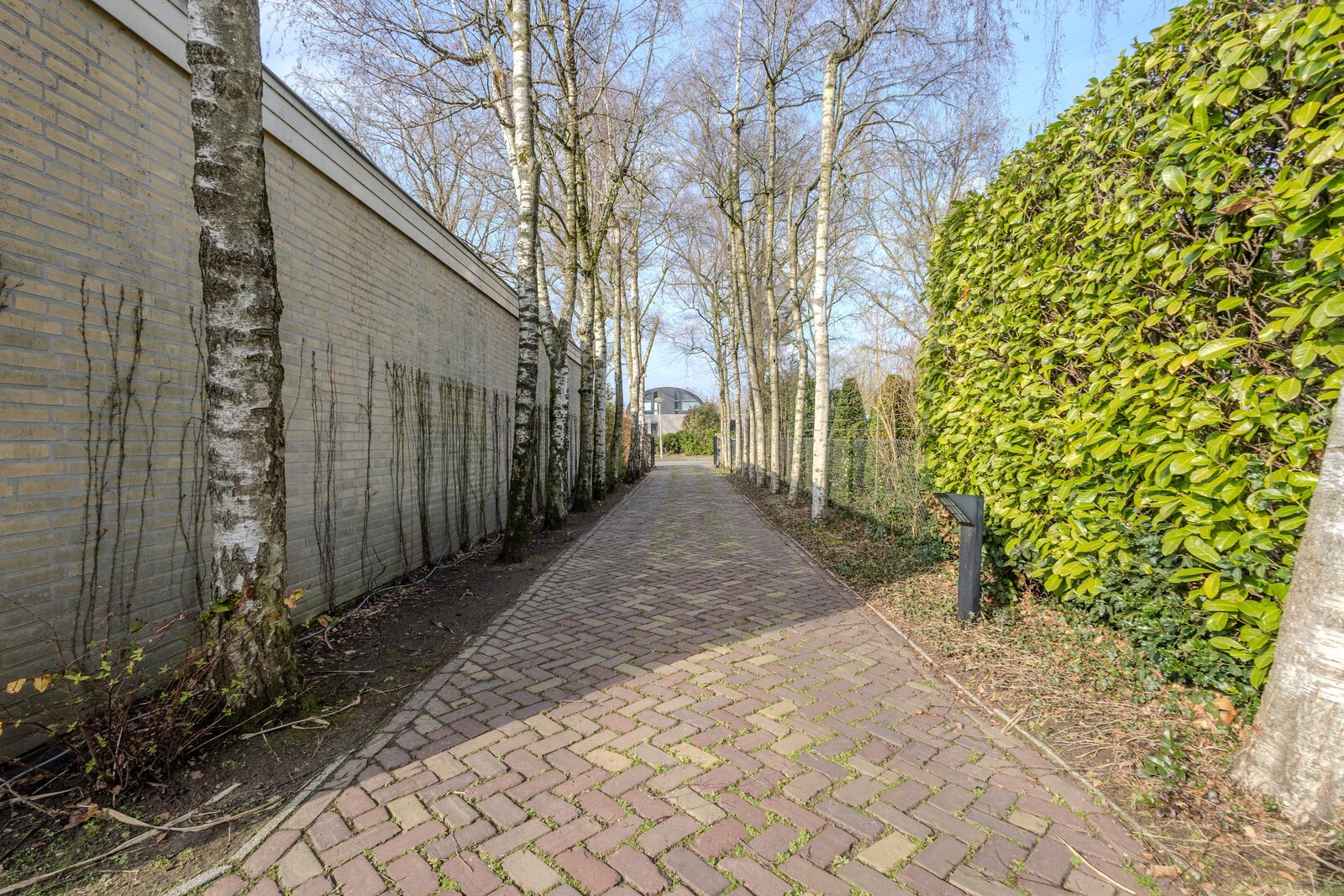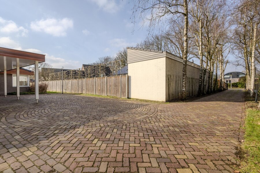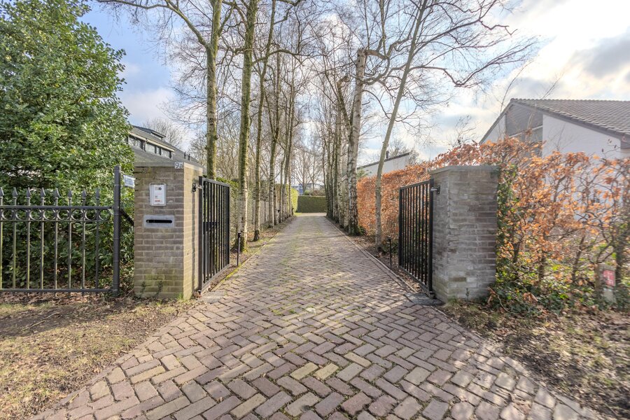 Een toegangspoort leidt vanuit de achtertuin naar de oprit aan de voorzijde. Op deze oprit is plaats voor meerdere auto’s waaronder een beschutte stallingsplaats onder de carport. Aansluitend aan deze carport ligt de eerder genoemde stenen berging. De eigen toegangsweg, groene hagen, het camerasysteem en de alarminstallatie versterken het gevoel van privacy en veiligheid.