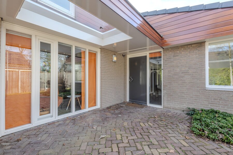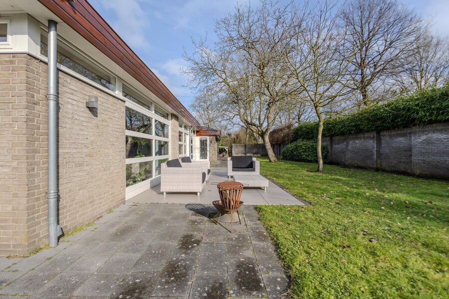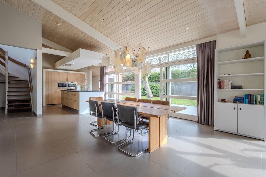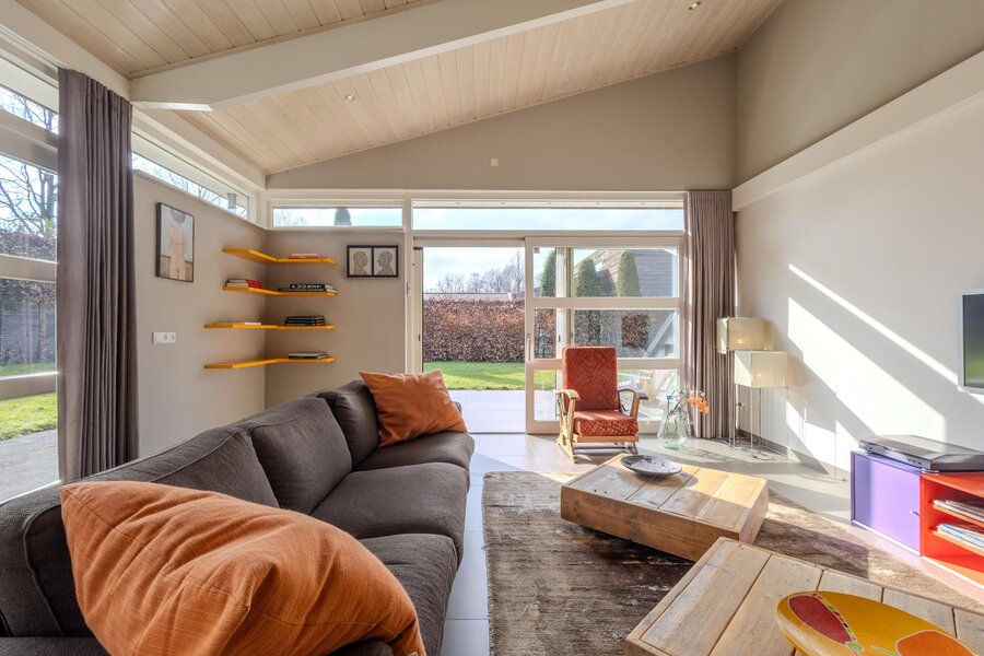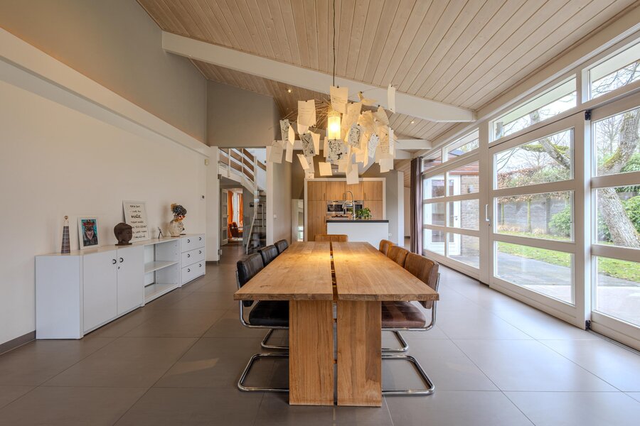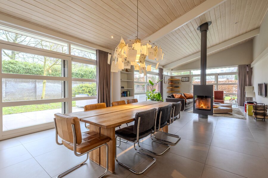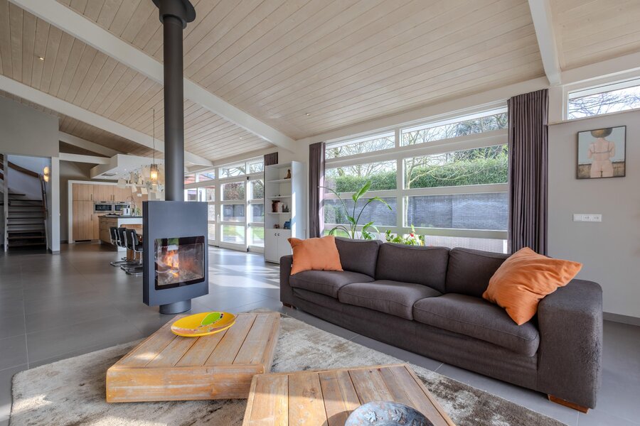 Uniek aan deze woning is het schuine plafond met hoge nok dat in een groot gedeelte zichtbaar is. Dit geeft het geheel een ruimtelijke en open sfeer. Aan de beide zijden van de living is een grote schuifpui aanwezig met elk toegang tot een buitenterras.