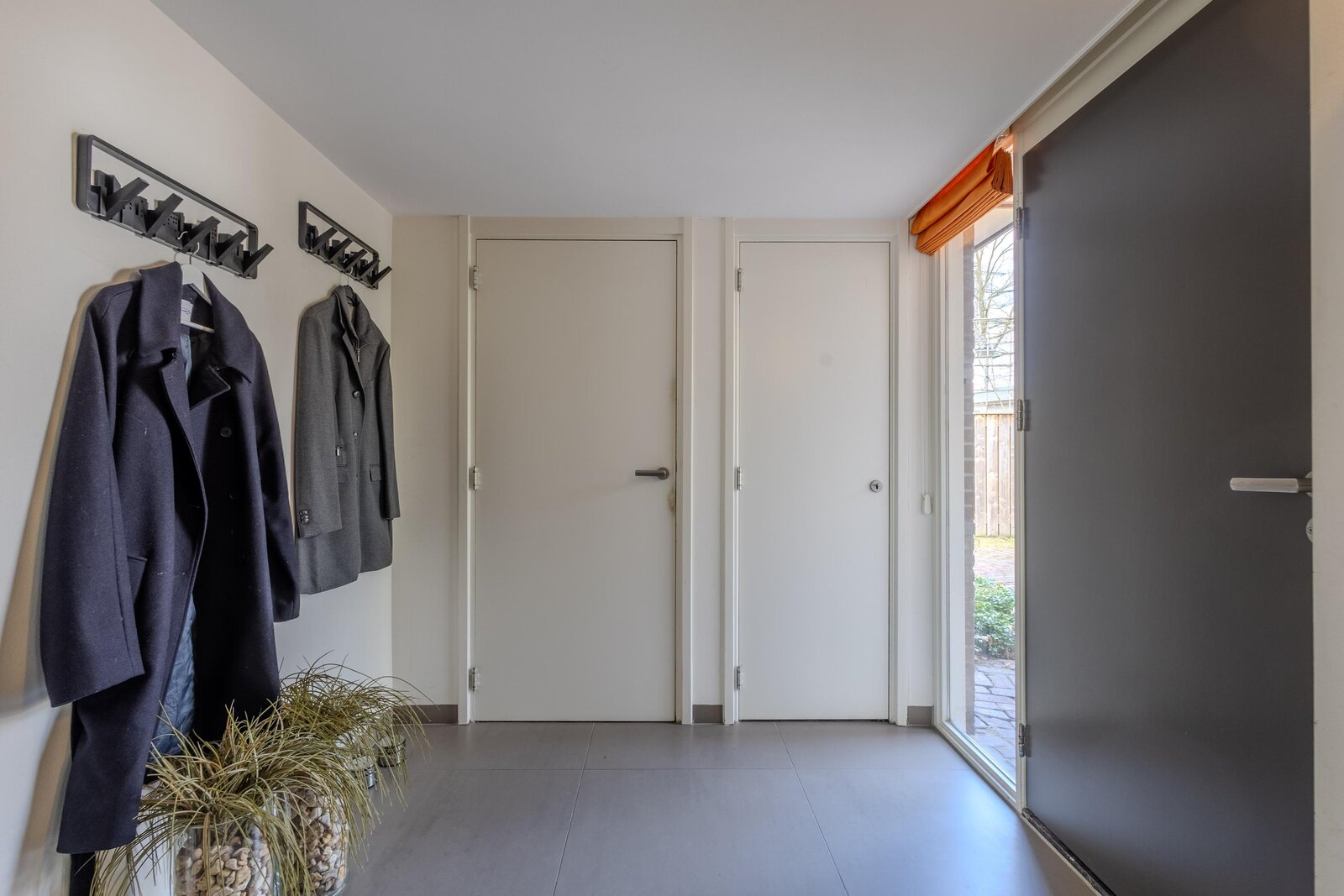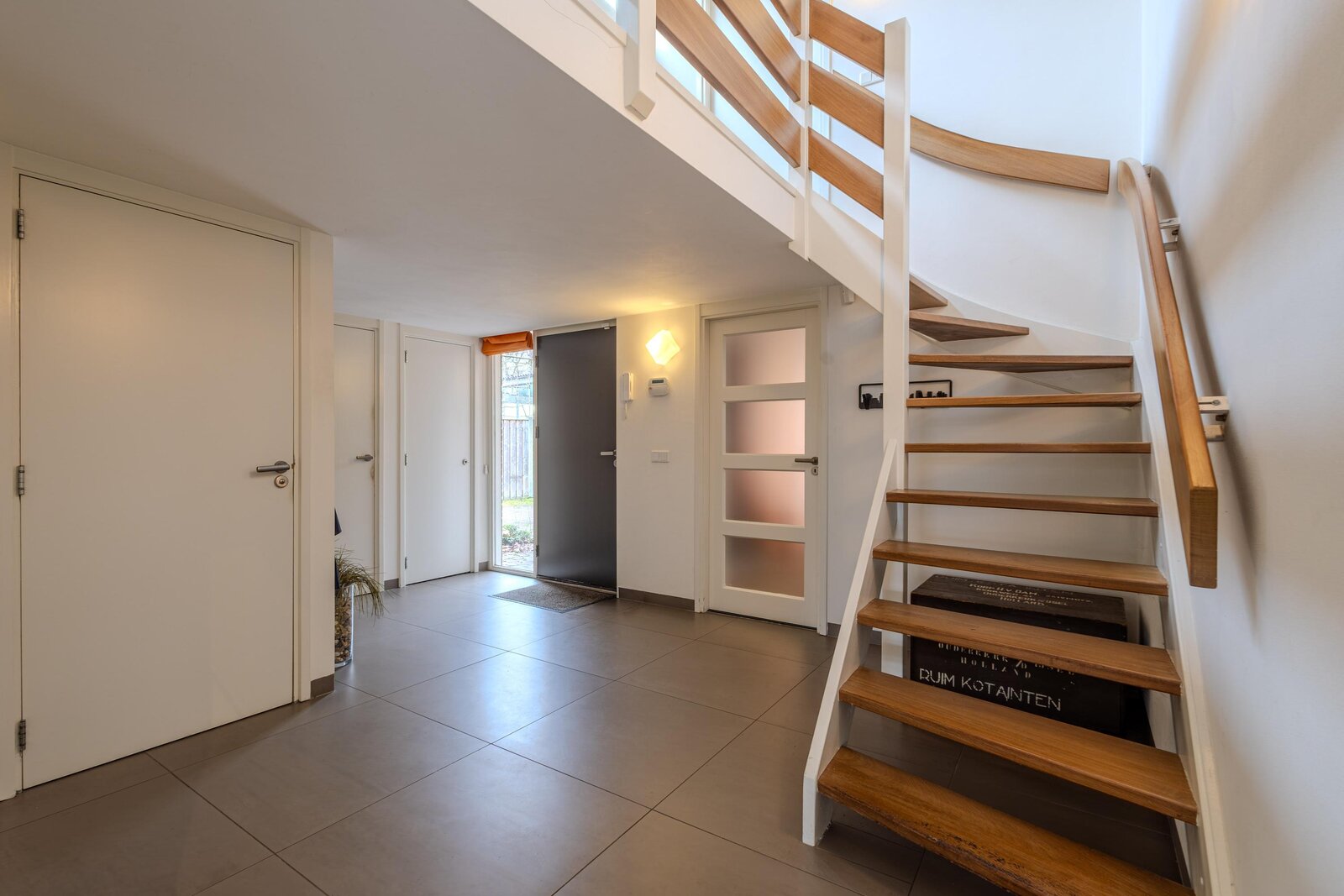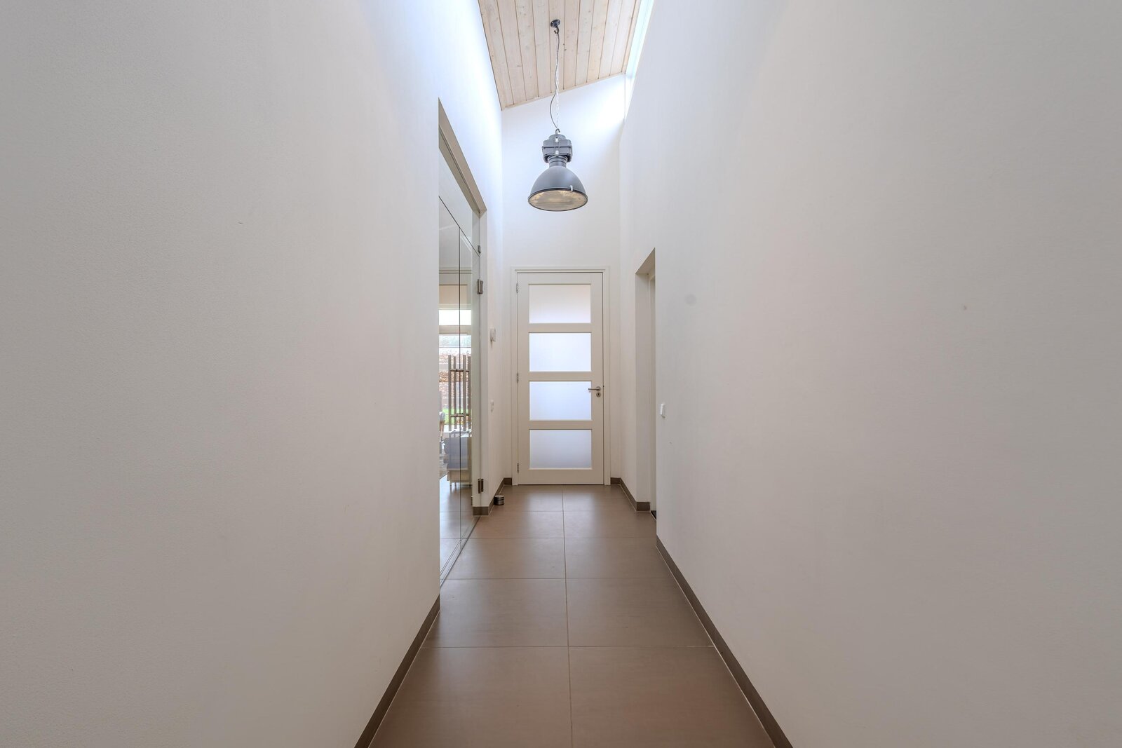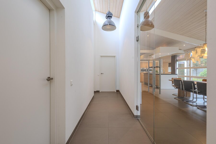 Via de entree aan de voorzijde is de hal te betreden. Deze riante hal met moderne tegelvloer geeft daarnaast toegang tot diverse ruimtes in de woning. In de hal is het volledig betegelde toilet met fonteintje te vinden, net als de open trapopgang naar de eerste verdieping en de meterkast.