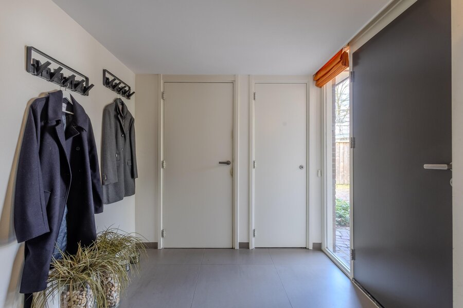 Grenzend aan de keuken bevinden zich meerdere praktische ruimtes die functioneel en doordacht zijn ingedeeld. Allereerst de vaste inbouwkast met daarachter de aansluitingen voor de wasmachine en droger. Vervolgens een zeer functionele bergkast welke ideaal is voor het opslaan van voorraad en tot slot de technische ruimte met daarin de opstelling van de hybride cv-ketel. Een loopdeur biedt directe toegang tot de achtertuin.