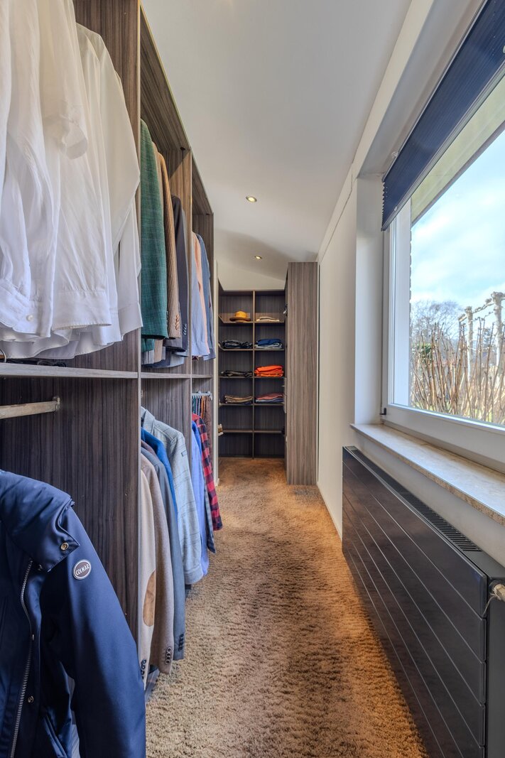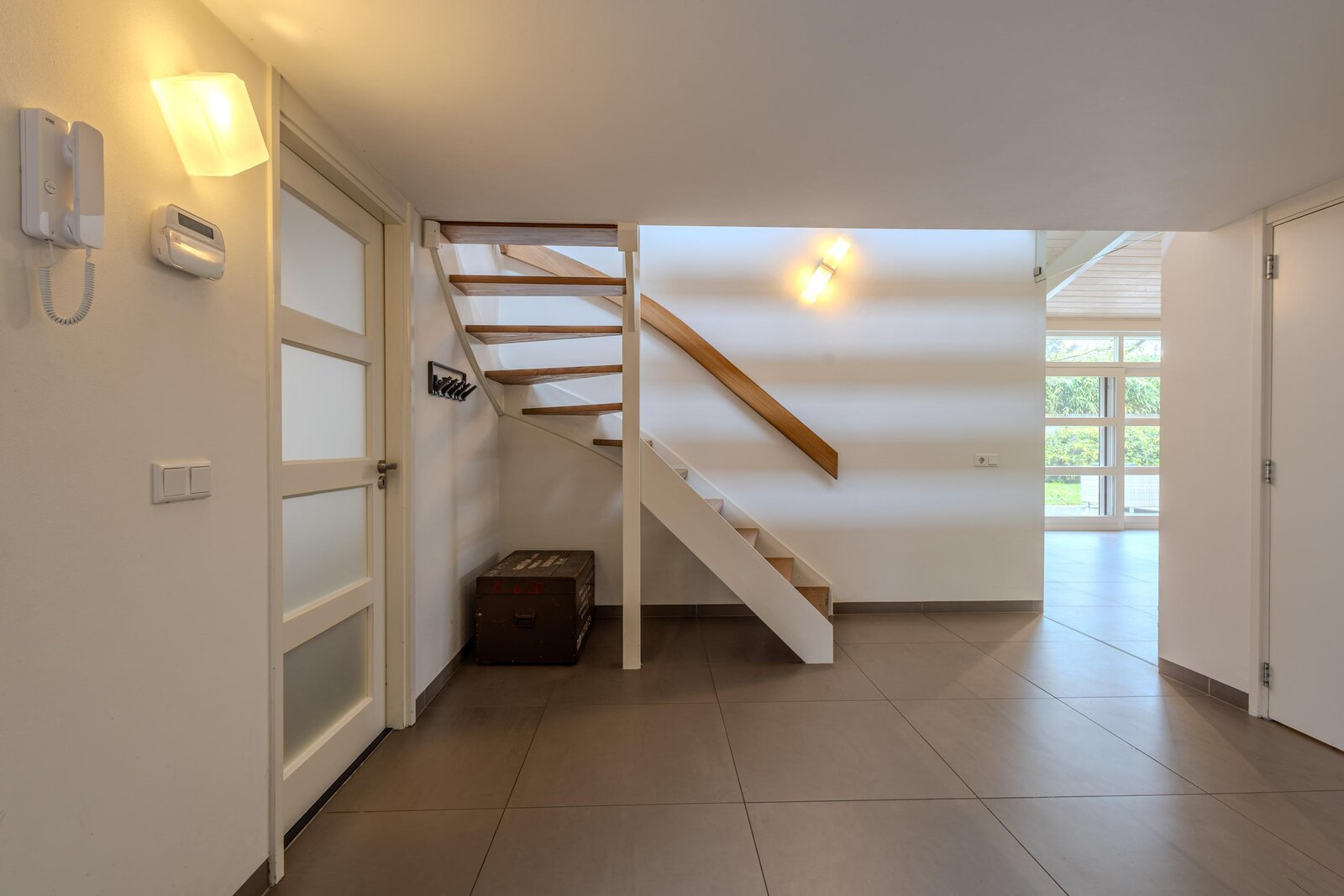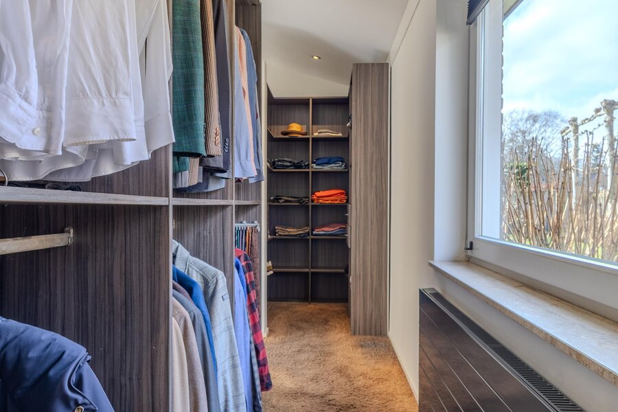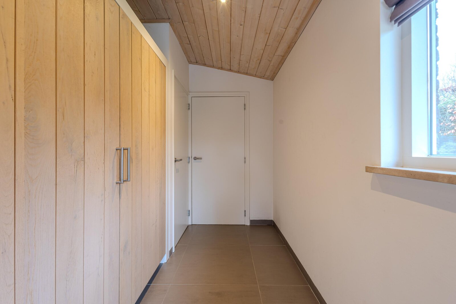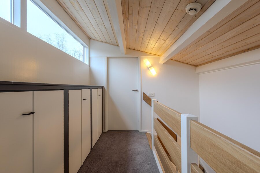 Op de overloop zijn vaste inbouwkasten gerealiseerd voor extra opbergmogelijkheden. Een deur leidt naar nog meer opbergruimte onder de kapschuinte. Een waardevolle toevoeging aan deze unieke villa.