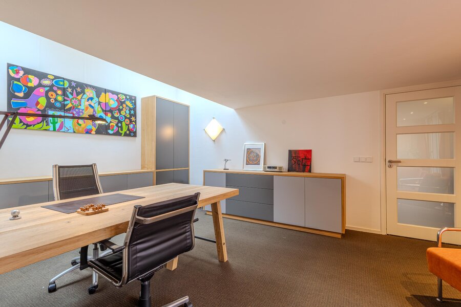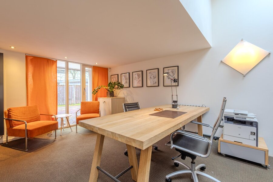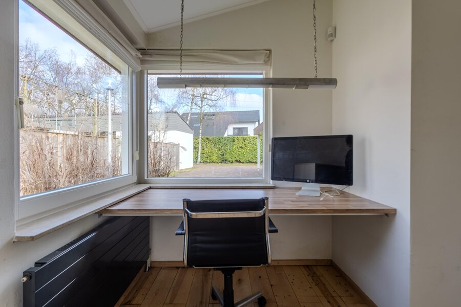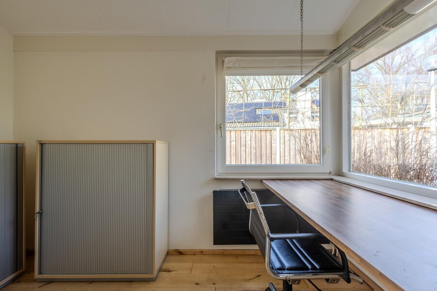 Direct links naast de hal is een werkkamer gesitueerd. Door de ligging direct naast de entree is dit een perfecte ruimte voor een kantoor aan huis. De grote raampartij richting de voorzijde van de woning en de Velux dakramen aan de achterzijde van het kantoor zorgen voor een prettige werkomgeving. Deze ruimte is daarnaast voorzien van maatwerkkasten. Uiteraard is deze kamer ook in te richten als slaapkamer of bijvoorbeeld als speelkamer.