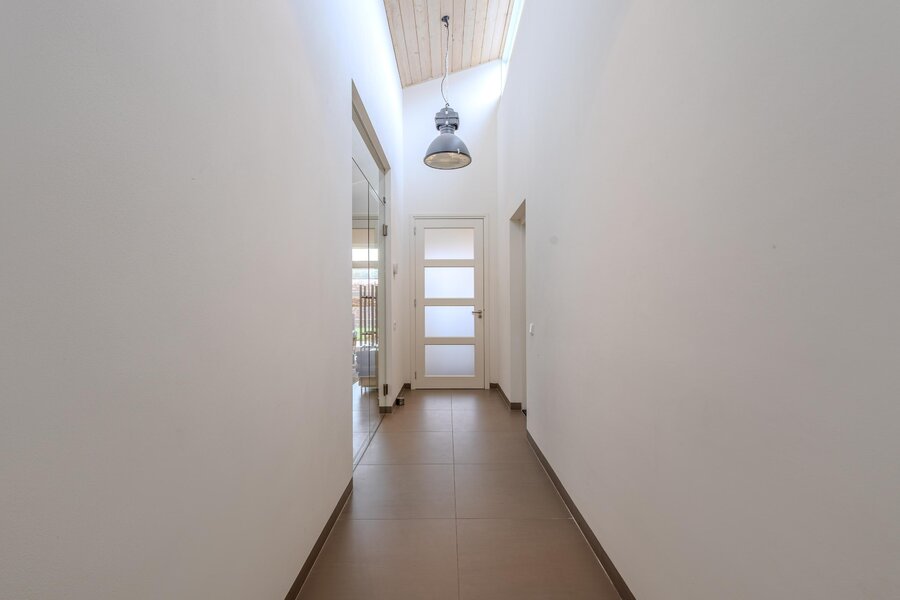 Vanuit de living gaan we terug naar de centrale hal. Vanuit hier is via een loopdeur toegang te verkrijgen tot een centrale verbindingsruimte waar het hoogste punt van de woning zich bevindt. Hieraan zijn de diverse slaapkamers en badkamers gelegen.