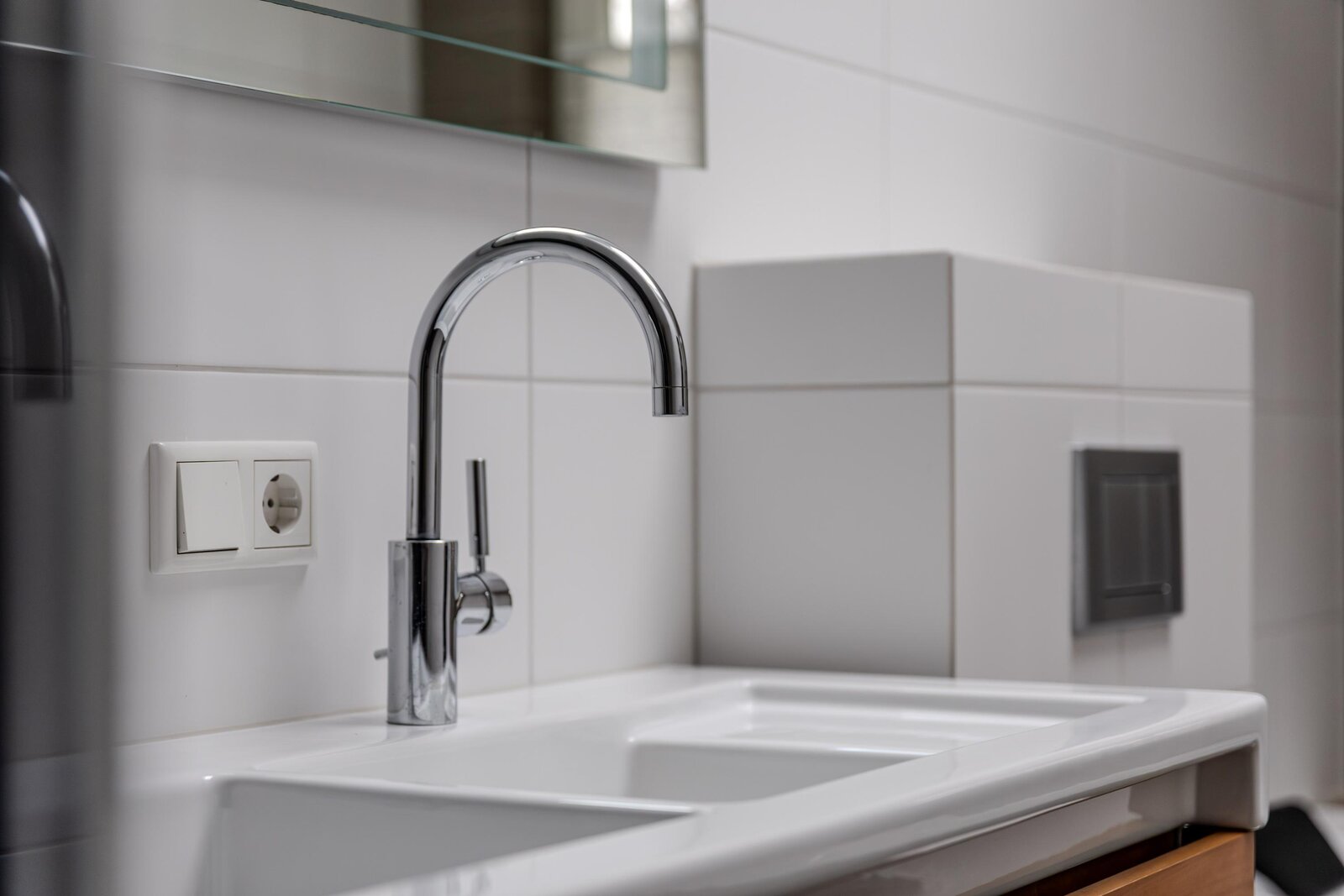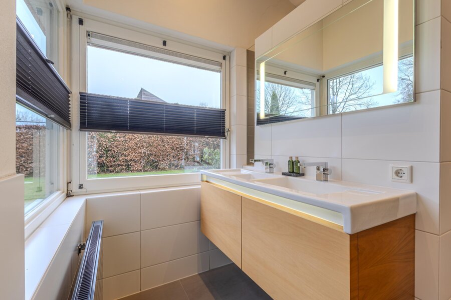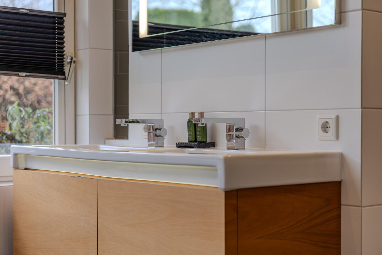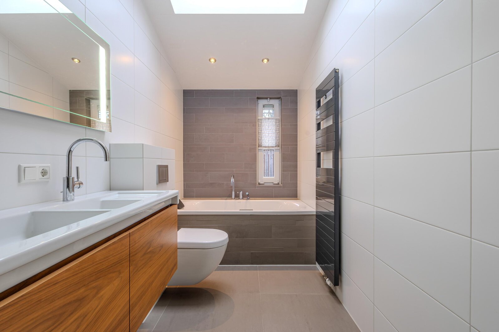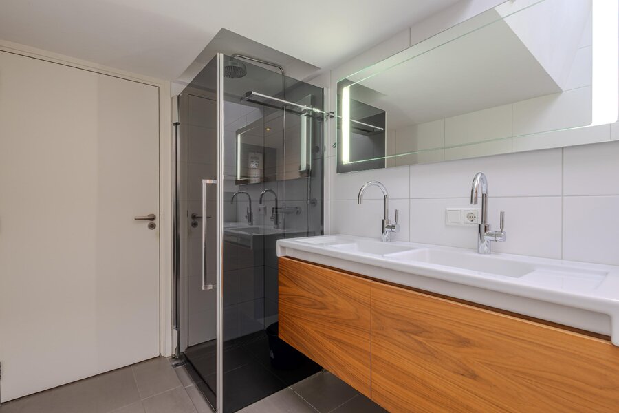 De eerste ruimte, gezien vanaf de centrale hal, is de luxe uitgevoerde badkamer. Deze badkamer is zeer compleet uitgerust met een ligbad met whirlpool, een douche met cabine, een toilet en een dubbele wastafel met meubel en spiegel met verlichting. De badkamer is uitgevoerd met hoogwaardige materialen (o.a. Dornbracht, Villeroy & Boch en Mosa), volledig betegeld en voorzien van mechanische afzuiging, comfortabele vloerverwarming en een Velux dakraam.