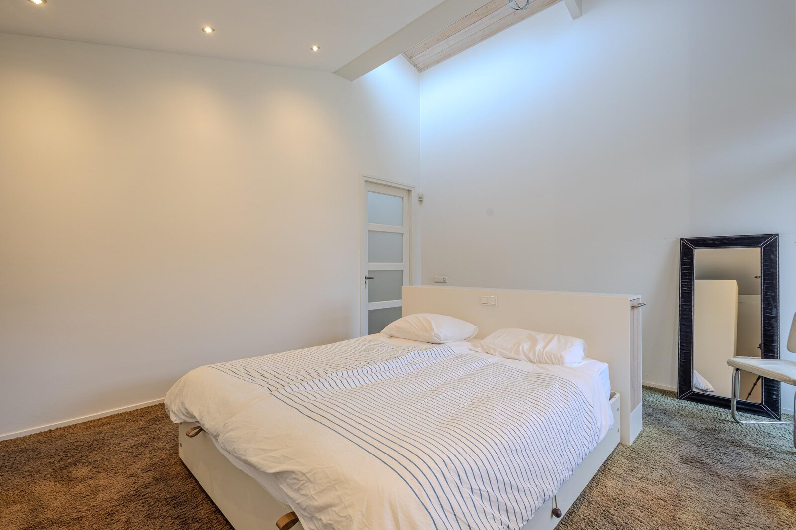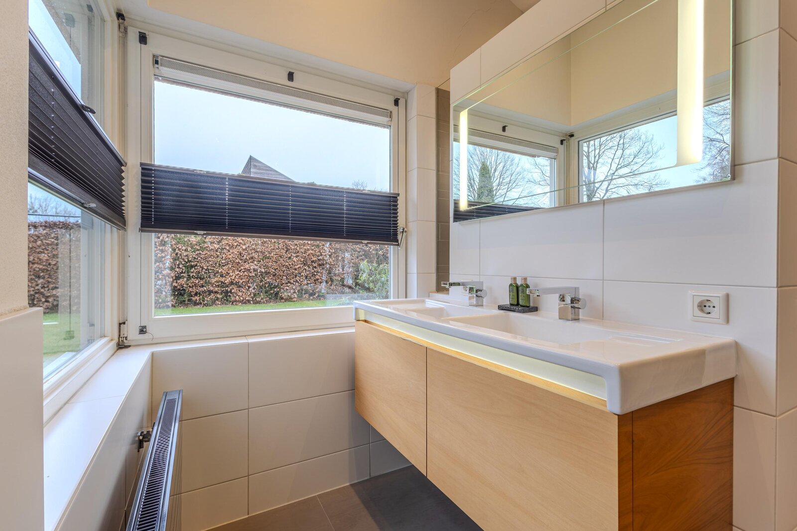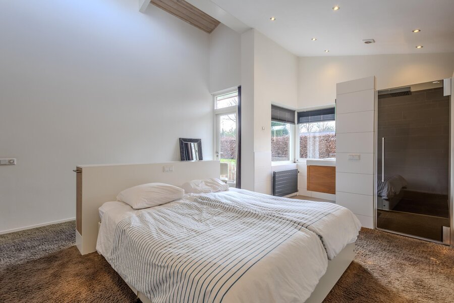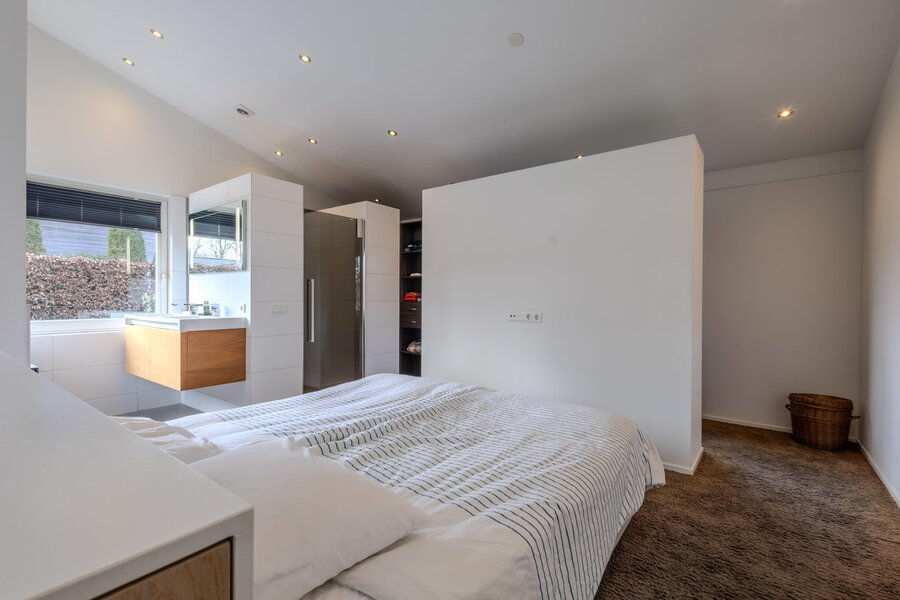 Aan het einde van de verbindingsruimte is de hoofdslaapkamer met eigen badkamer en inloopkast te vinden. Deze hoofdslaapkamer is zeer royaal van formaat en kent een doordachte indeling. Hierdoor is er ruimte voor een tweepersoonsbed tegen een vaste lage wand met geïntegreerde elektrapunten, een verdekt gesitueerde inloopkast én een eigen badkamer. Deze badkamer bestaat uit een luxe inloopdouche en een dubbele wastafel met meubel en spiegelkast. De raampartijen geven uitzicht op de achtertuin en via een loopdeur is direct toegang tot de tuin te krijgen. Ook hier is de hoogte goed zichtbaar.