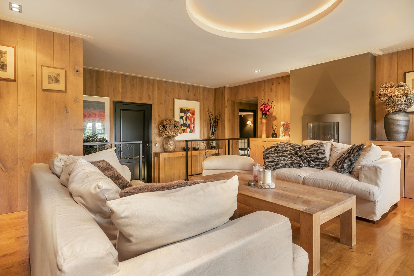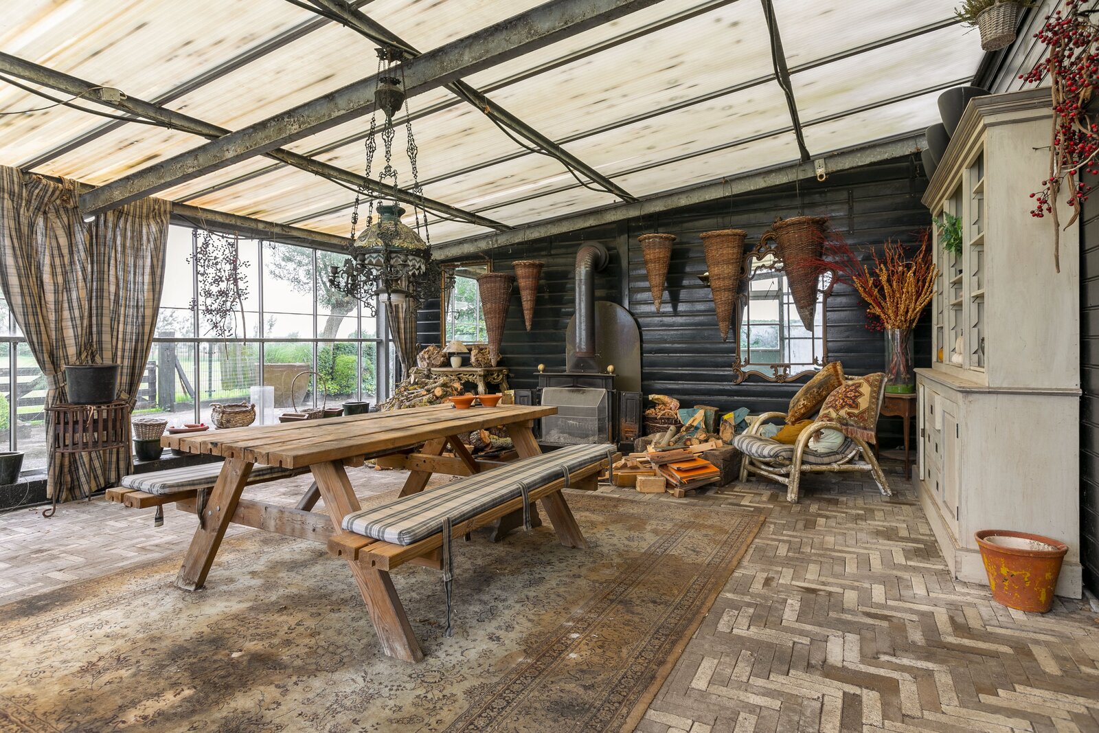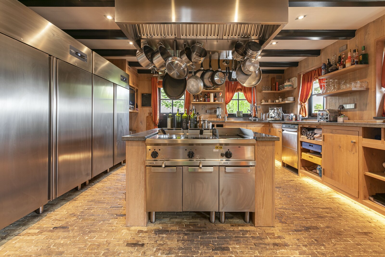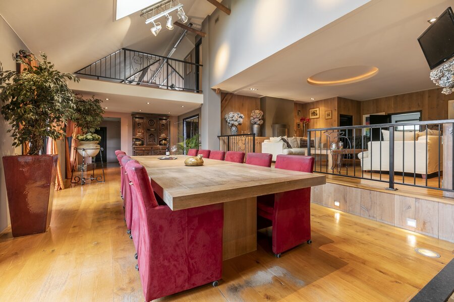 Entree, royale hal voorzien van een fraaie zandstenen sierschouw met gashaard. Trap naar de eerste verdieping en naar de slaapvertrekken en toiletruimte op de begane grond. Via de centrale hal komen we in de royale woonkamer van de stolp. Glazen deuren zijn voorzien van fraaie glasgeslepen voorstellingen. De woonkamer op opgedeeld in een verhoogd zitgedeelte met 2 gashaarden, en een woonkeuken gedeelte. Een lange eettafel siert de ruimte waaraan grote groepen uitgenodigd kunnen worden voor een diner. De vloer van de woonkamer is voorzien van brede Eiken vloerdelen. Via de openslaande deuren is er toegang tot het terras naast de woning. De woonkeuken is voorzien van professionele horeca-apparatuur. De keukenkasten zijn van handgemaakt eiken en afgewerkt met een hardstenen werkblad. De vloer van de keuken en de hal zijn van oude waaltjes. De keuken is voorzien van vloerverwarming. Vanuit het eetgedeelte is er zicht op de hoge nok van de boerderij en de bovengelegen werkkamer, welke in open verbinding staat met het woongedeelte.