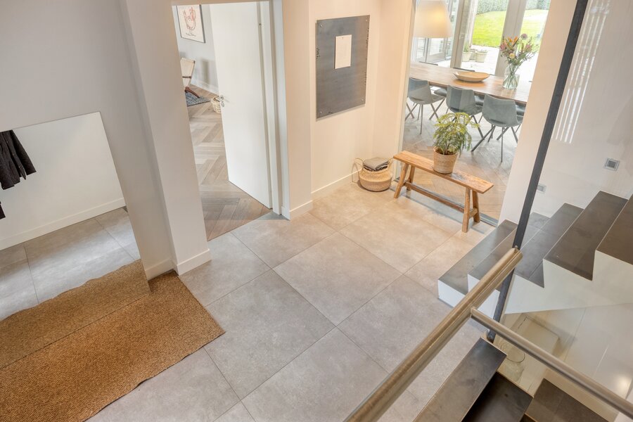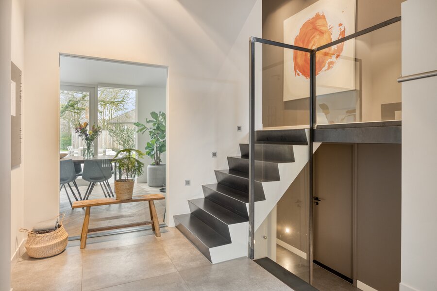 De ontvangsthal met grootformaat tegelvloer zet direct de toon. De lange zichtlijn richting woonkamer en tuin, het oplopende plafond en de split-level trappen zorgen bij binnenkomst voor een speels, ruimtelijk effect. Het daglicht wordt diep de woning in getrokken en laat meteen zien dat architectuur en detaillering hier goed zijn uitgedacht.