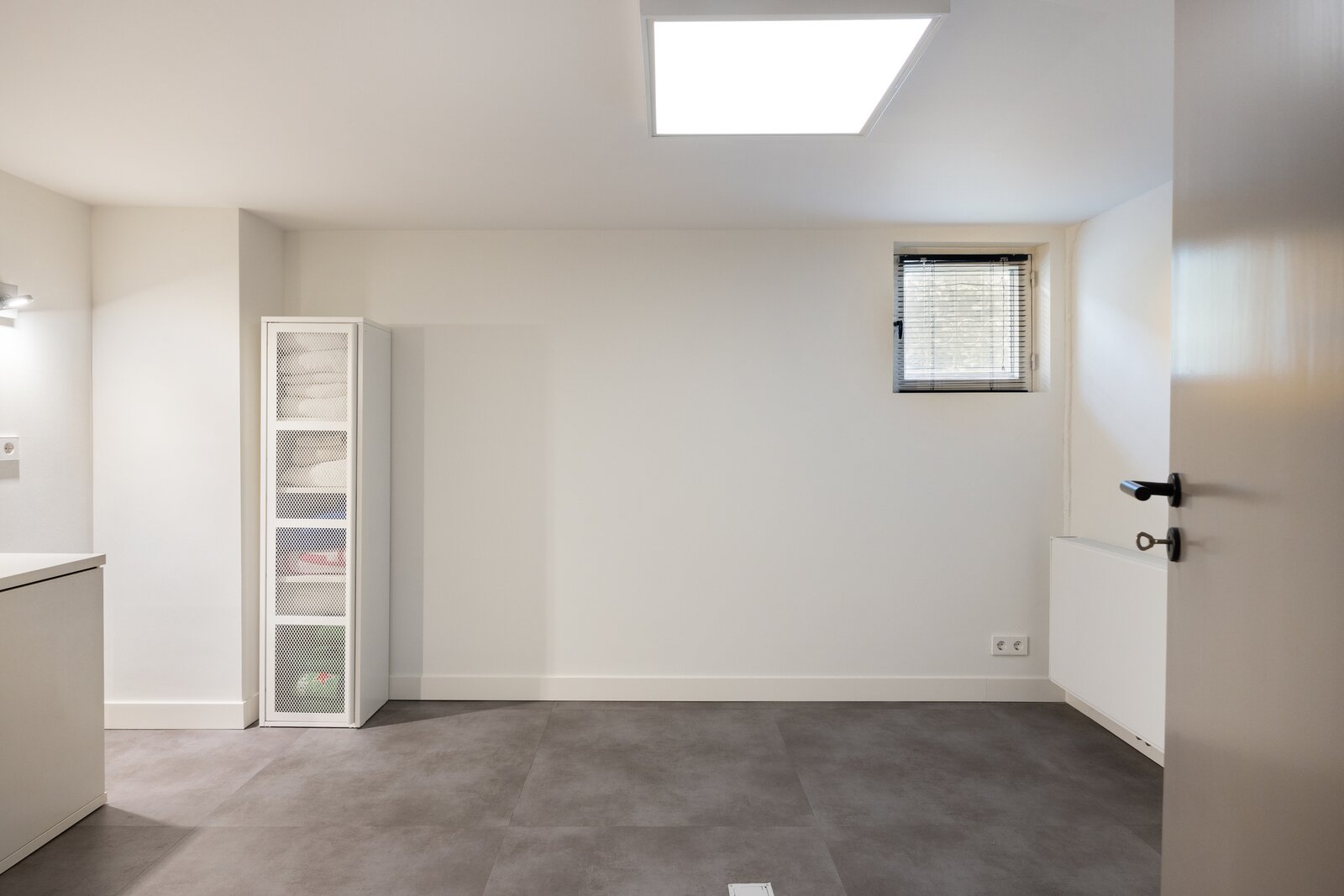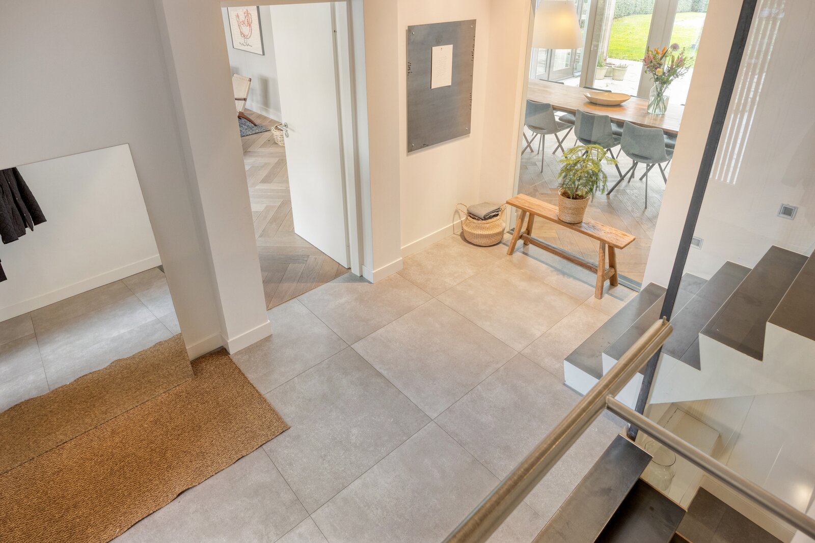 Via een korte trap in de hal is het souterrain bereikbaar. De hal met grootformaat tegelvloer en subtiele wandverlichting vormt een stijlvolle overgang naar het lagere niveau.
