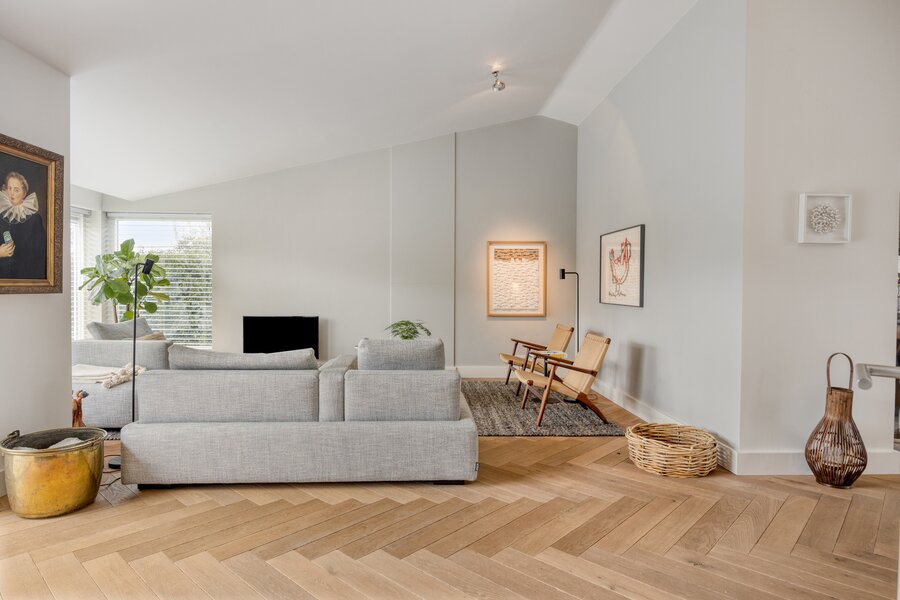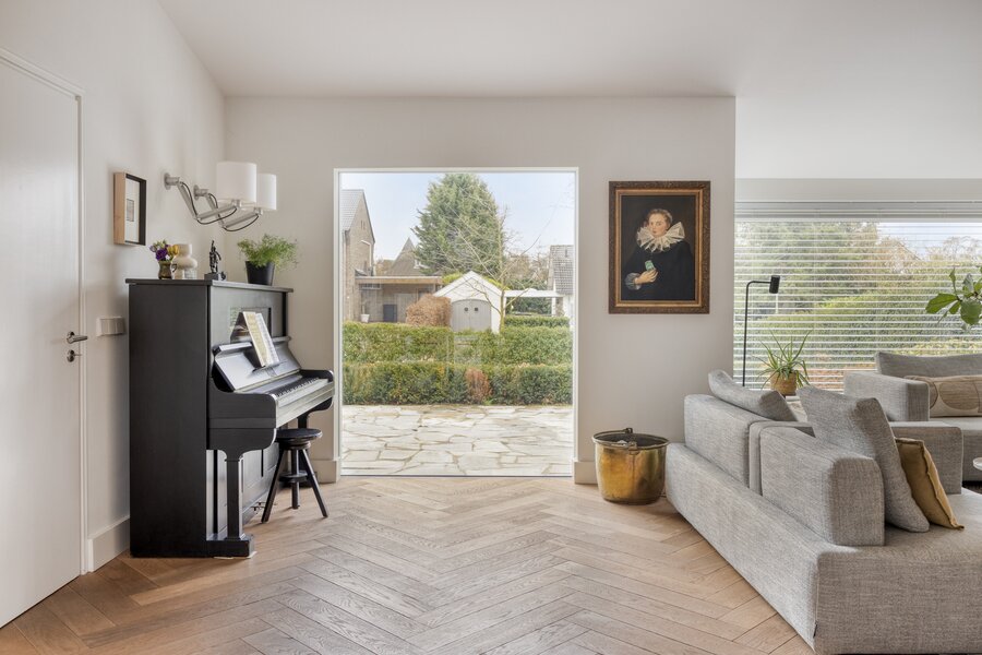 De woonkamer is zonder twijfel een eyecatcher. Overvloedig daglicht, indrukwekkende doorkijken en het oplopende dak geven de ruimte een krachtige en tegelijkertijd verfijnde en warme uitstraling. De massieve visgraat parketvloer vormt een warm contrast met de strak gestucte wanden en plafonds. Subtiel in de muren verwerkte ramen aan voor- en achterzijde versterken het minimalistische lijnenspel en onderstrepen het hoge afwerkingsniveau.