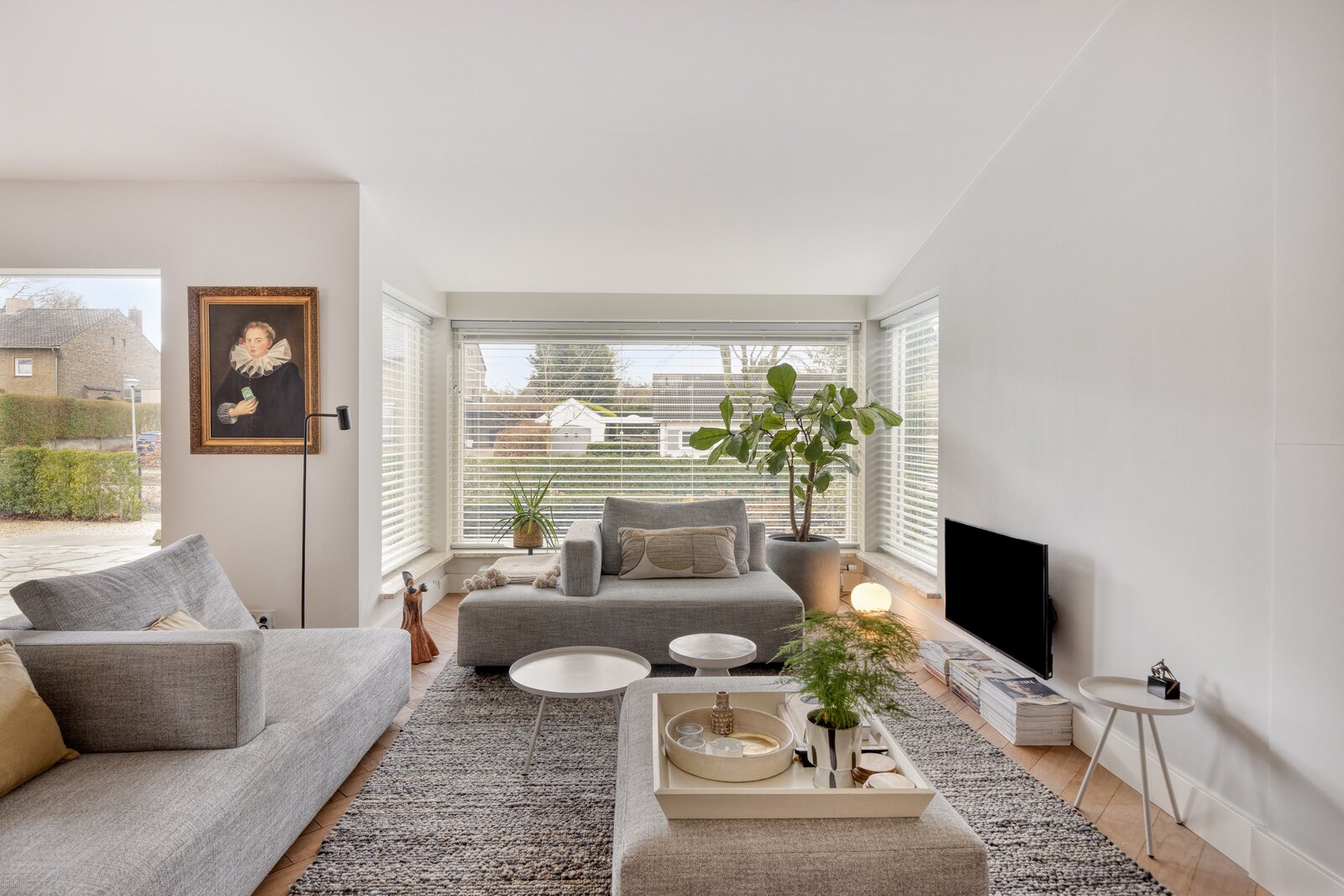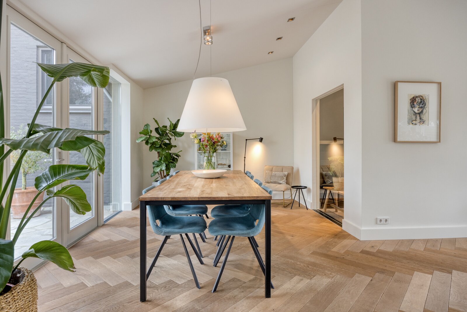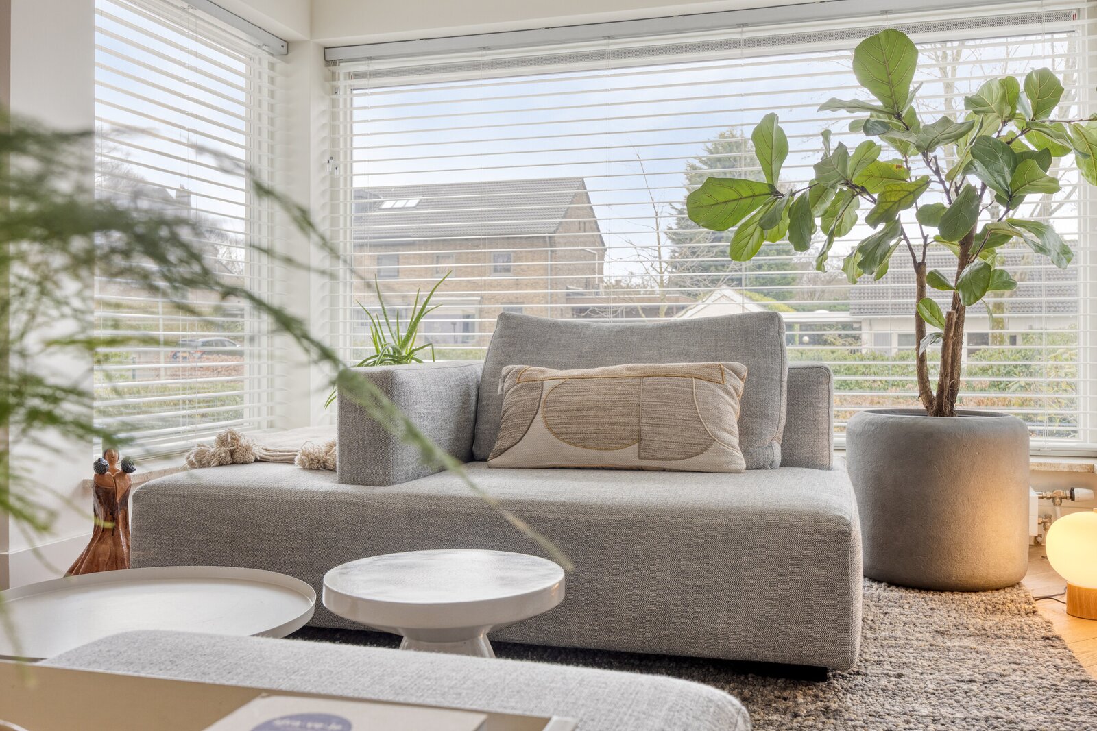 De erkervormige zithoek creëert een fijne plek binnen het open geheel. Hoge plinten, geïntegreerde spots en zorgvuldig gekozen materialen zorgen voor een afwerking die tot op detailniveau klopt.