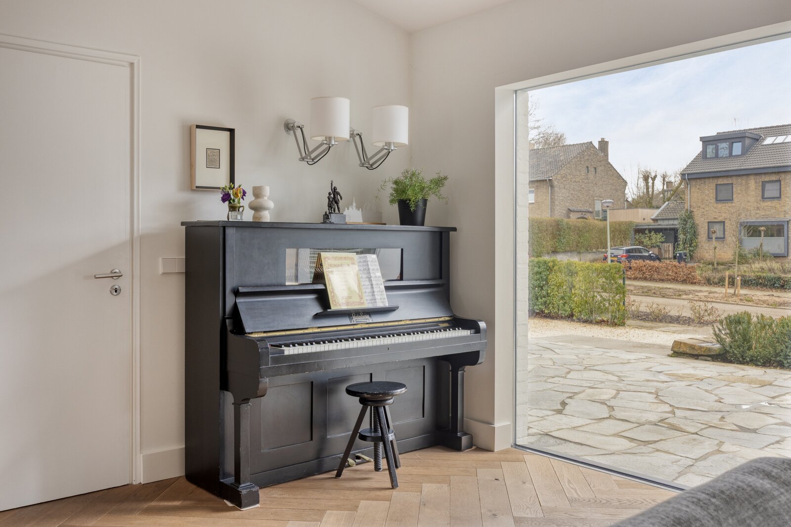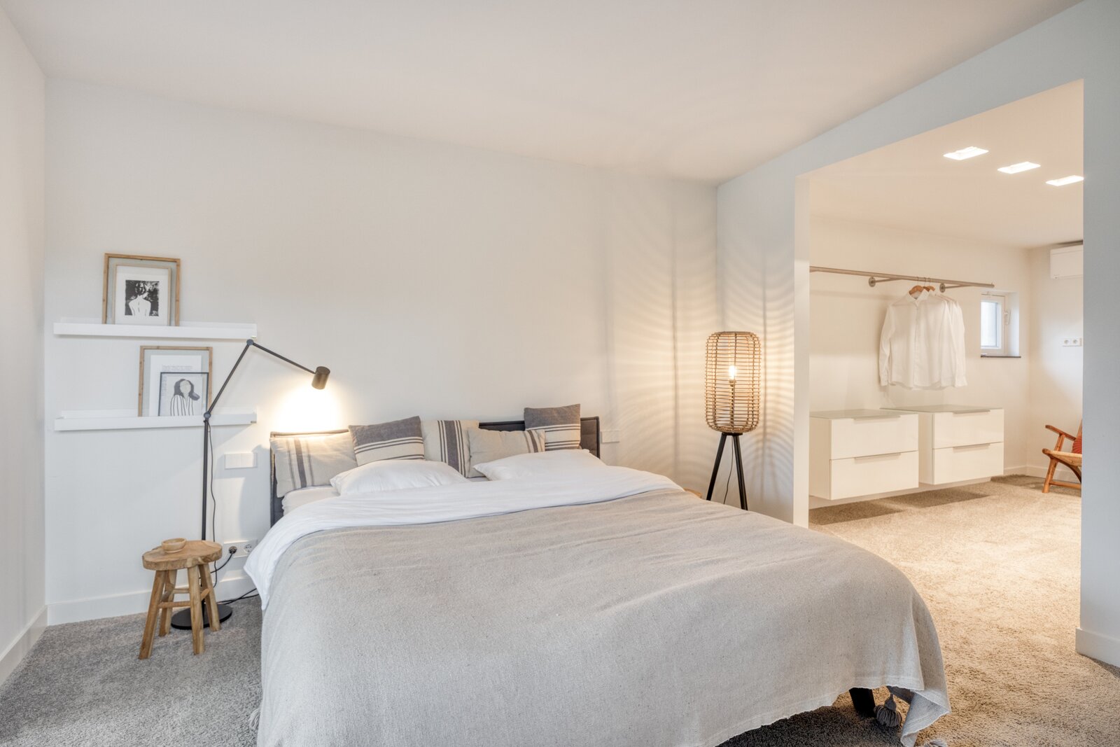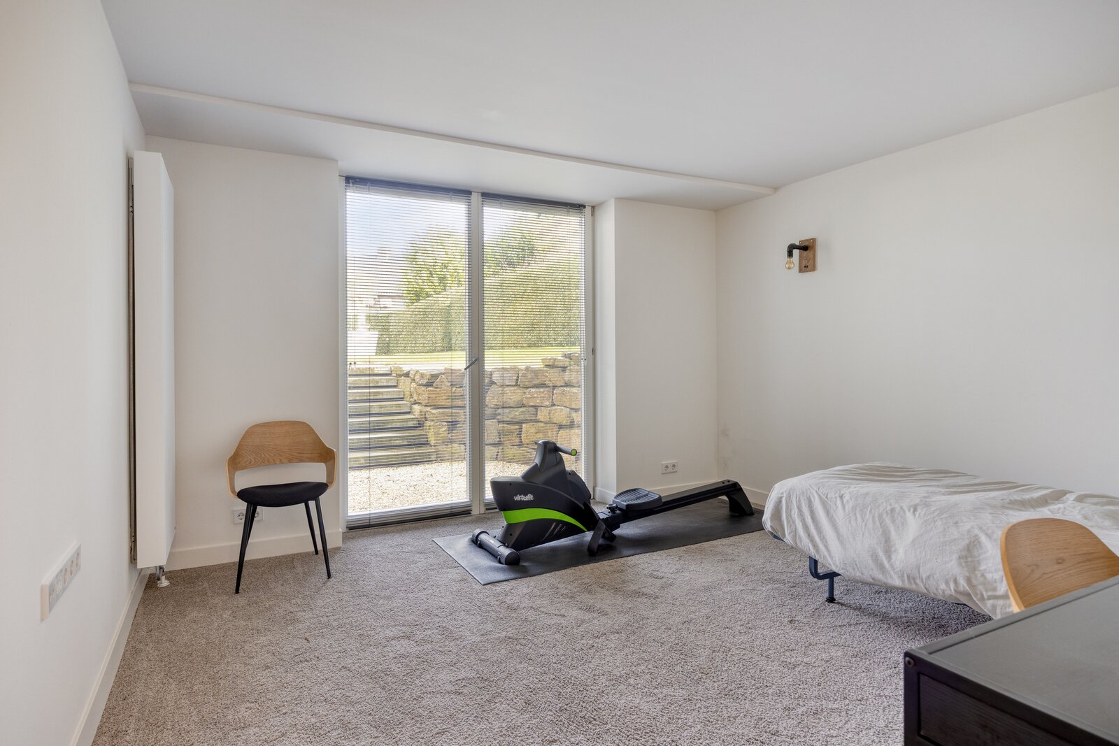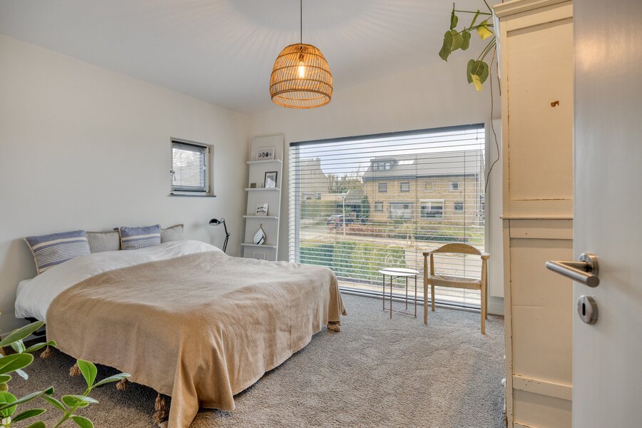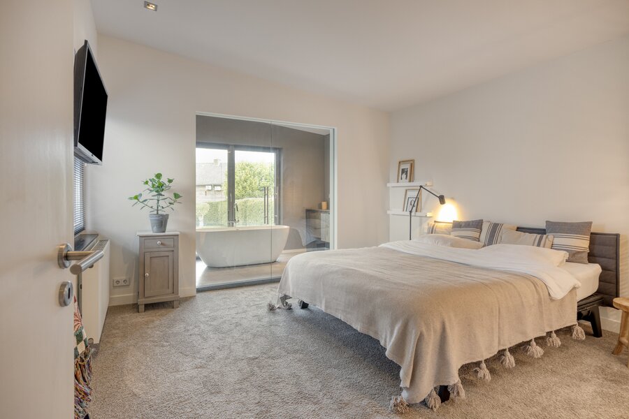 De slaapkamer is strak afgewerkt met gestucte wanden en een warme tapijtvloer. Dankzij de raampartij ontstaat een diepe doorkijk richting de tuin en valt het daglicht rijkelijk binnen. Het directe tuincontact met openslaande deuren en de volledige privacy maken dit een unieke en serene plek binnen de woning, compleet met een eigen badkamer.