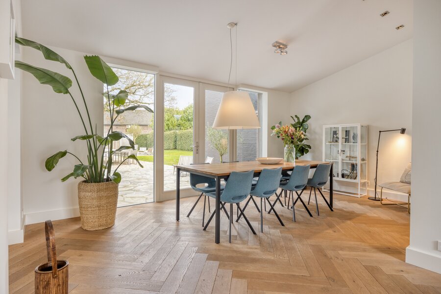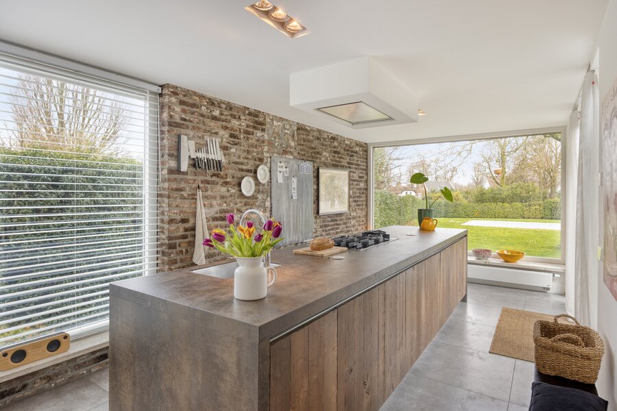 De leefkeuken is halfopen maar voelt als een aparte ruimte. Het royale eiland met keramisch werkblad en massief houten fronten combineert robuustheid met elegantie. De diepe doorkijk richting tuin en zwembad zorgt voor een continue verbinding tussen binnen en buiten. Grote raampartijen en openslaande deuren laten het daglicht binnenstromen en zorgen voor een vloeiende overgang naar het terras. De keuken is uitgerust met een 4-pits gaskookplaat met wokbrander, een Quooker, geïntegreerde elektrapunten en barfunctie. Een heerlijke plek om te koken of te ontbijten. De keuken is voorzien van een vaatwasser (2024), afzuigkap (2024), ovens (2020) en ruime ingebouwde koelkast en diepvries (2015). Alle apparatuur is in uitstekende staat.