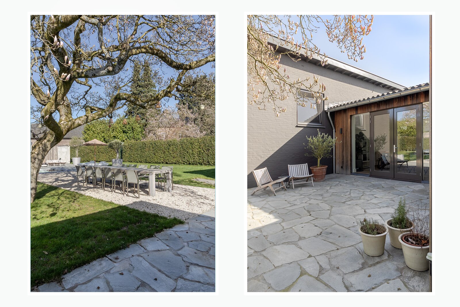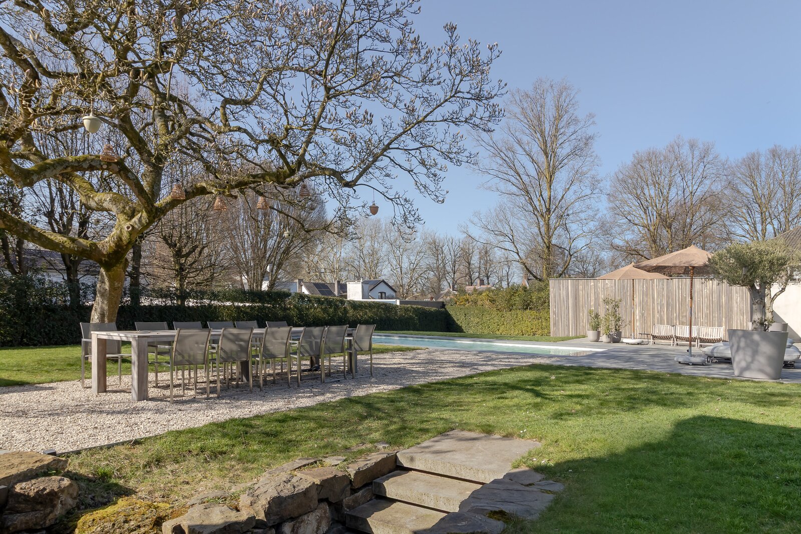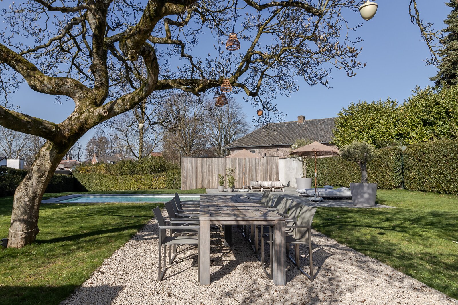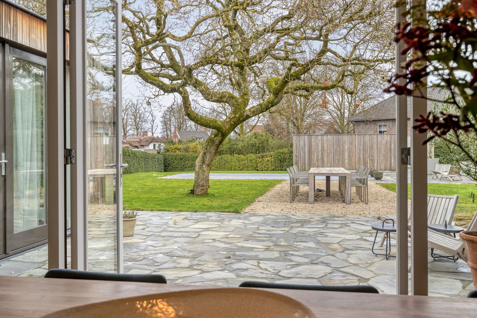 De grote, karaktervolle boom vormt het natuurlijke middelpunt van de tuin en zorgt voor sfeer en schaduw. Onder de boom staat een eettafel (12 personen) op een grindplateau – een plek die uitnodigt tot lange avonden tafelen.
