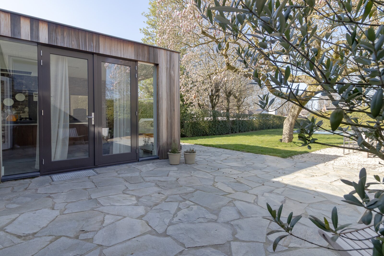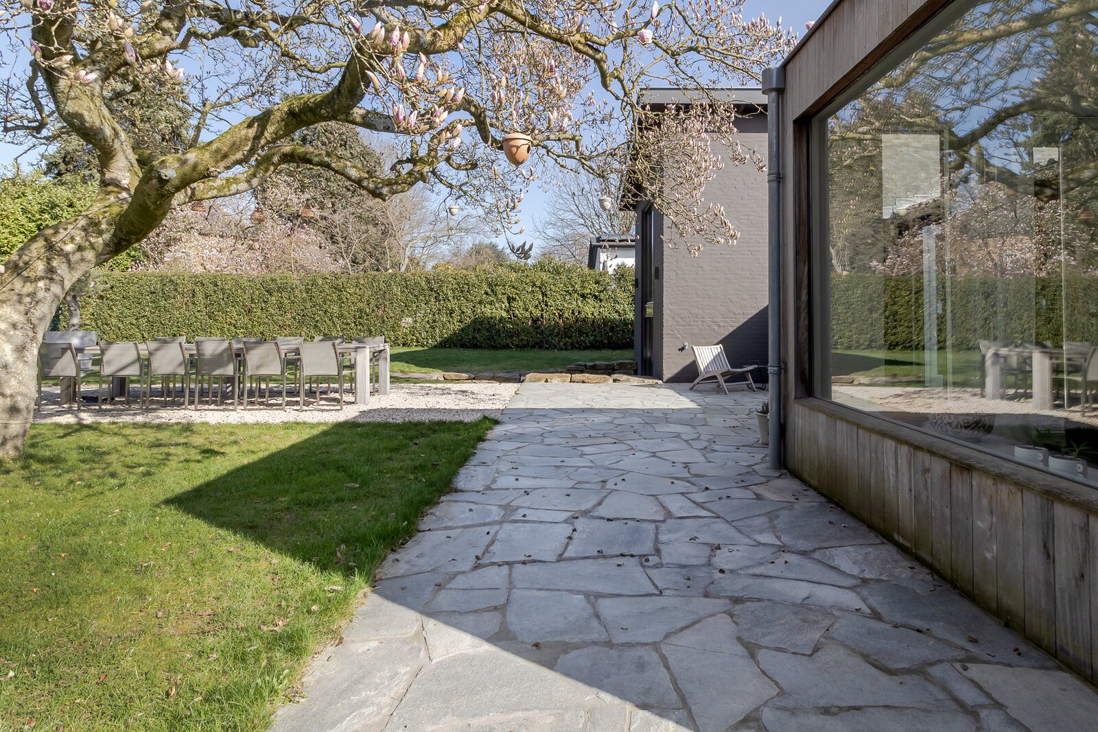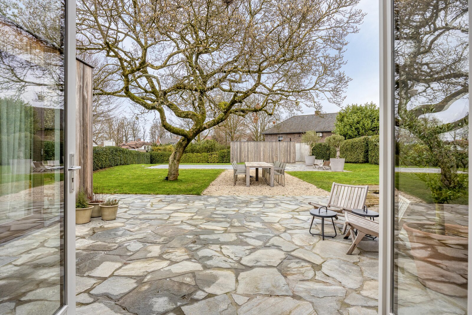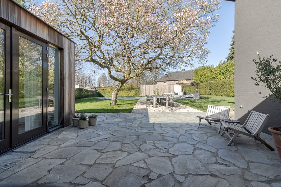 De achtertuin is volledig omsloten door volwassen hagen en biedt maximale beschutting. Vanuit vrijwel iedere ruimte in de woning ontstaan diepe doorkijken naar het groen, waardoor binnen en buiten met elkaar verbonden voelen. Direct aan de woning ligt een royaal natuurstenen terras dat naadloos overgaat in het gazon.