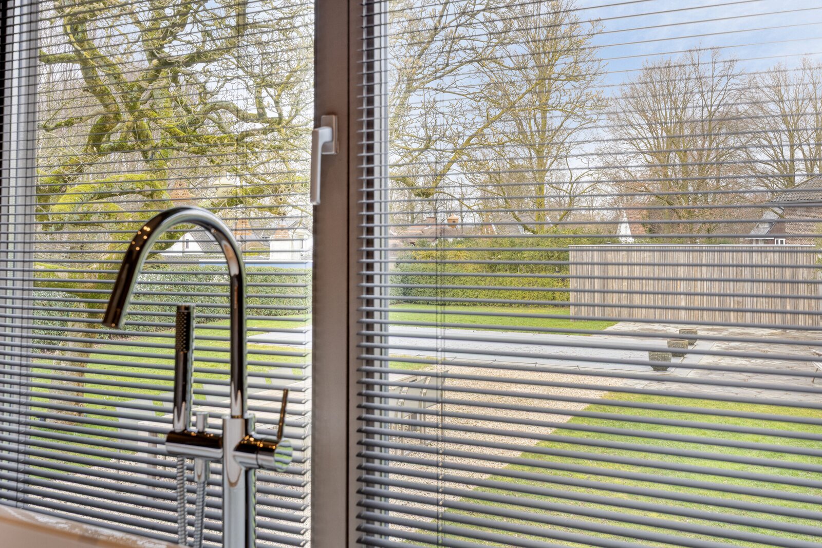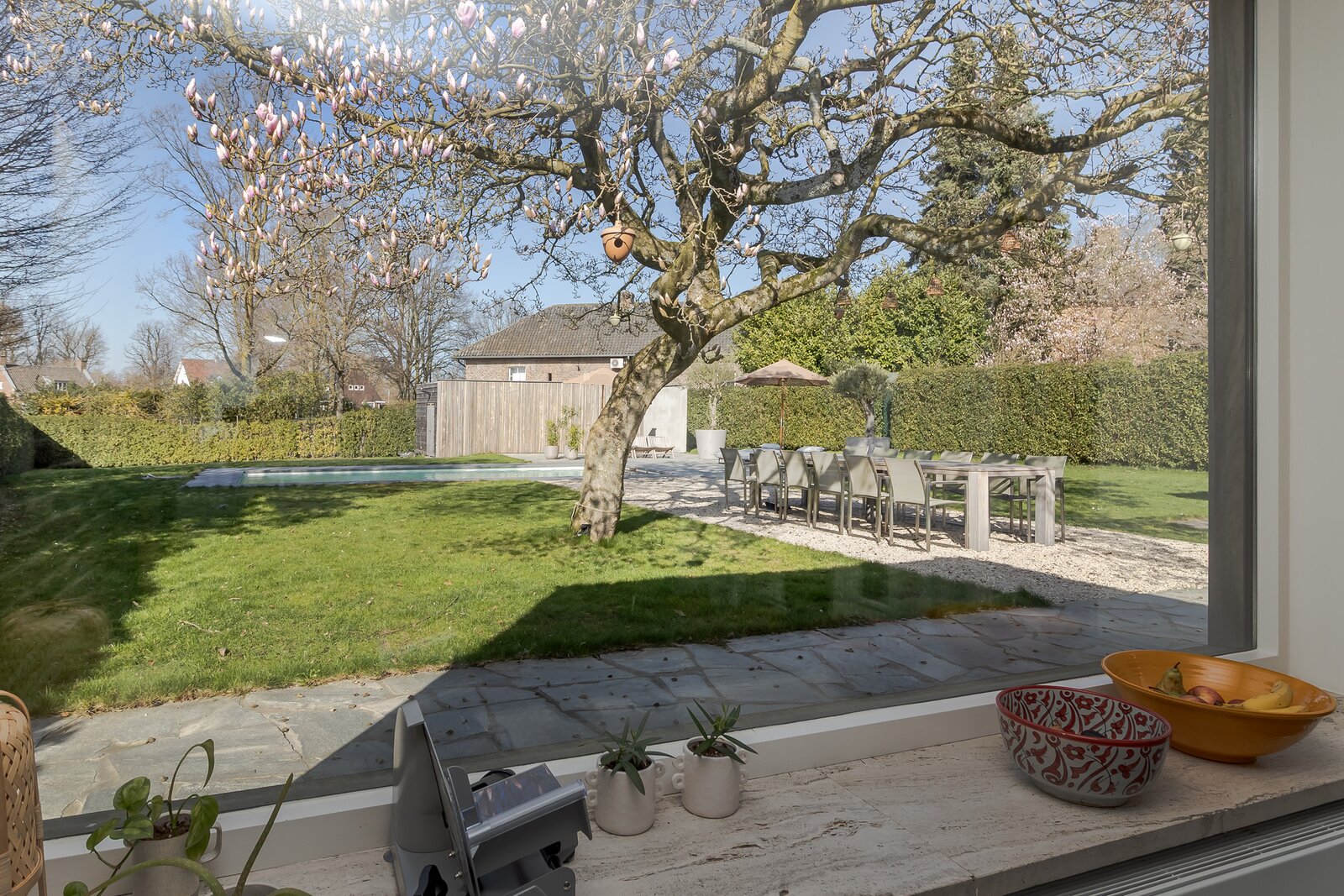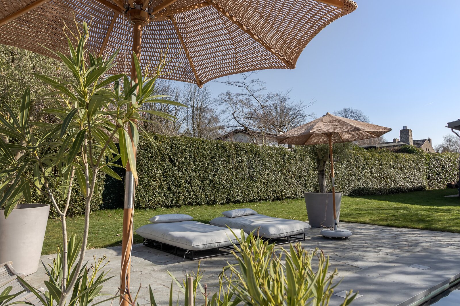 De achtertuin is volledig omsloten door volwassen hagen en biedt maximale beschutting. Vanuit vrijwel iedere ruimte in de woning ontstaan diepe doorkijken naar het groen, waardoor binnen en buiten met elkaar verbonden voelen. Direct aan de woning ligt een royaal natuurstenen terras dat naadloos overgaat in het gazon.