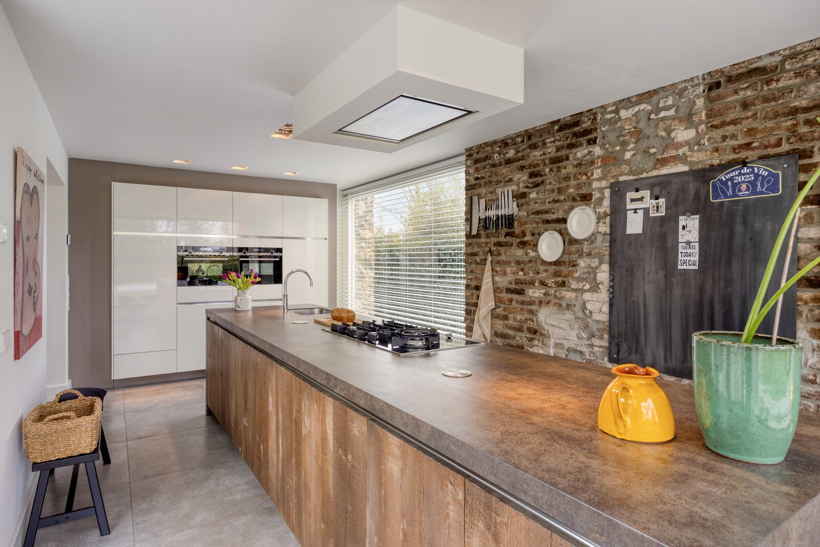 De originele gemetselde wand voegt karakter toe, terwijl verlichting en plafondafzuiging strak zijn geïntegreerd.