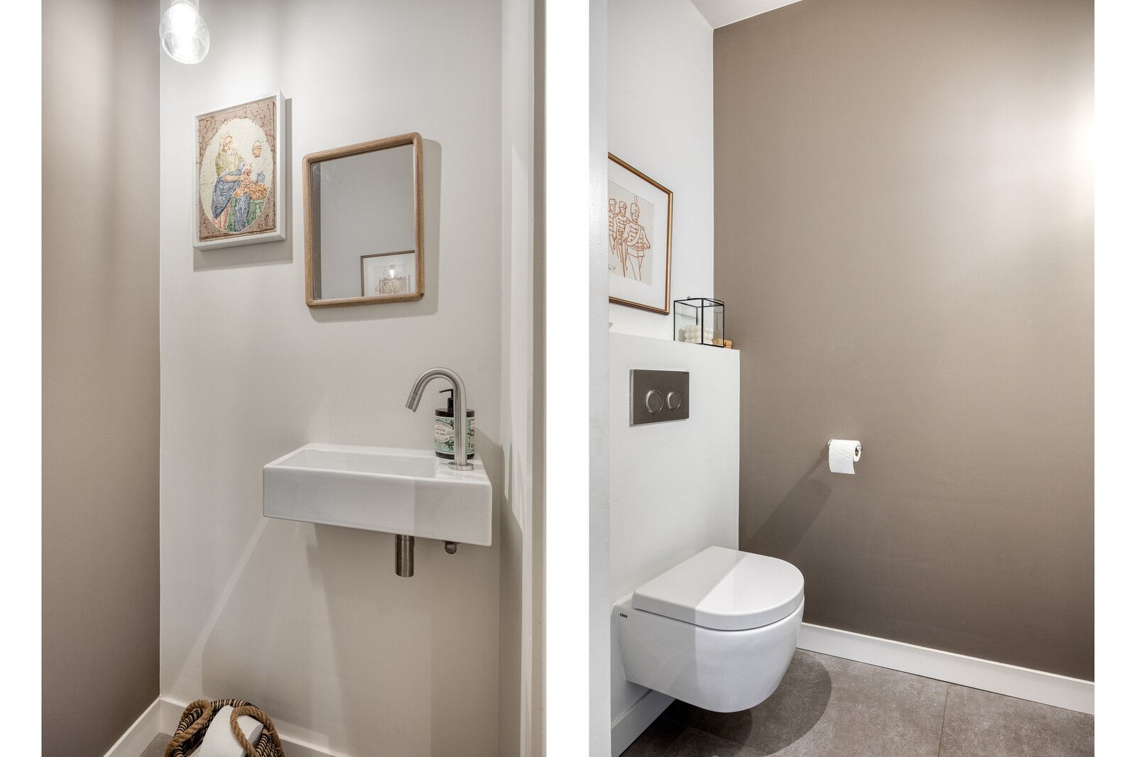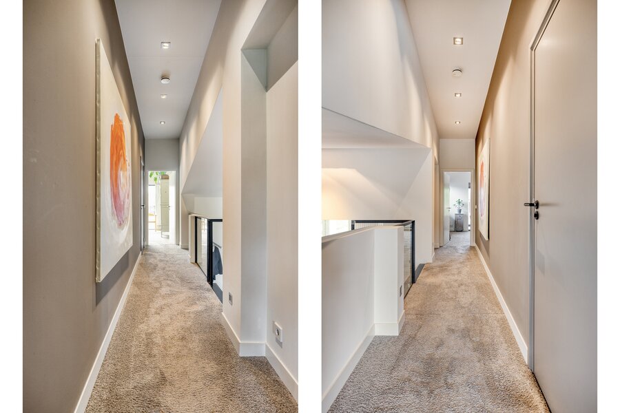 De overloop is belegd met hetzelfde tapijt en heeft via de vide een open verbinding met de hal beneden, waardoor licht en ruimte zich verticaal door de woning bewegen. Hier bevindt zich tevens het moderne gastentoilet met fonteintje en mechanische ventilatie.