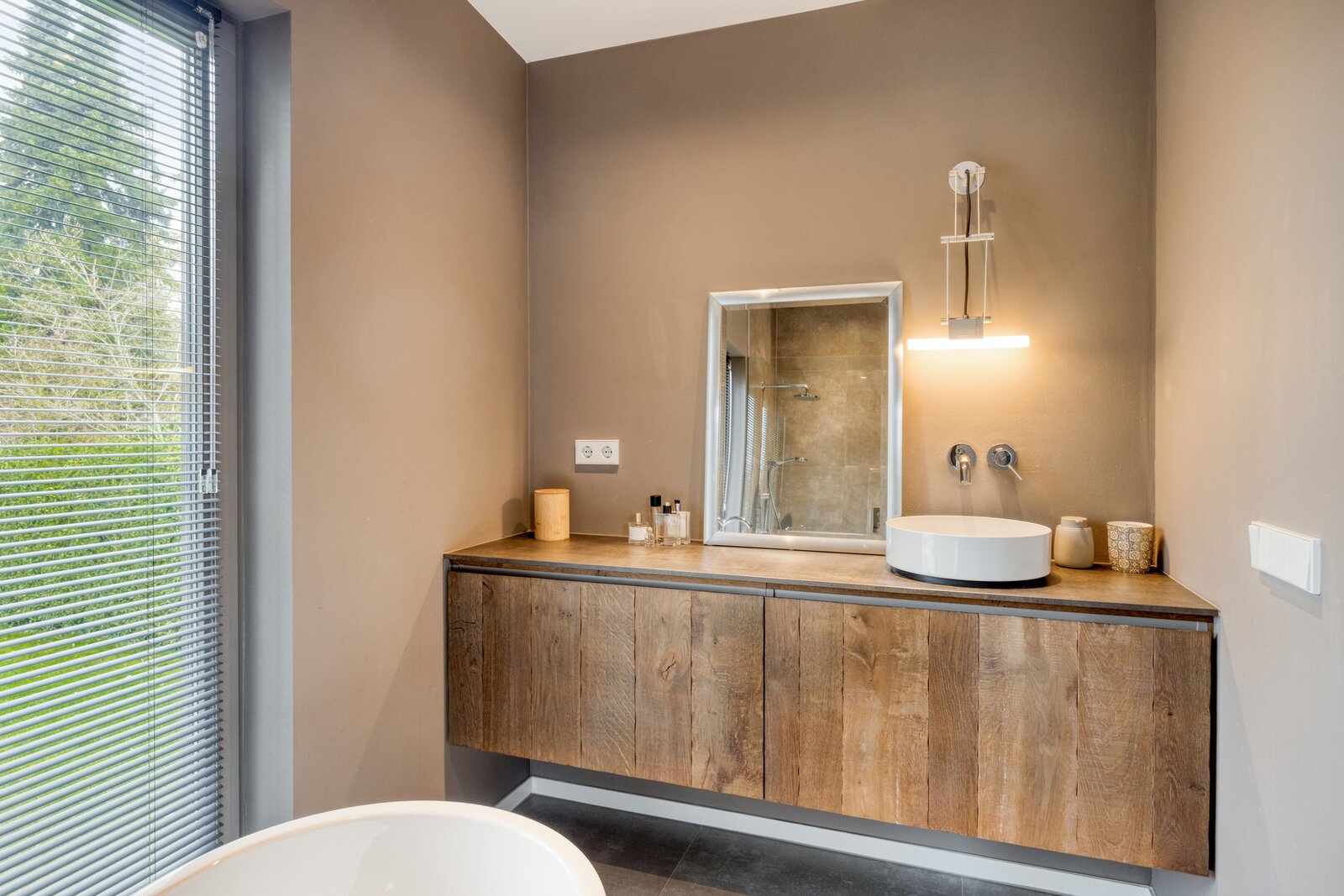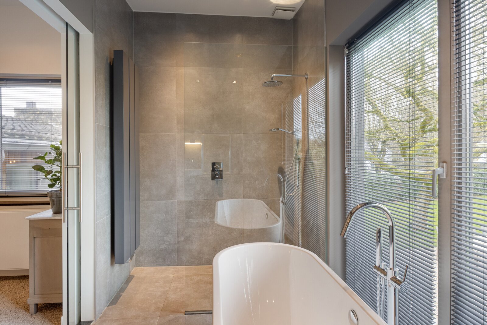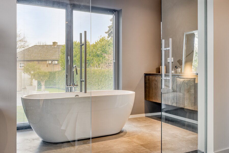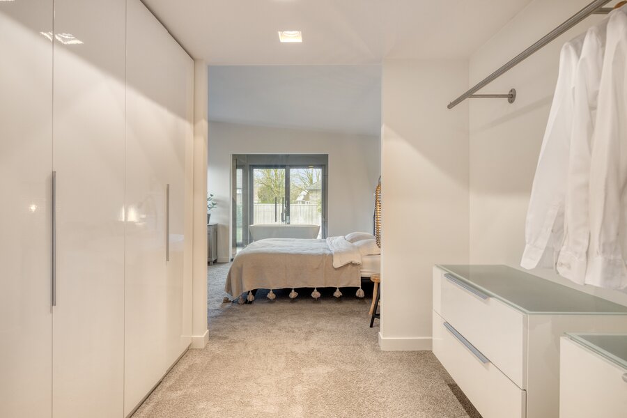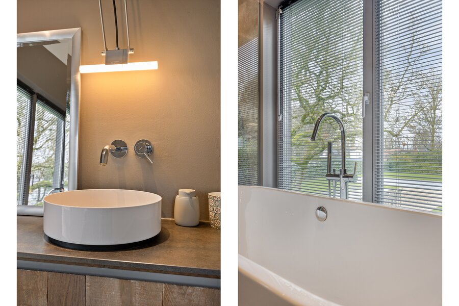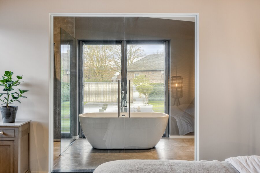 De en-suite badkamer biedt een hotelbeleving. Het vrijstaand bad staat centraal voor het raam met zicht op het groen. De royale inloopdouche met transparante glaswand, het massief houten wandmeubel en de moderne wastafel zorgen voor een harmonieus en hoogwaardig geheel. Vanuit de inloopkast loopt de zichtlijn diep door naar buiten, wat het gevoel van openheid versterkt terwijl volledige privacy behouden blijft.