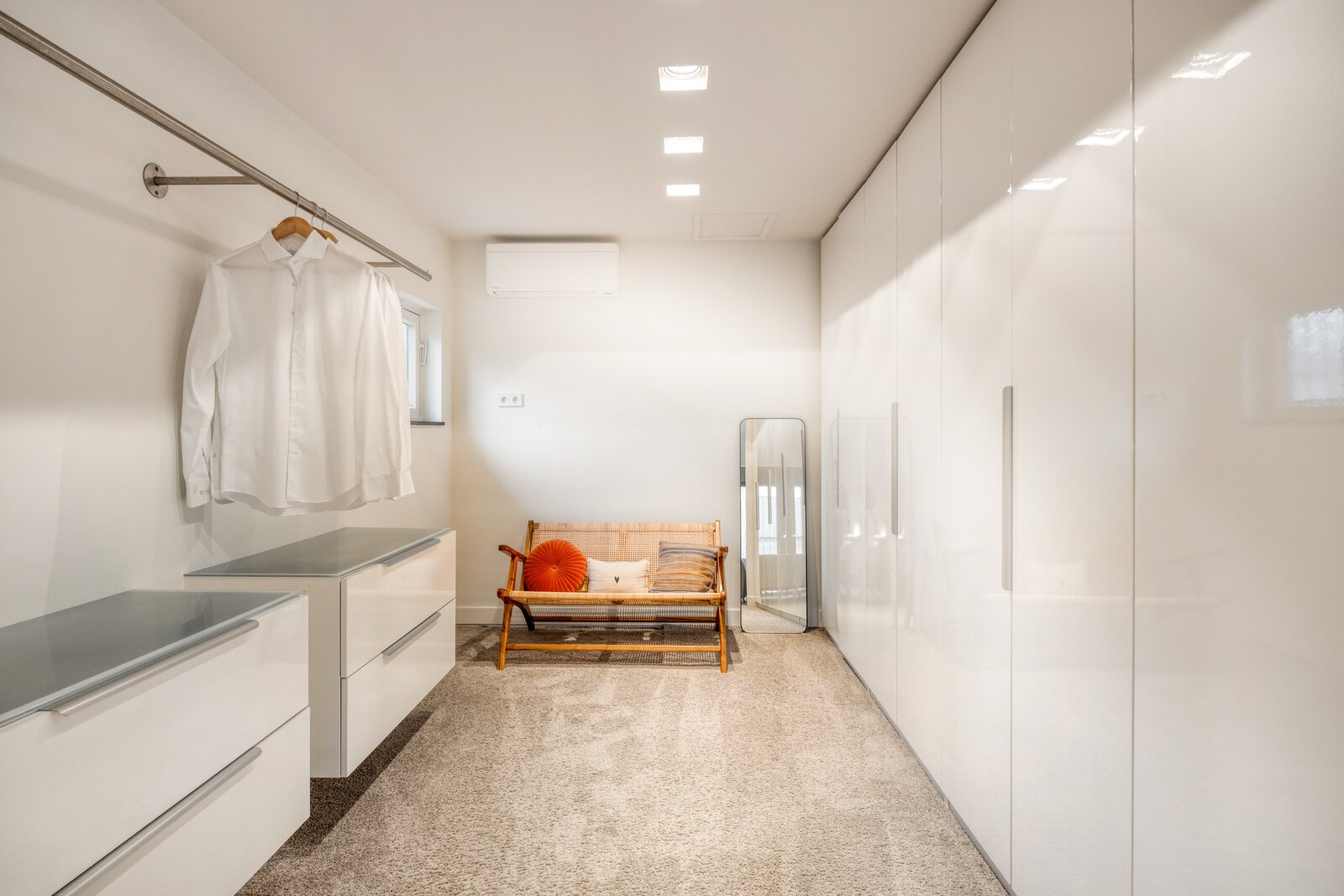 Aan de voorzijde ligt de derde slaapkamer, eveneens voorzien van tapijt en airconditioning. Grote raampartijen zorgen voor prachtig daglicht en uitzicht op de voortuin en straatzijde. Strak gestucte wanden, een schuin plafond met geïntegreerde spots en subtiel weggewerkte kozijnen benadrukken ook in deze ruimte de hoogwaardige afwerking.