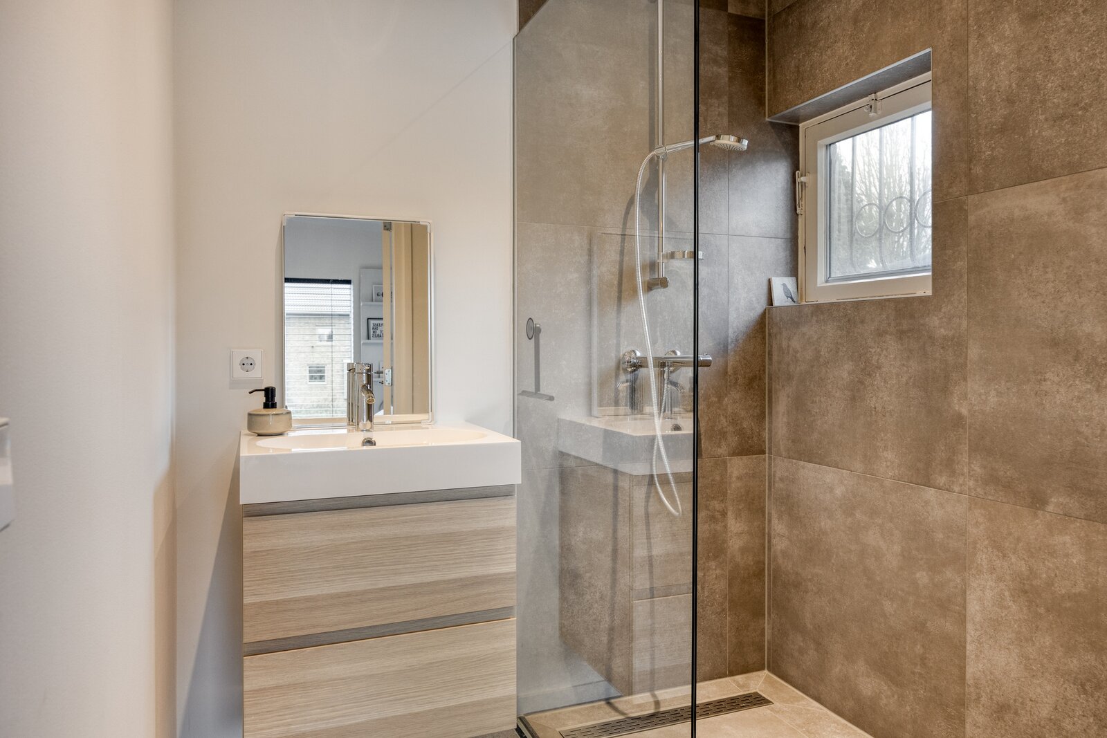 Deze slaapkamer beschikt over een eigen badkamer in dezelfde moderne stijl, voorzien van wastafelmeubel, inloopdouche, designradiator en mechanische ventilatie. Een volwaardige en comfortabele tweede badruimte, met dezelfde aandacht voor detail.