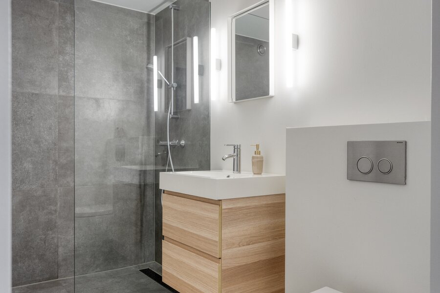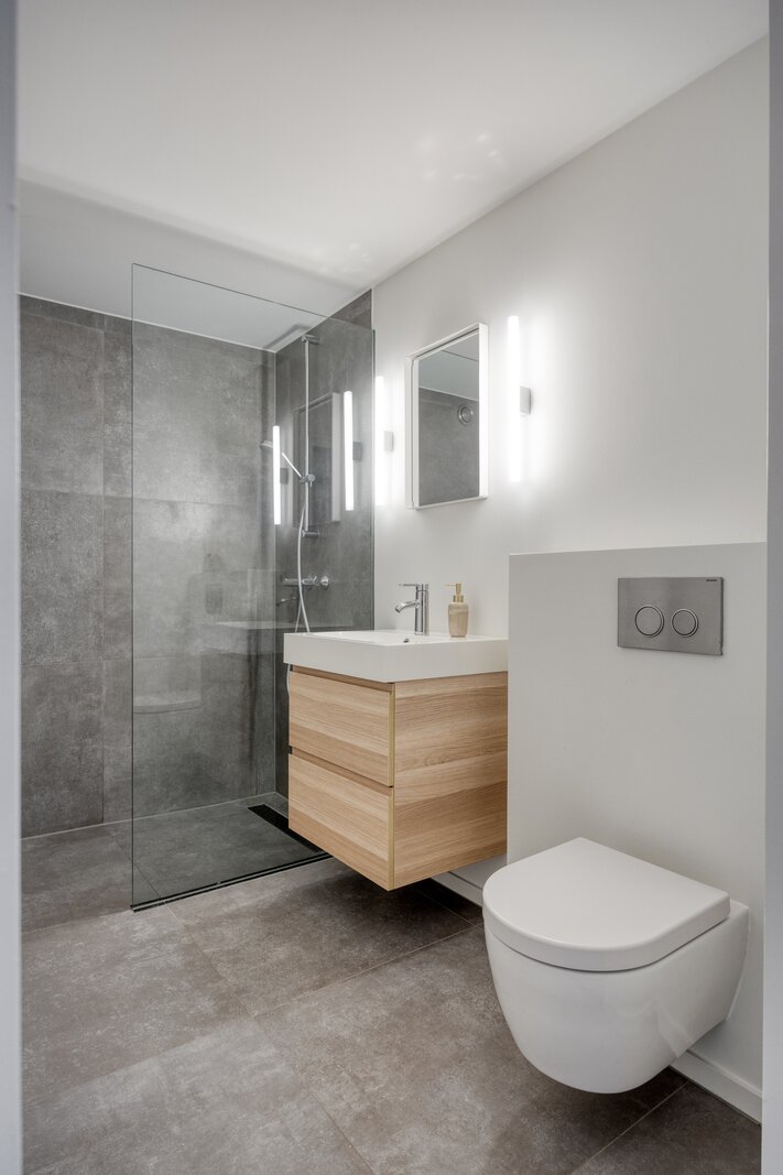 De moderne badkamer is voorzien van een inloopdouche, wastafelmeubel, zwevend toilet en mechanische ventilatie.