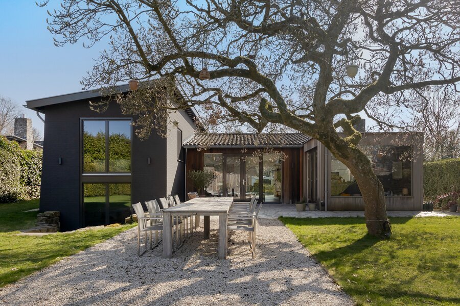 Aan de voorzijde beschikt de woning over een ruime voortuin met oprit voor meerdere auto’s en achterom via een stenen strap. De moderne, unieke architectuur met donkere gevel, houtaccenten en grote raampartijen sluit prachtig aan bij het groene karakter van de omgeving.