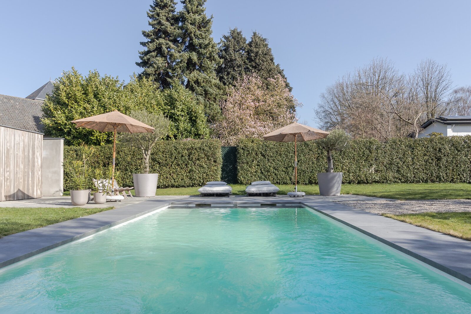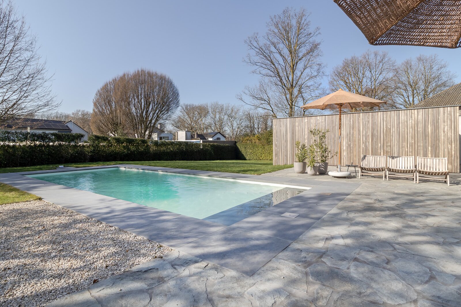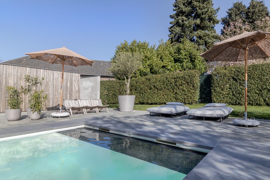 Het (verwarmde) buitenzwembad is stijlvol geïntegreerd in het geheel en omringd door een ruim zonneterras in natuursteen. De houten wand van het tuinhuis biedt beschutting en versterkt het resortgevoel. Het zwembad is uitgerust met een warmtepomp en in de separate berging bevinden zich een extra groepenkast en alle zwembadinstallaties. De berging biedt veel opbergruimte. De andere zijde van het tuinhuis achter de houten wand is een halfopen inloopruimte met daarin voorbereidingen voor toilet en douche. Dit kan eenvoudig worden afgewerkt tot een poolhouse. Dak en wanden zijn volledig afgewerkt.